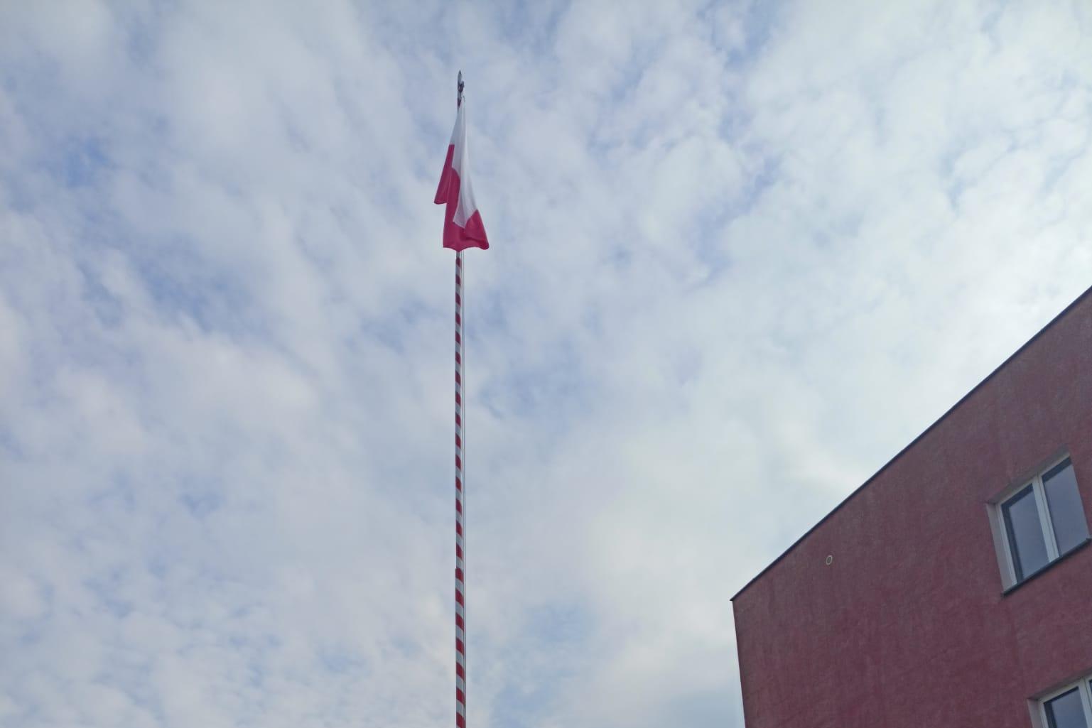 Flaga zawisła na maszcie z okazji Dnia Flagi Rzeczpospolitej Polskiej.