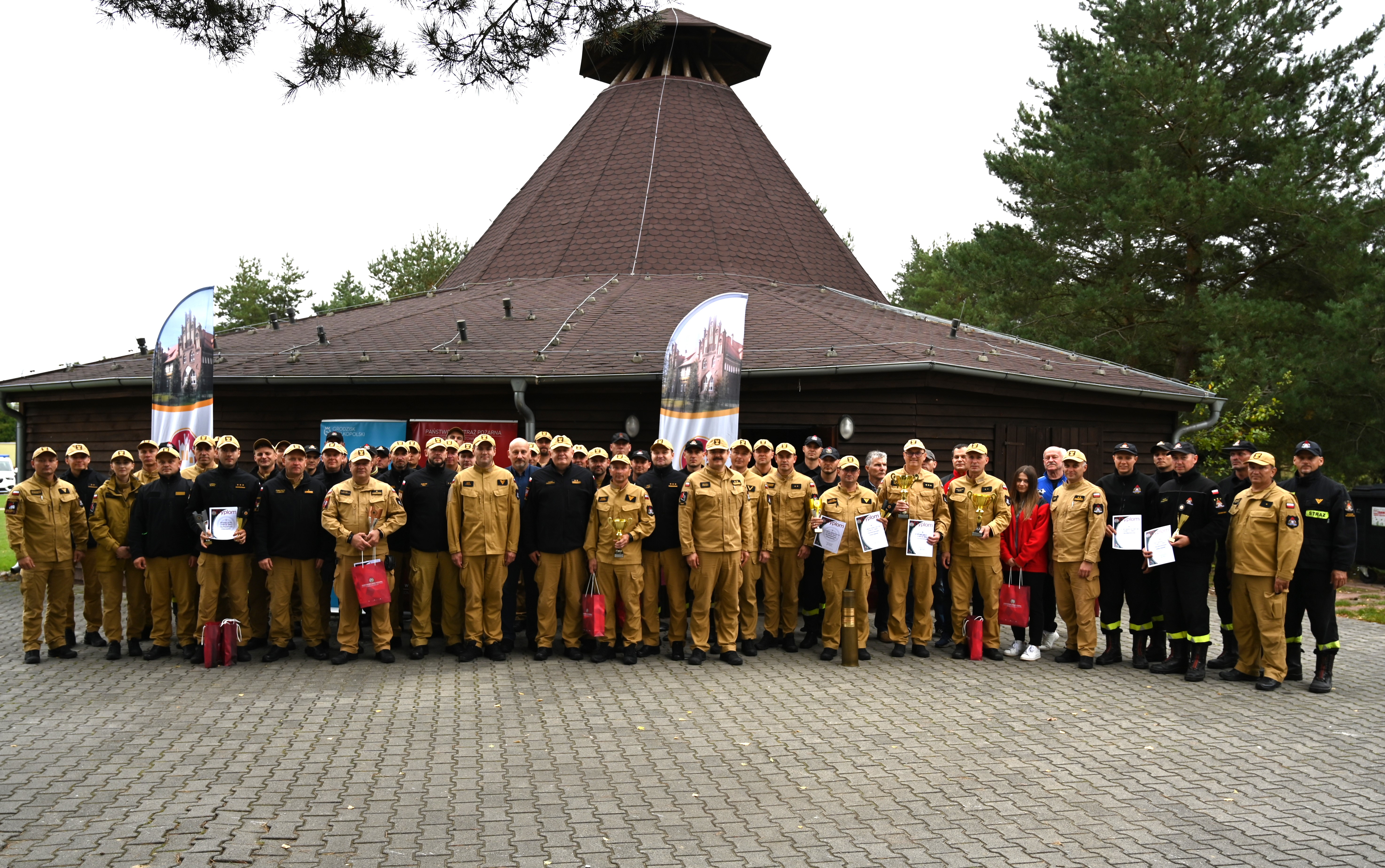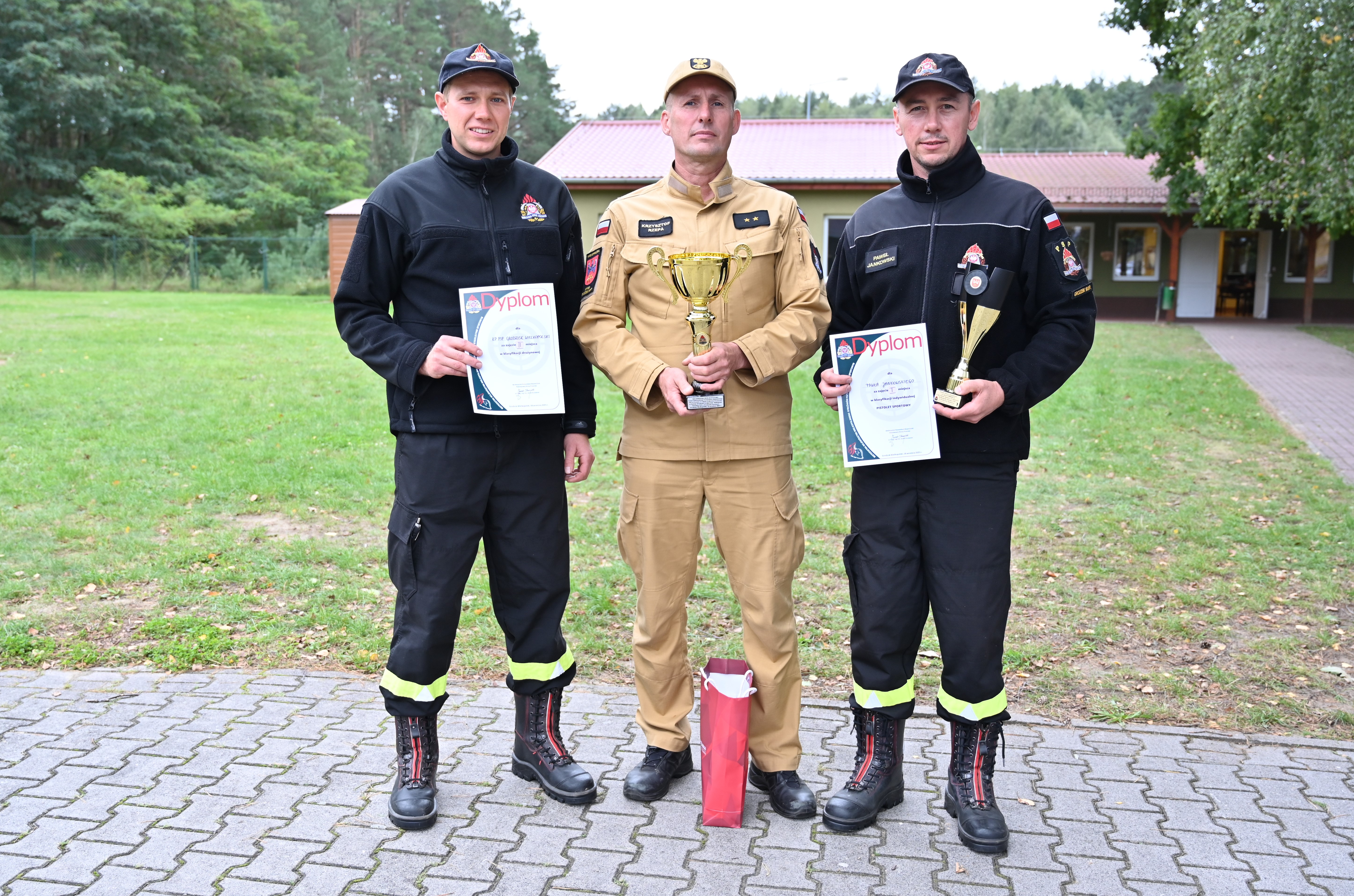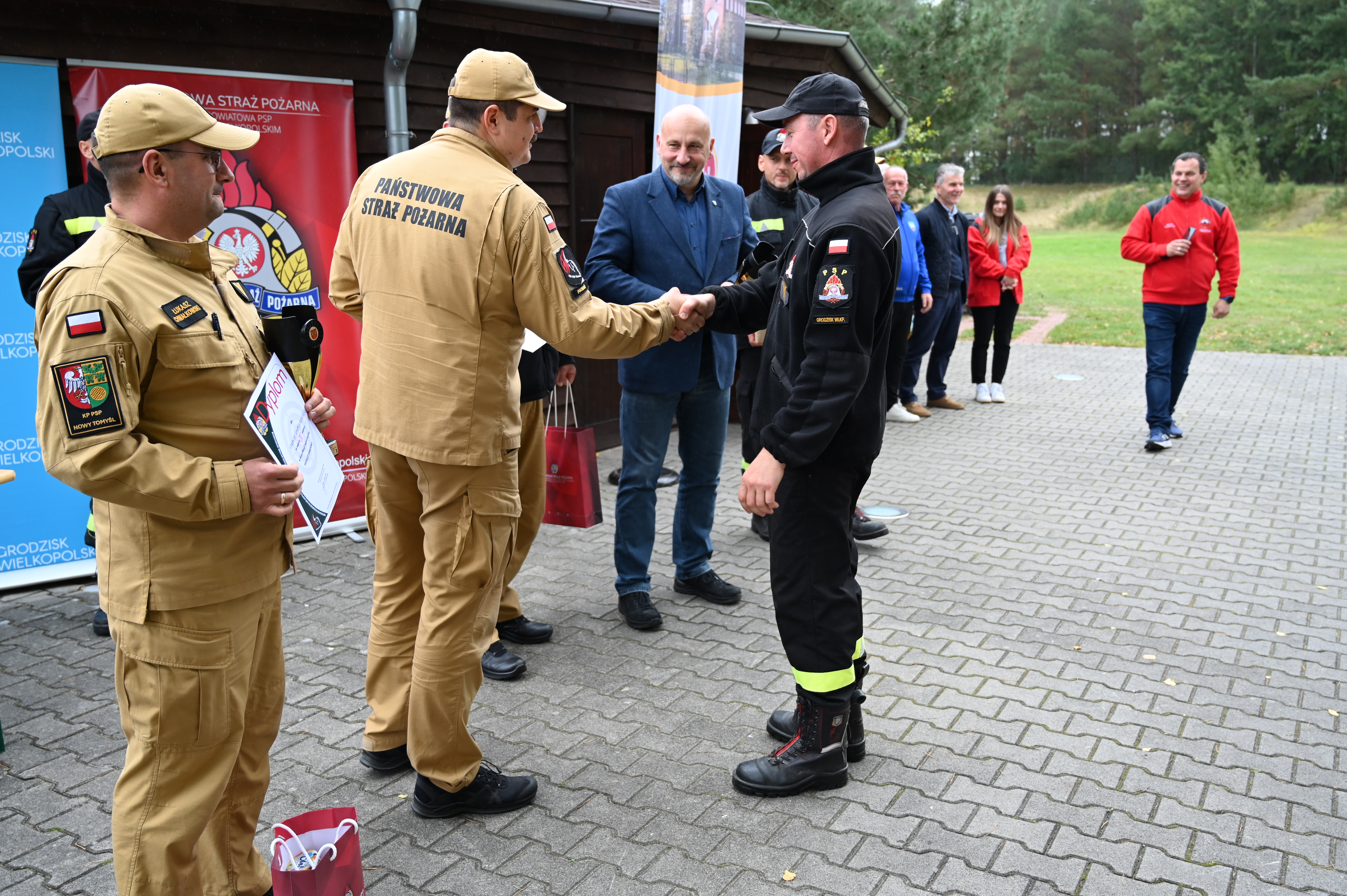 Nagrody, puchary oraz okolicznościowe dyplomy wręczyli : Naczelnik Ośrodka Szkolenia KW PSP w Poznaniu- bryg. Michał Kierzek, Burmistrz Grodziska Wielkopolskiego - Piotr Hojan, Komendant Powiatowy PSP w Grodzisku Wlkp. - bryg. Tomasz Lewandowski .