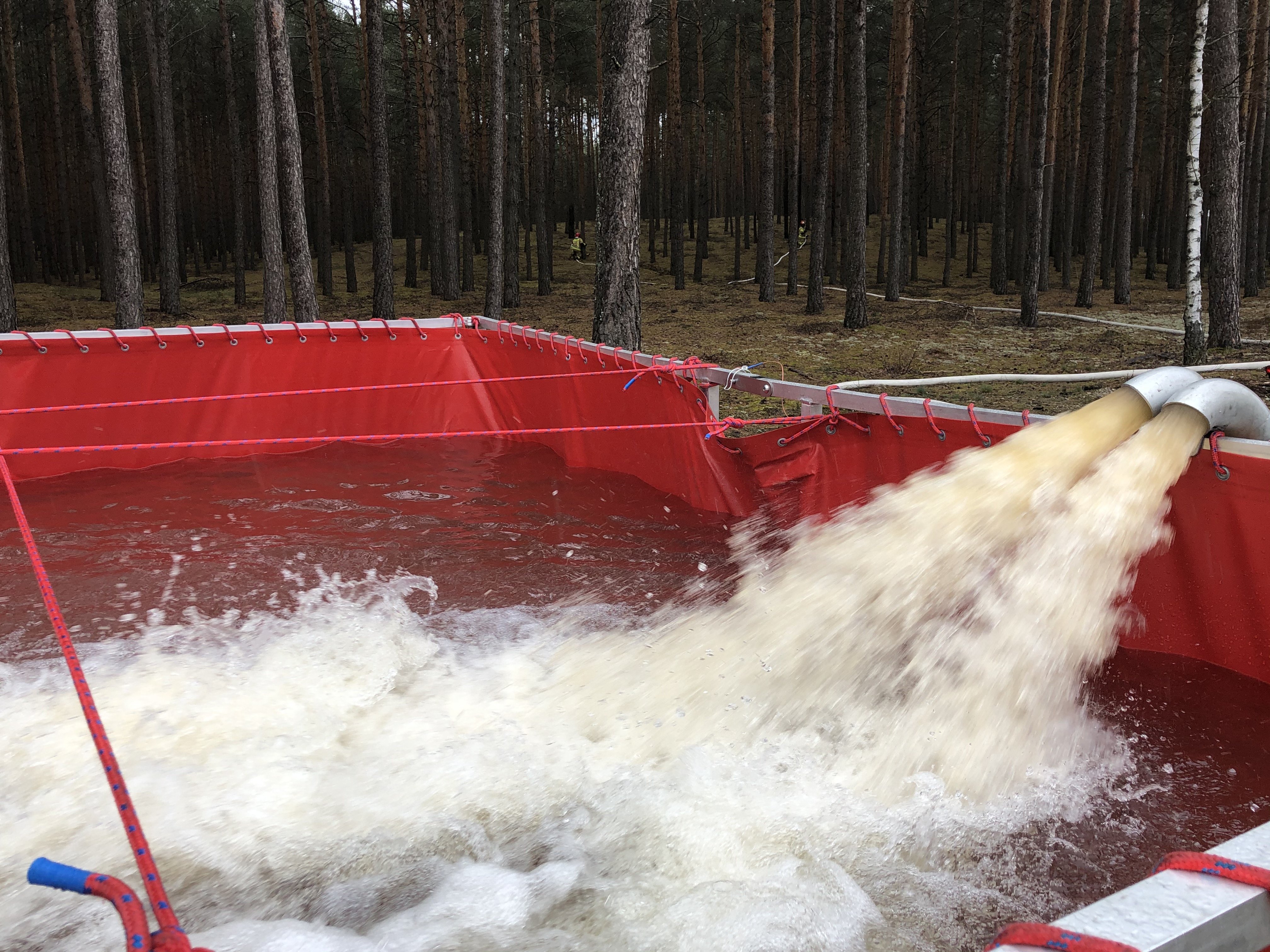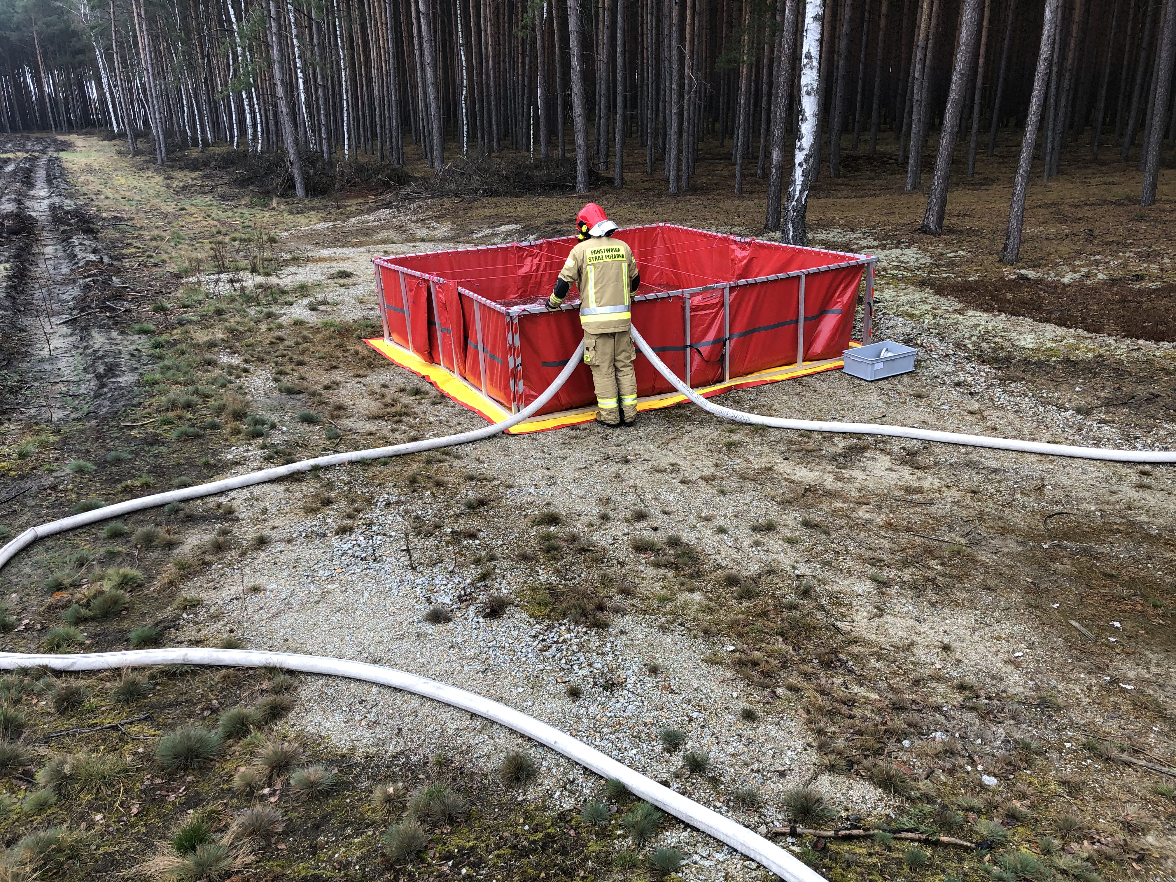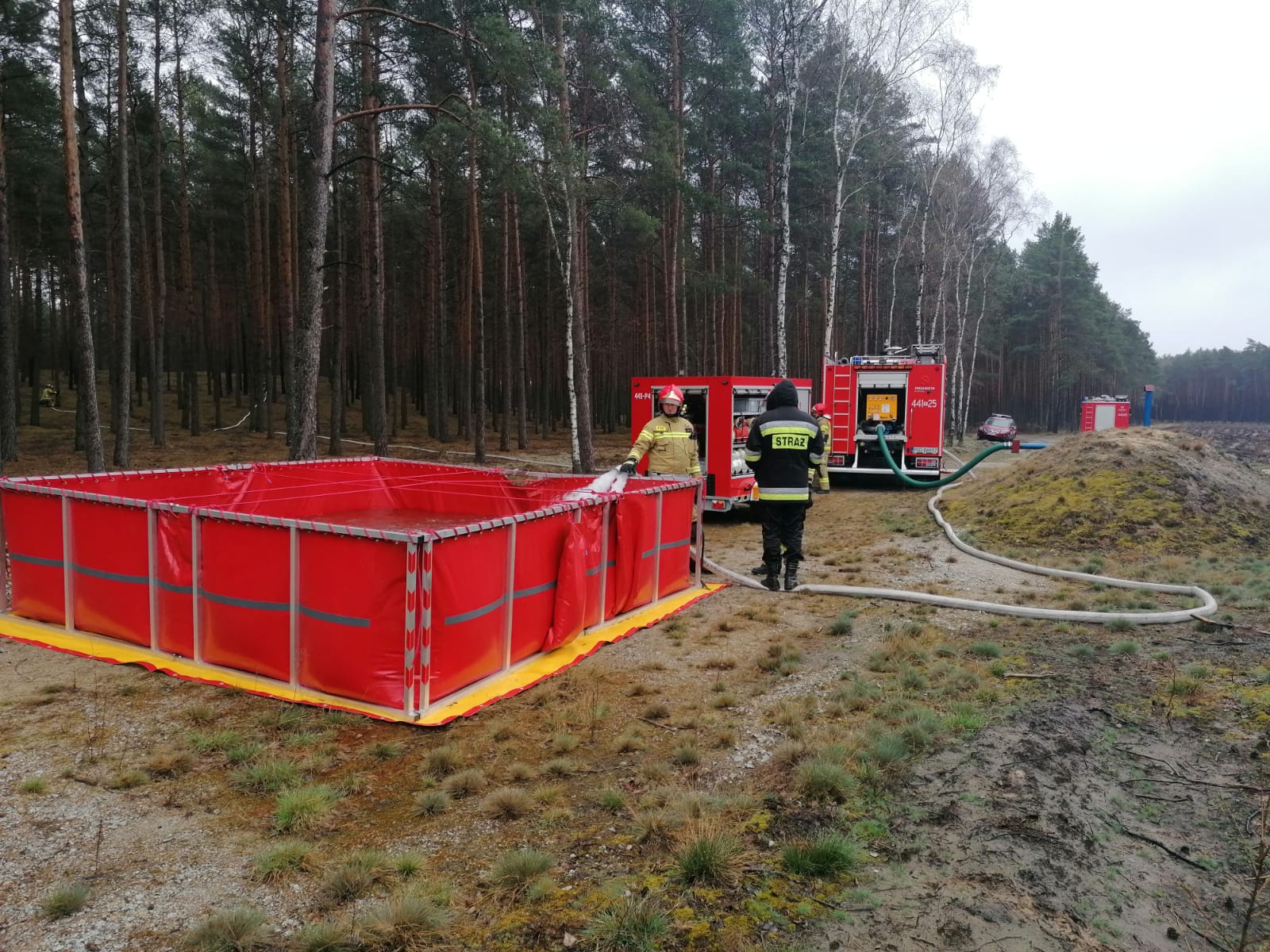 W zasadniczej części ćwiczeń stworzono stanowisko wodne w oparciu o podziemny zbiornik w oddziale 62, wykorzystując przy tym między innymi walory wyposażenia przyczepy wężowej. W dalszej kolejności przećwiczono też elementy: dostarczania wody do miejsca pożaru, prowadzenia łączności na miejscu działań, jak i samą taktykę gaśniczą podczas pożarów lasów.