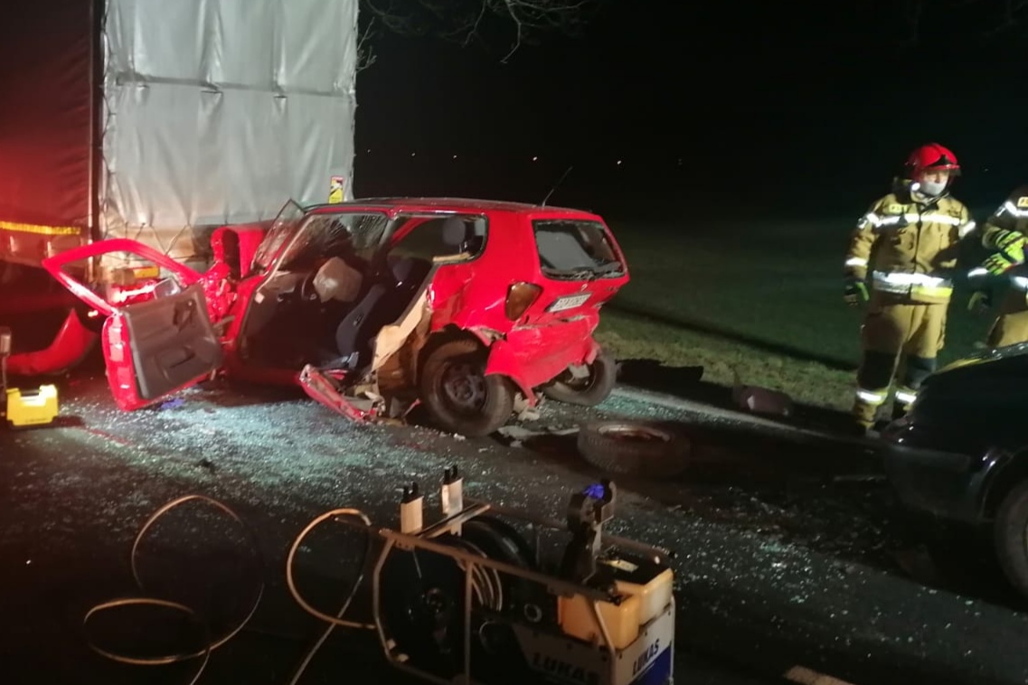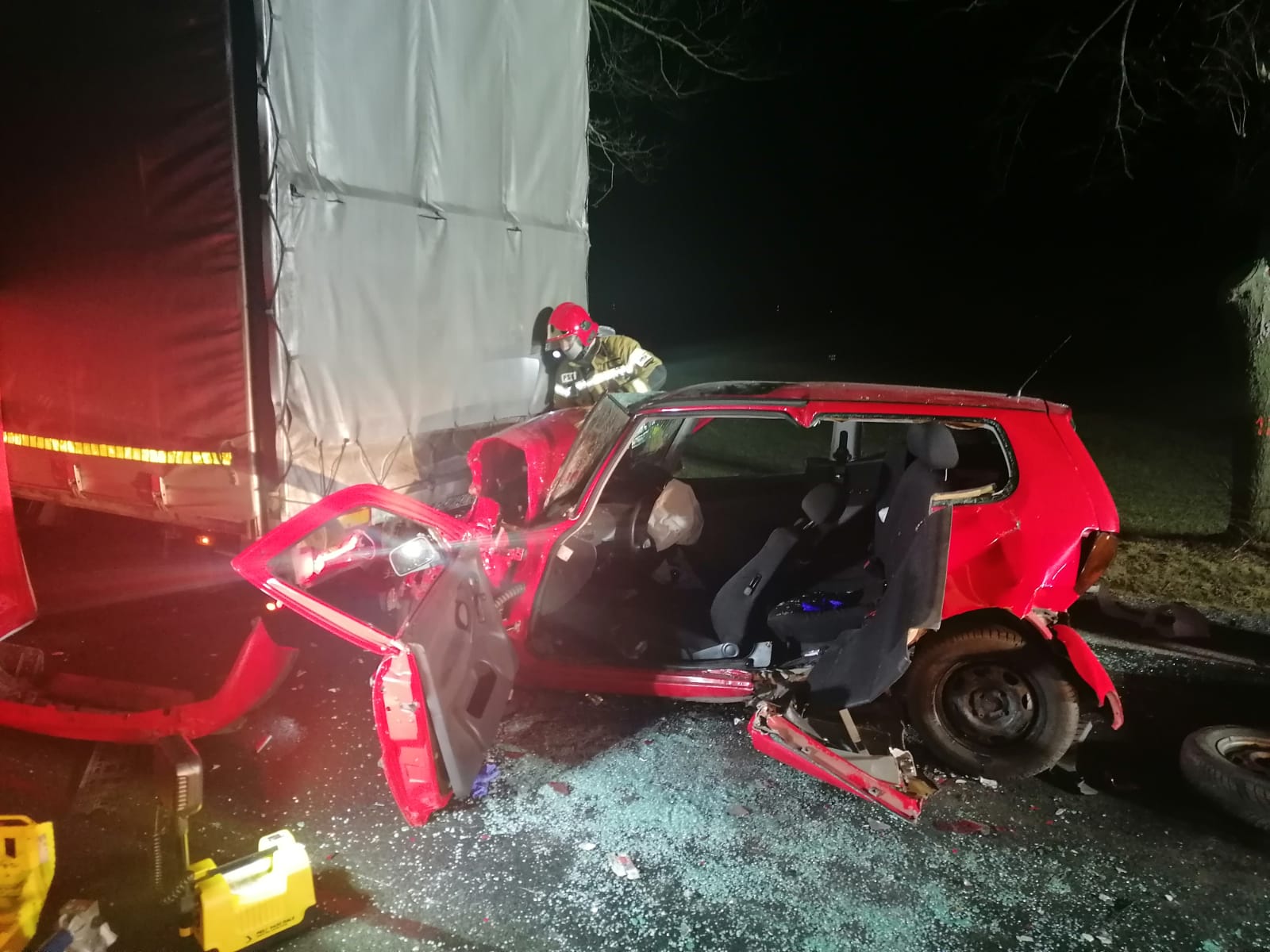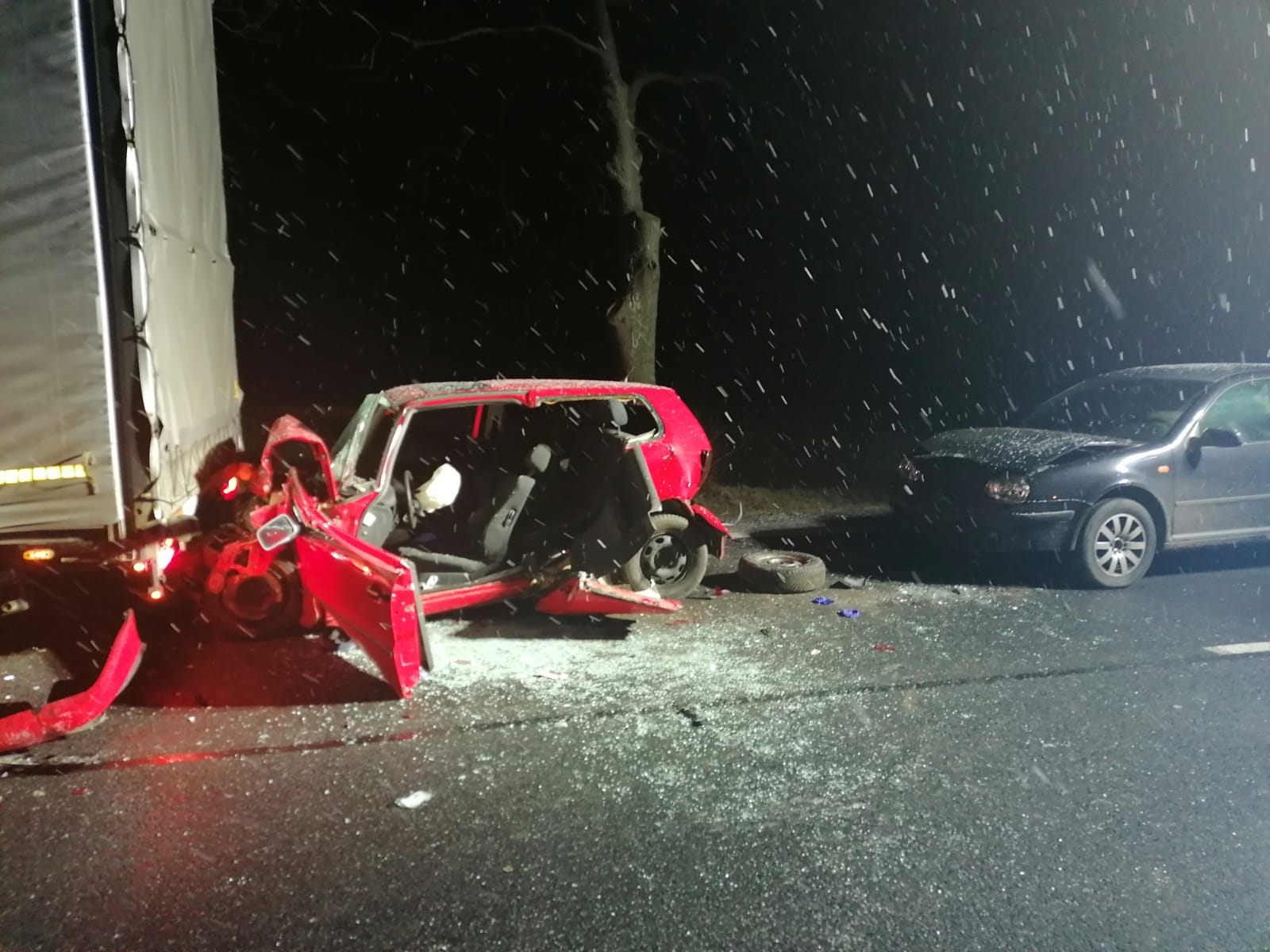 NA DRODZE KRAJOWEJ 32 NA POMIĘDZY MIEJSCOWOŚCIAMI GRODZISK - PTASZKOWO. AUTO OSOBOWE WBIŁO SIĘ POD NACZEPĘ CIĘŻARÓWKI