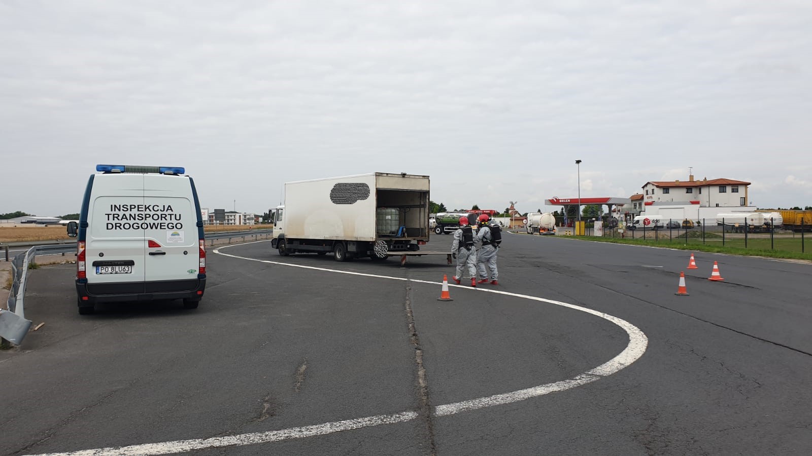 Po przybyciu i zabezpieczeniu terenu akcji strażacy przystąpili do identyfikacji przewożonych substancji. Po dokładniejszych oględzinach zbiornika, okazało się, że to podchloryn sodu wydostawał się ze zbiornika na zewnątrz. Żrąca substancja zniszczyła częściowo dokumenty przewozowe znajdujące się na zbiorniku. W dalszej kolejności sprawdzono stan zbiornika, który był w stanie nieuszkodzonym. Wspomniane medium wydostało się przez źle zamknięty korek. Po zamknięciu zbiornika, neutralizacji niewielkiego wycieku, pojazd z ładunkiem przekazano funkcjonariuszom ITD.