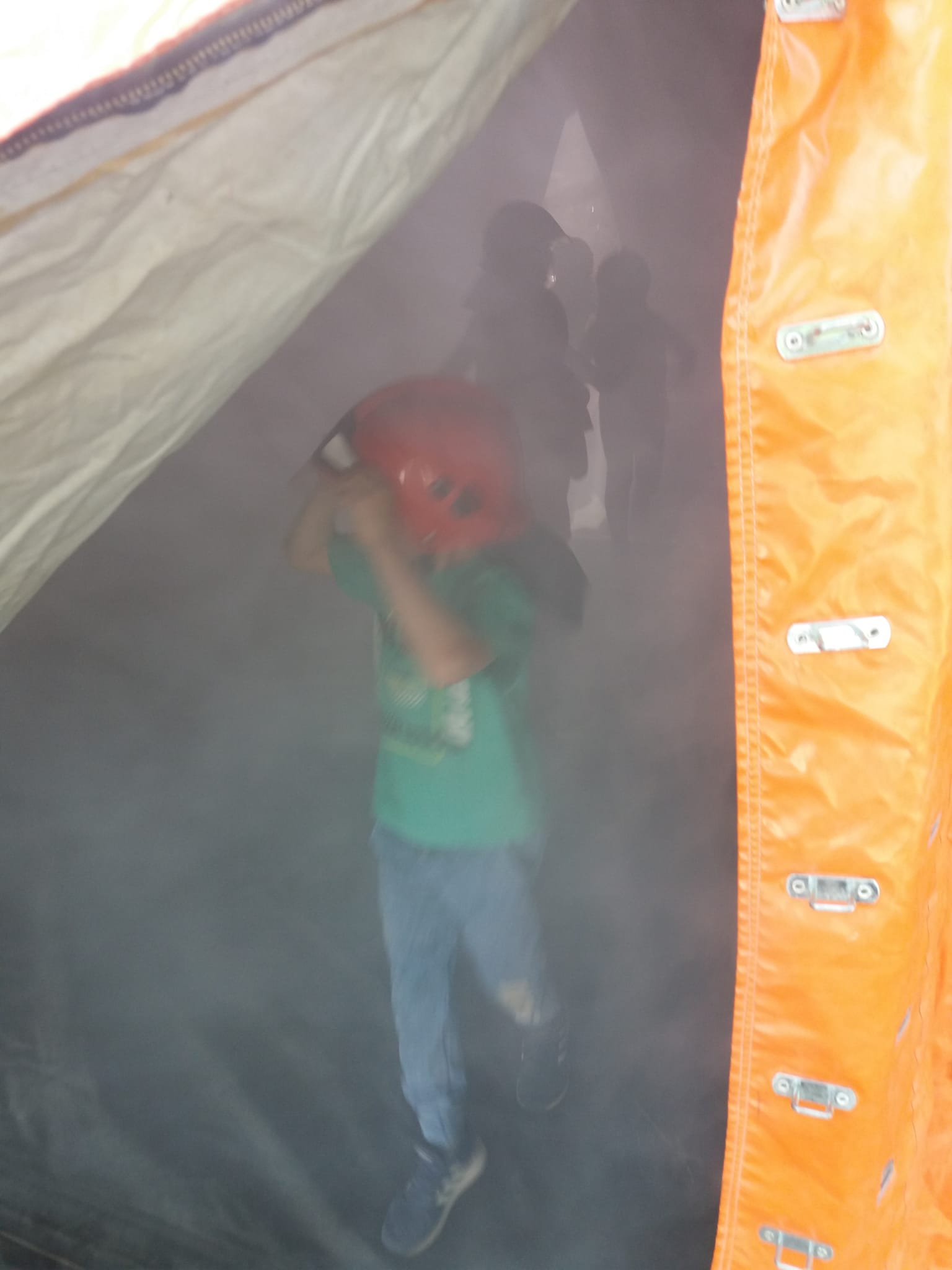 Przy wykorzystaniu mobilnego symulatora strażacy przypomnieli dzieciom oraz ich opiekunom o zagrożeniach i podstawowych zasadach bezpieczeństwa pożarowego w mieszkaniu.