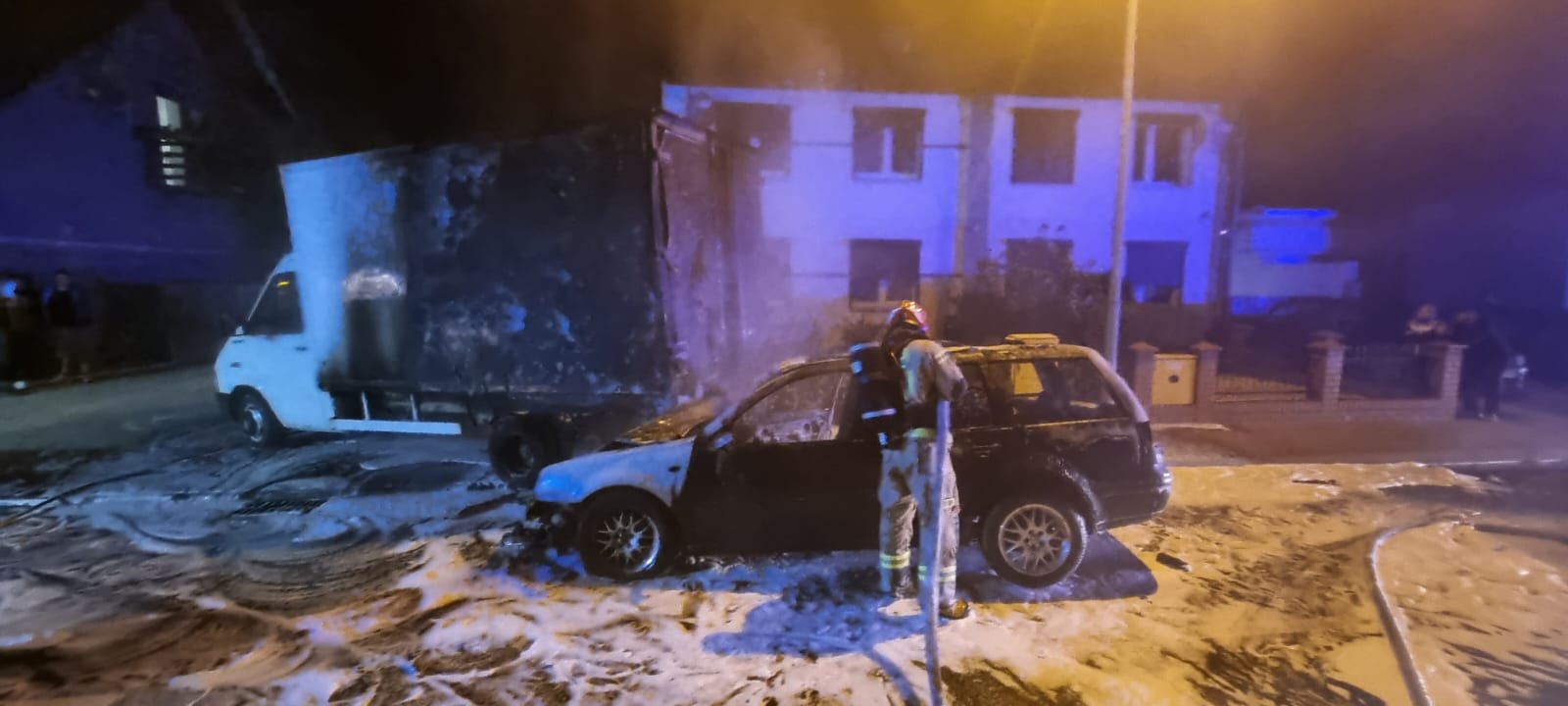 Noc z 26 na 27 października nie należała w Grodzisku do spokojnych. Około godziny 23, przy ulicy Środkowej samochód osobowy uderzył w zaparkowany samochód dostawczy. Oba pojazdy stanęły w płomieniach.