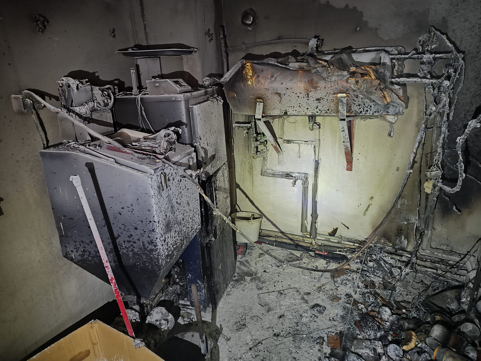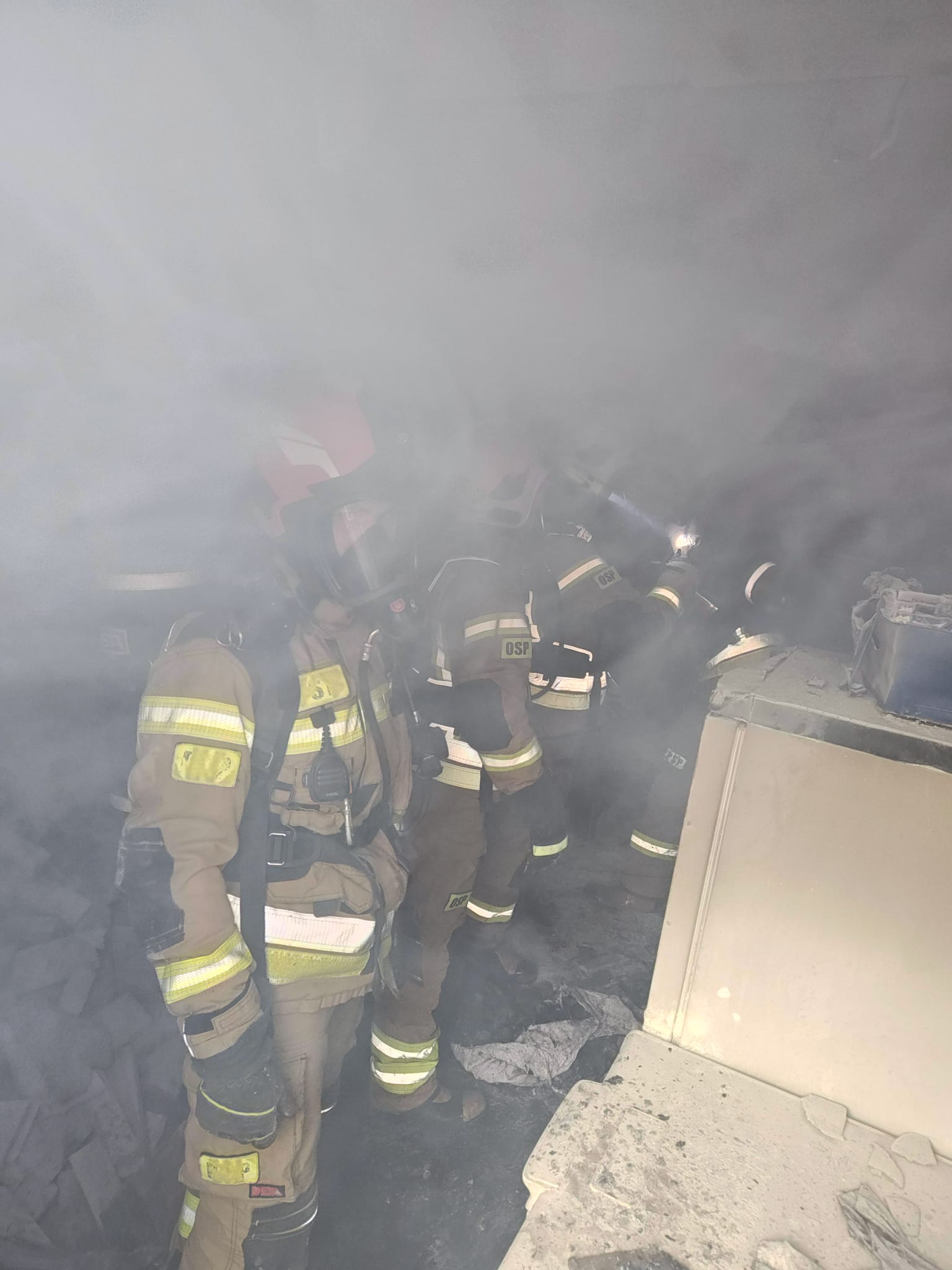 Po dojeździe na miejsce zdarzenia oraz wykonaniu rozpoznania stwierdzono pożar, którym objęte było pomieszczenia kotłowni przyległe do budynku mieszkalnego. Wszystkie osoby opuściły budynek przed przybyciem straży pożarnej. W celu ugaszenia pożaru podano jeden prąd wody, następnie wyniesiono nadpalone materiały oraz sprawdzono budynek kamerą termowizyjną.