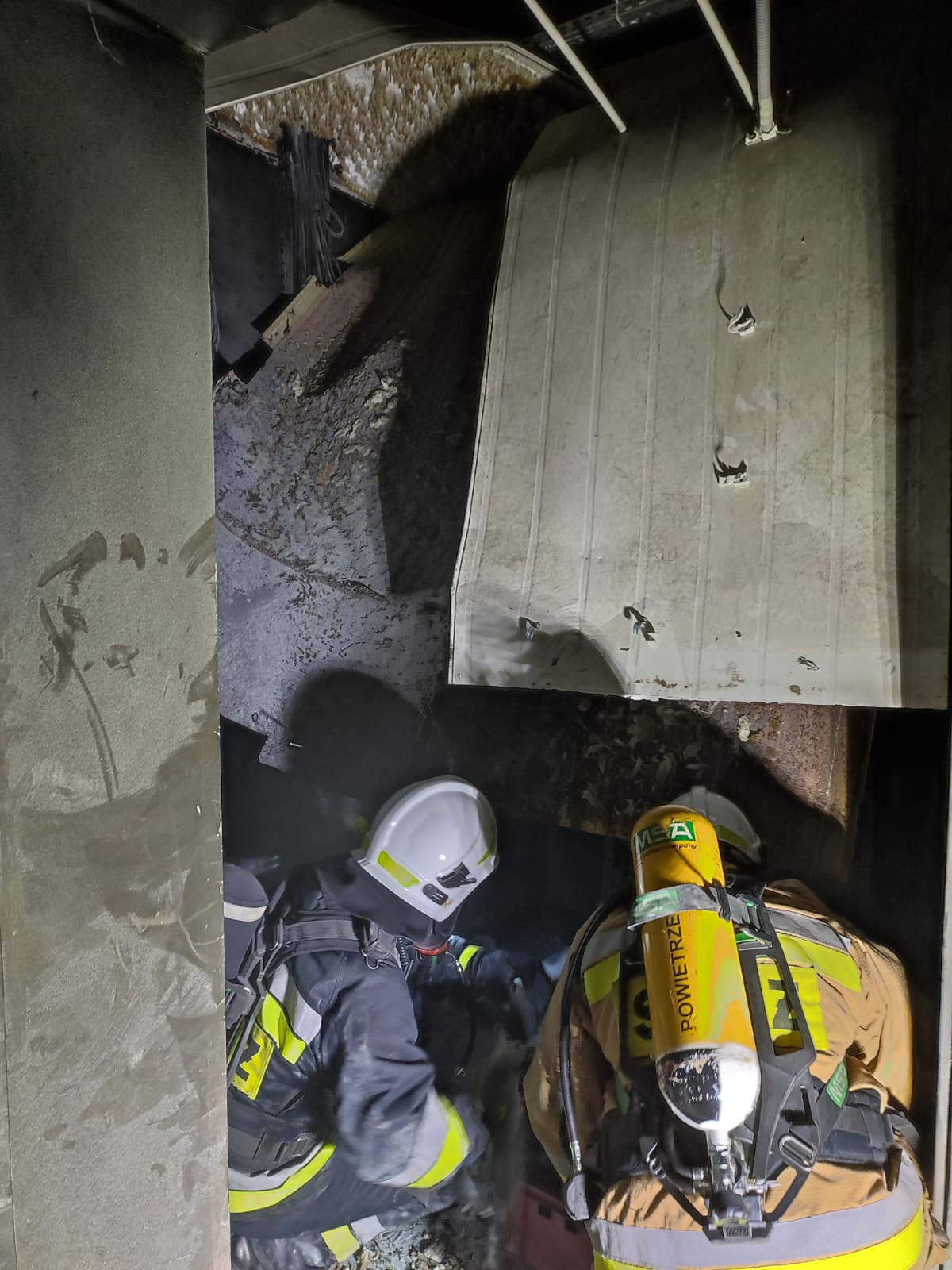 Po odnalezieniu źródła pożaru w celu dotarcia do jego ognisk wykonano prace rozbiórkowe sufitu podwieszonego płytą obornicką. Działania gaśnicze prowadzone były wewnątrz obiektu. W trakcie tych działań podano jeden prąd gaśniczy proszku w natarciu na palące się urządzenie sterujące. Kontrolowano również teren pożaru przy użyciu sprzętu wykrywczo-pomiarowego, po lokalizacji pożaru prowadzono przeszukiwanie pomieszczeń obiektu pod kątem potencjalnych zagrożeń.