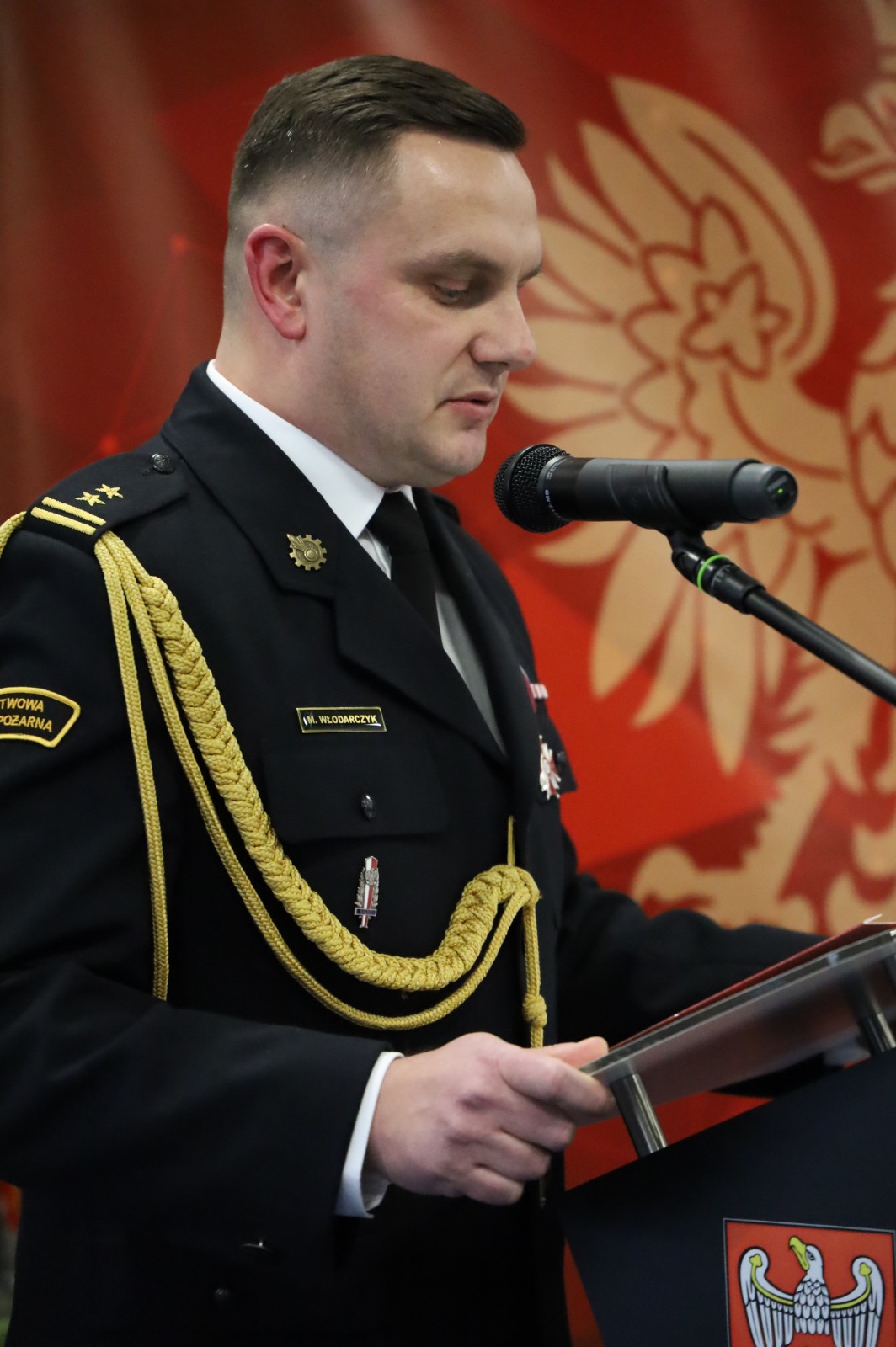 Bryg. Marcin Włodarczyk podczas swojego wystąpienia podsumował przebieg swojej służby. Podkreślił, że sprawowanie funkcji komendanta to nie tylko prestiż, ale przede wszystkim zobowiązanie wobec społeczeństwa, współpracowników i braci strażackiej, które starał się wykonywać jak najlepiej. Podczas swojego przemówienia wspominał podjęte w ostatnich latach działania i inwestycje, które udało się zrealizować w siedzibie grodziskich strażaków, dodał też, że działania nie byłyby możliwe, gdyby nie pomoc, wsparcie i praca obecnych. Podziękował współpracownikom, najbliższym oraz wszystkim tym, których miał okazję spotkać na swojej zawodowej drodze. Na zakończenie stwierdził, że bycie komendantem w Grodzisku było zaszczytem, zaś decyzja o zakończeniu służby nie była łatwa.