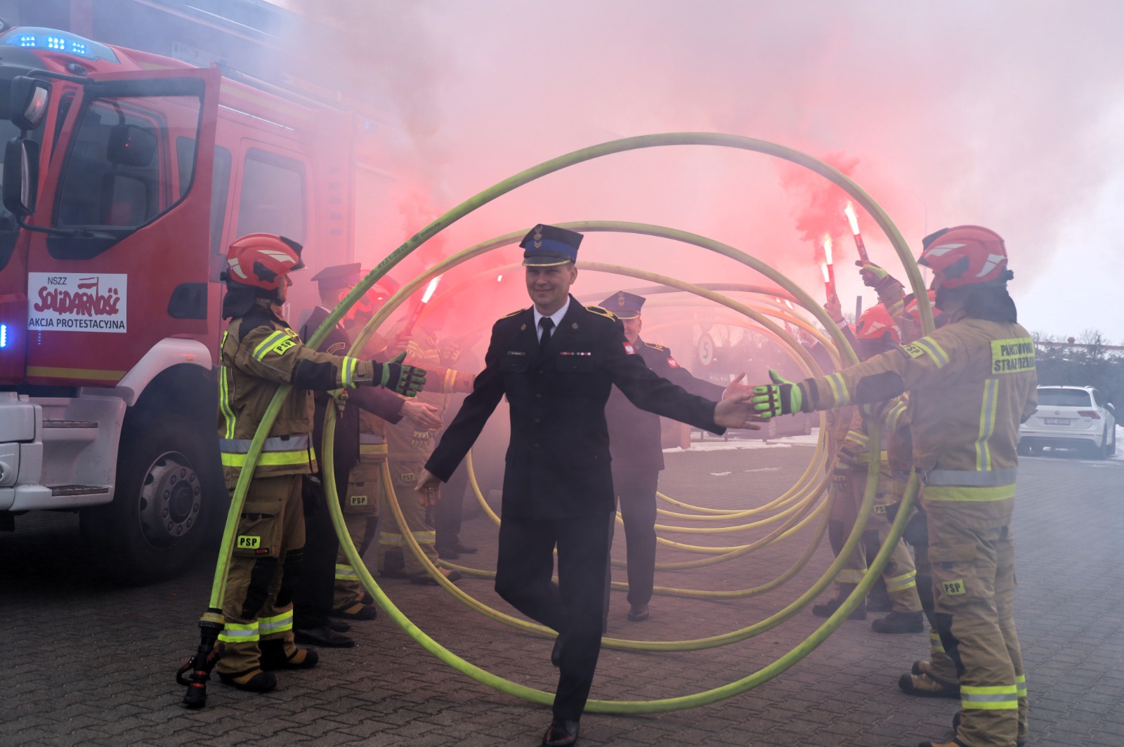 Na placu przed komendą był szpaler z węży strażackich oraz rac, przez który musieli przejść przyszli emeryci. Na jego końcu, na żegnających się z grodziską jednostką funkcjonariuszy, czekał zimny prysznic i to nie byle jaki, bo na wysokości.
