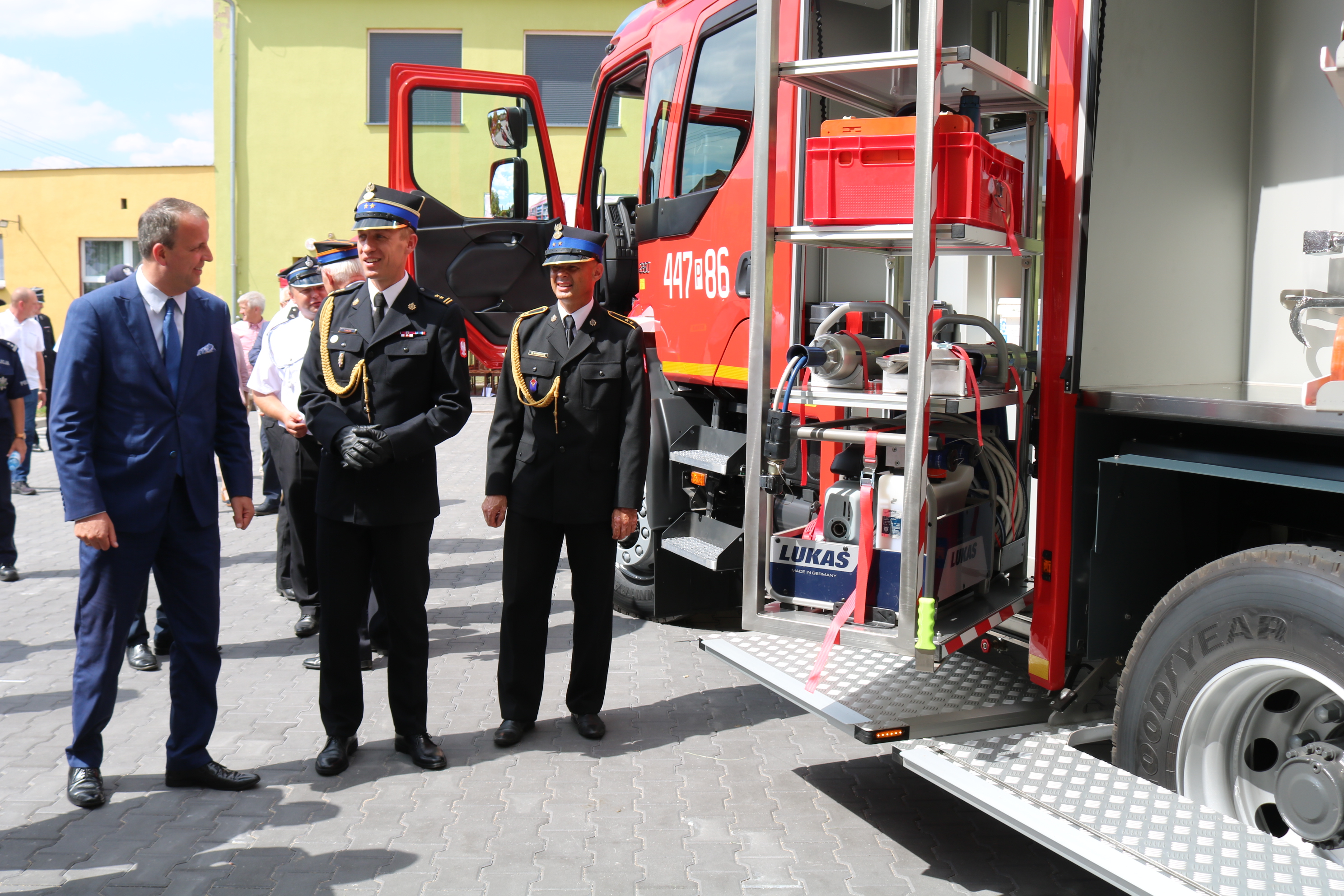 Klucze i dokumenty do auta Prezesowi i Naczelnikowi jednostki OSP Wilkowo Polskie przekazali Poseł na Sejm RP Marta Kubiak, Wojewoda Wielkopolski Michał Zieliński, Z-ca Wielkopolskiego Komendanta Wojewódzkiego PSP brygadier Tomasz Grelak, Burmistrz Wielichowa Honorata Kozłowska oraz Komendant Powiatowy PSP w Grodzisku Wielkopolskim bryg. Marcin Włodarczyk. Następnie poświęcenia nowego pojazdu dokonał ksiądz kapelan Marek Smólski po czym strażacy symbolicznie uruchomili pojazd. Nie brakowało gratulacji oraz podziękowań.