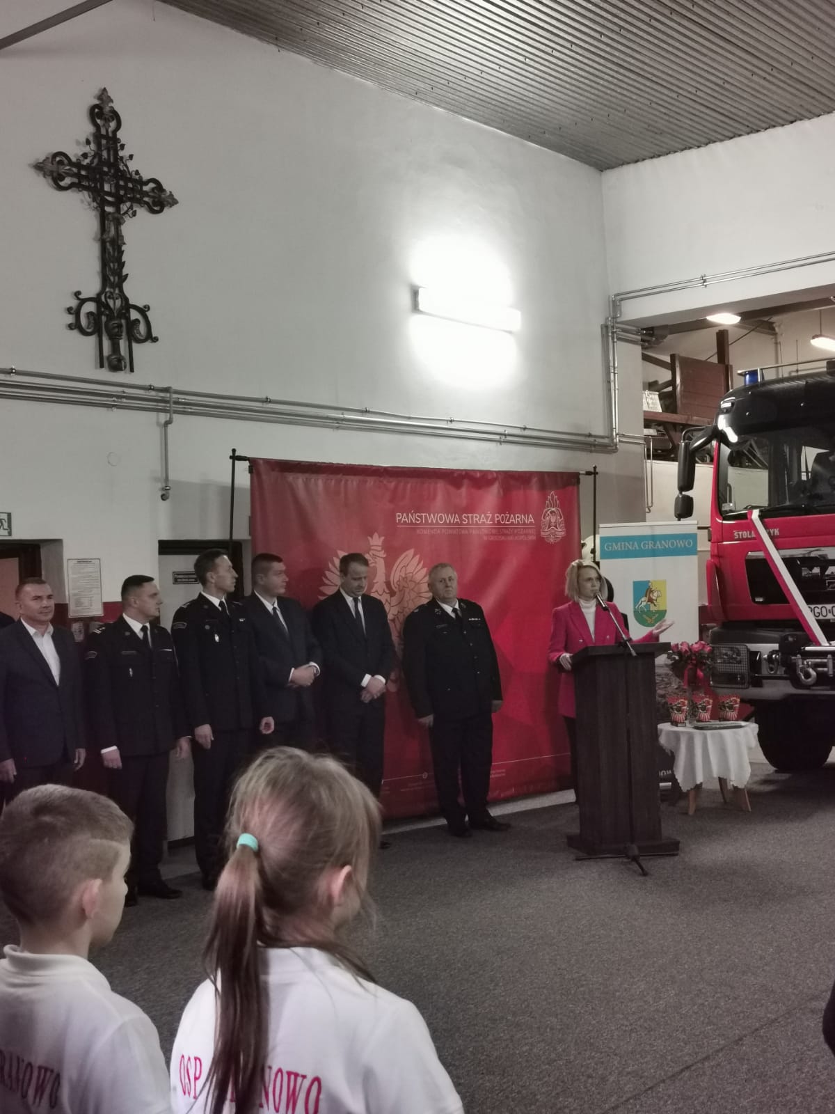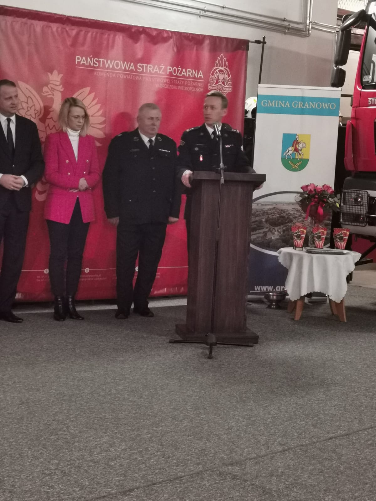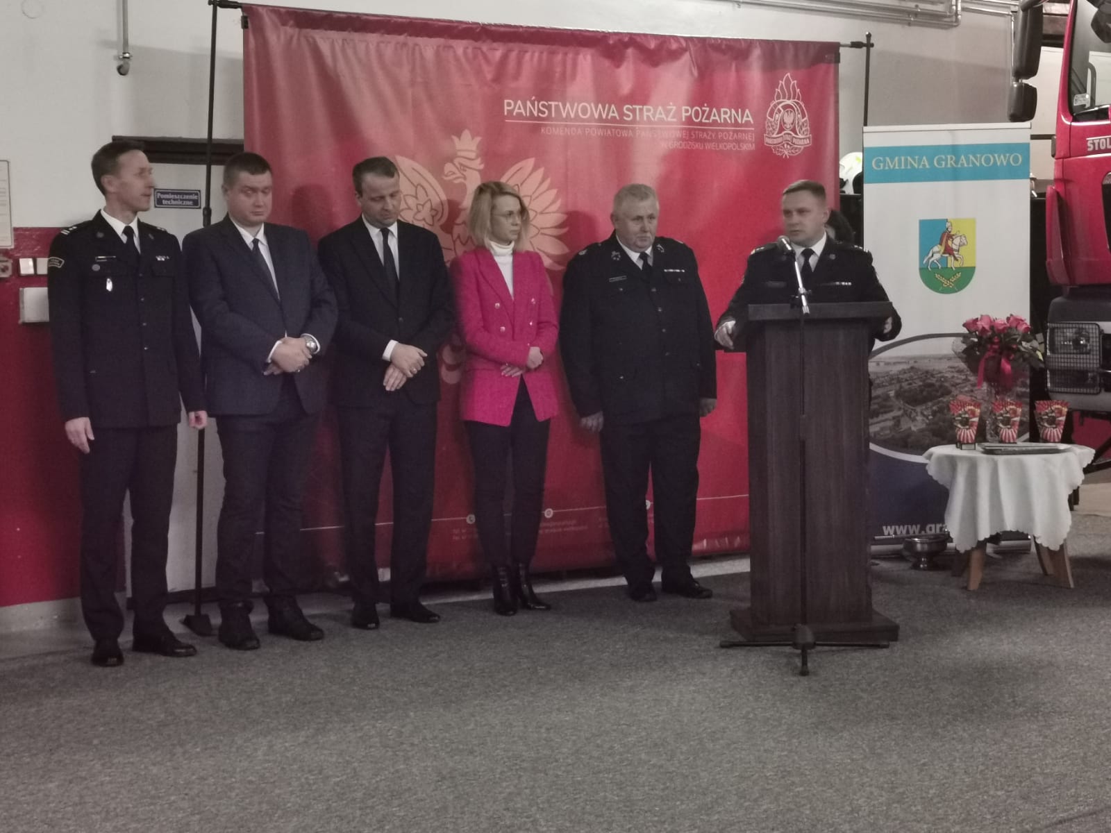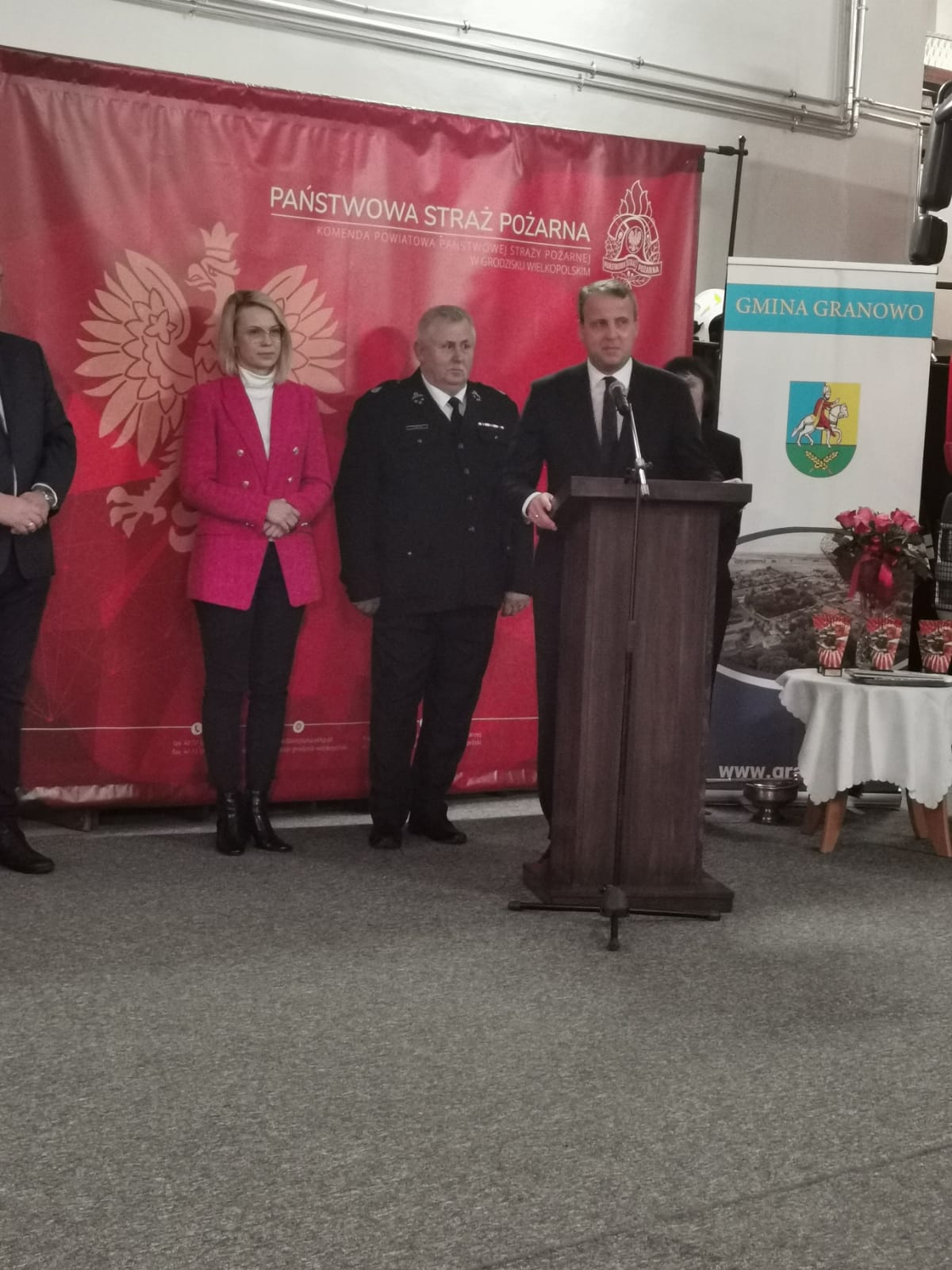 Wojewoda Wielkopolski Pan Zieliński Michał w asyście: Z-cy Wielkopolskiego Komendanta Wojewódzkiego PSP bryg. Tomasza Grelaka, Komendanta Powiatowego PSP w Grodzisku Wlkp. bryg. Marcina Włodarczyka, Pani Poseł Marty Kubiak, Pana Posła Marcina Porzucka, Wójta Gminy Granowo Pana Zbigniewa Kaczmarka.