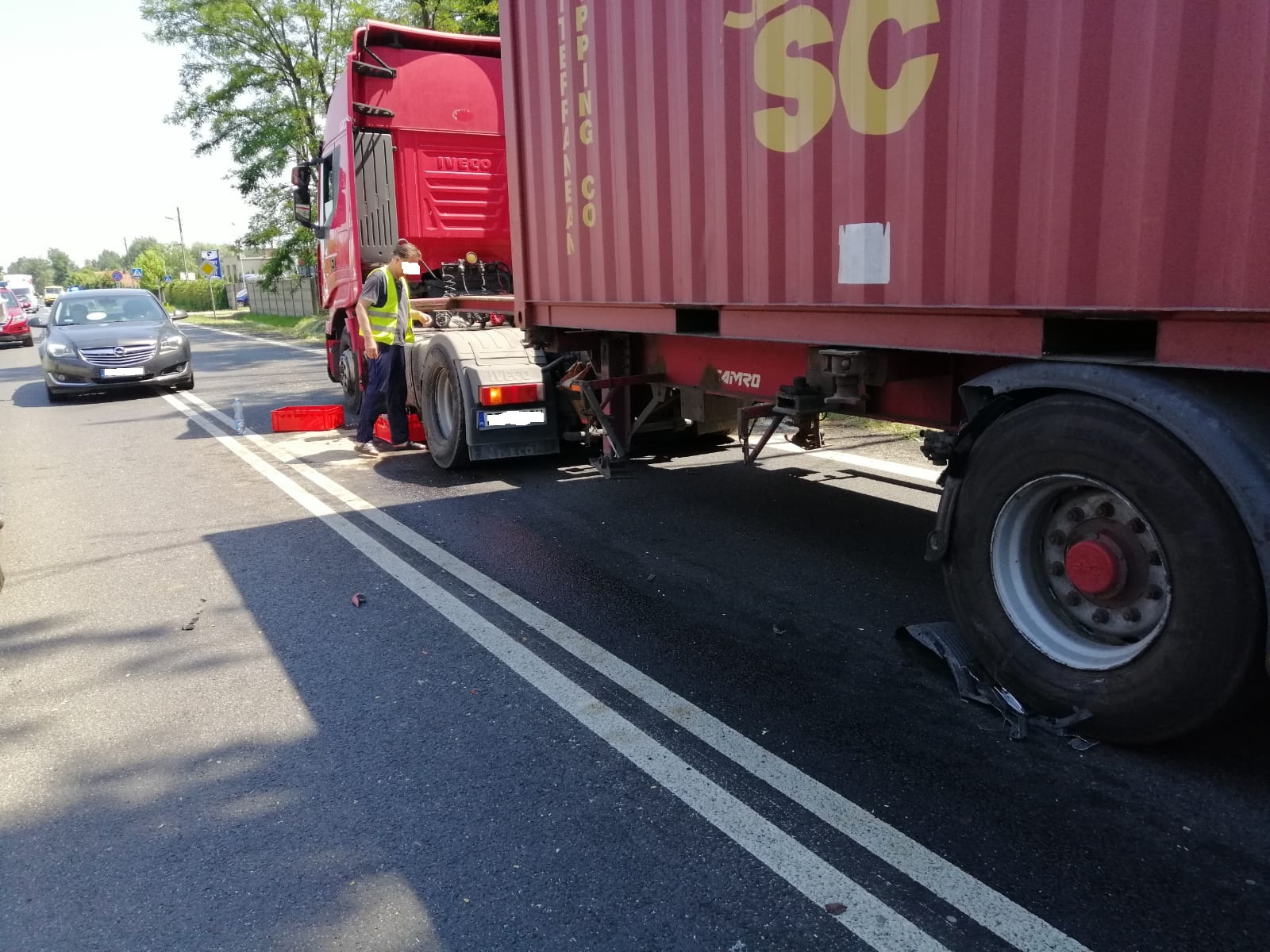 Kierujący samochodem osobowym marki KIA zjechał na przeciwległy pas jezdni i zderzył się z jadącym z naprzeciwka samochodem ciężarowym. Kierujący nie odnieśli obrażeń. Po zbadaniu przez ZRM pozostali na miejscu zdarzenia.