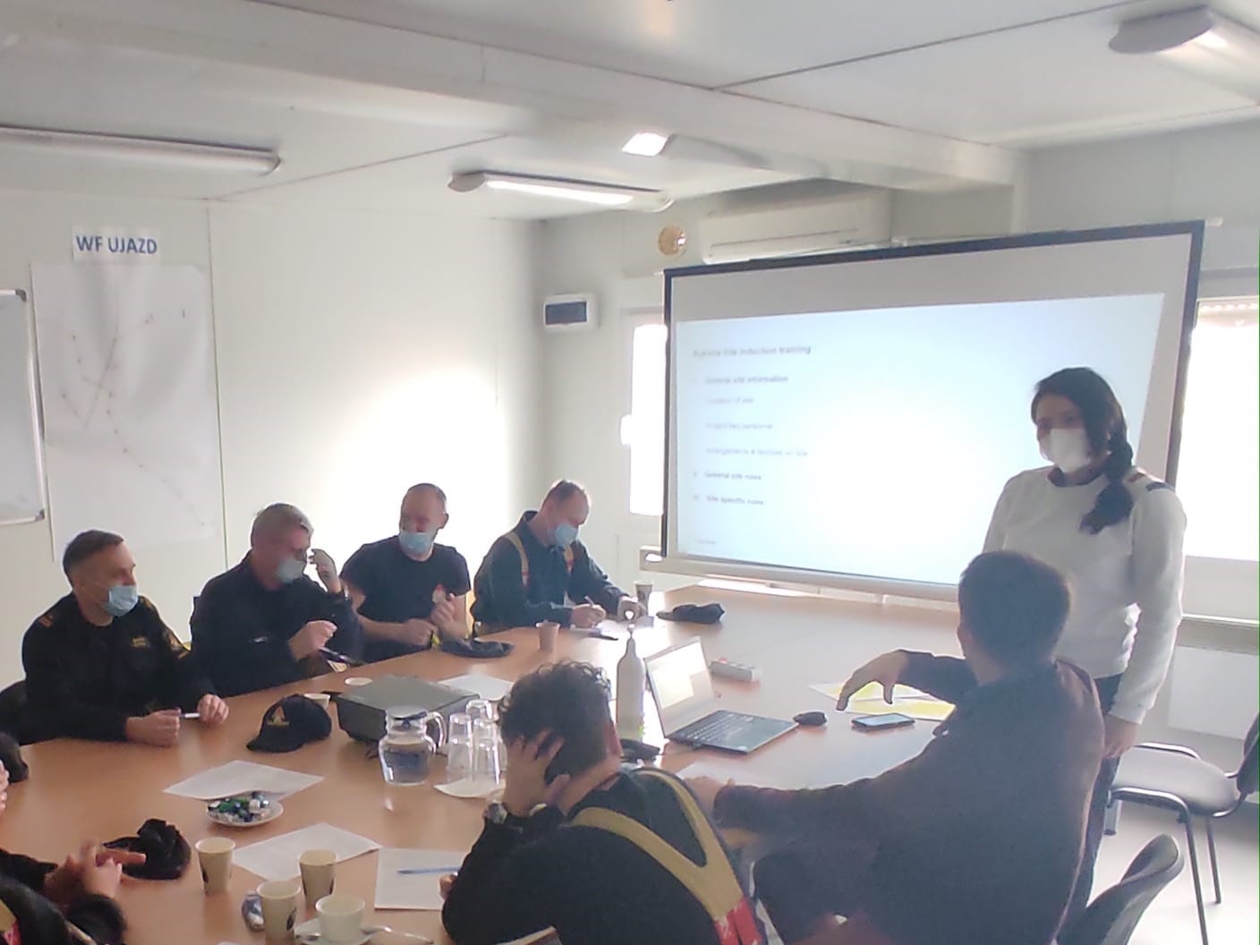 Przedstawiciel inwestora w formie prezentacji multimedialnej przedstawił ogólne założenia projektu, omówił zagrożenia. Uczestnicy odbyli szkolenie dotyczące bezpieczeńśtwa na terenie farmy. W dalszej cześci zaprezentowano jedną z elektrowni wiatrowych pod kątem zasad działania, zagrożeń pożarowych.