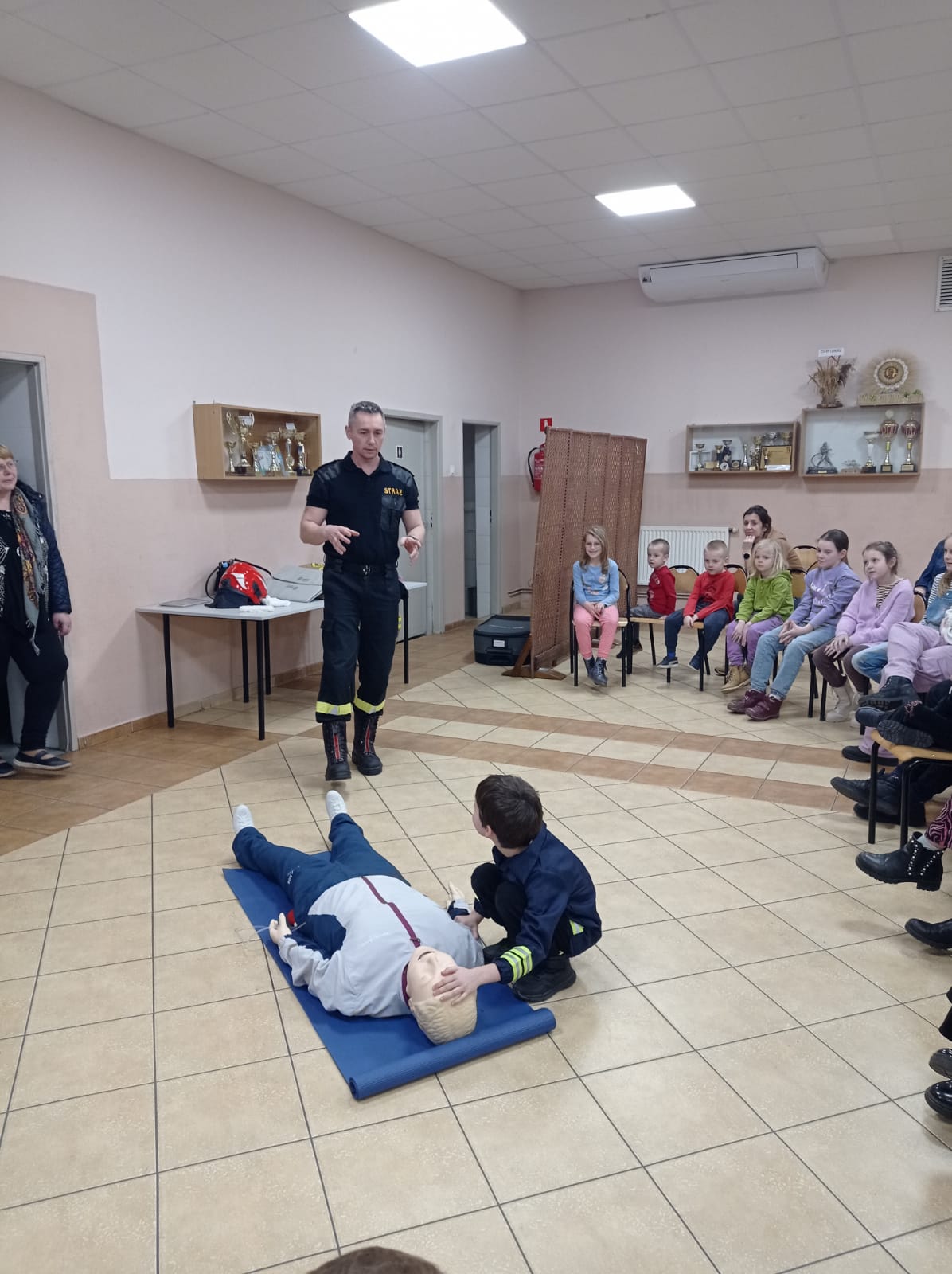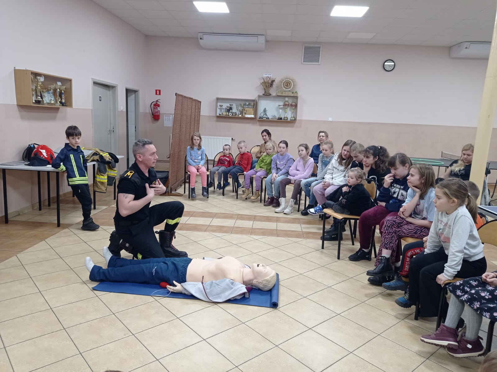 Podczas pogadanki przedstawiono specyfikę zawodu strażaka. Omówiono oraz zaprezentowano elementarne zasady udzielania pierwszej pomocy.