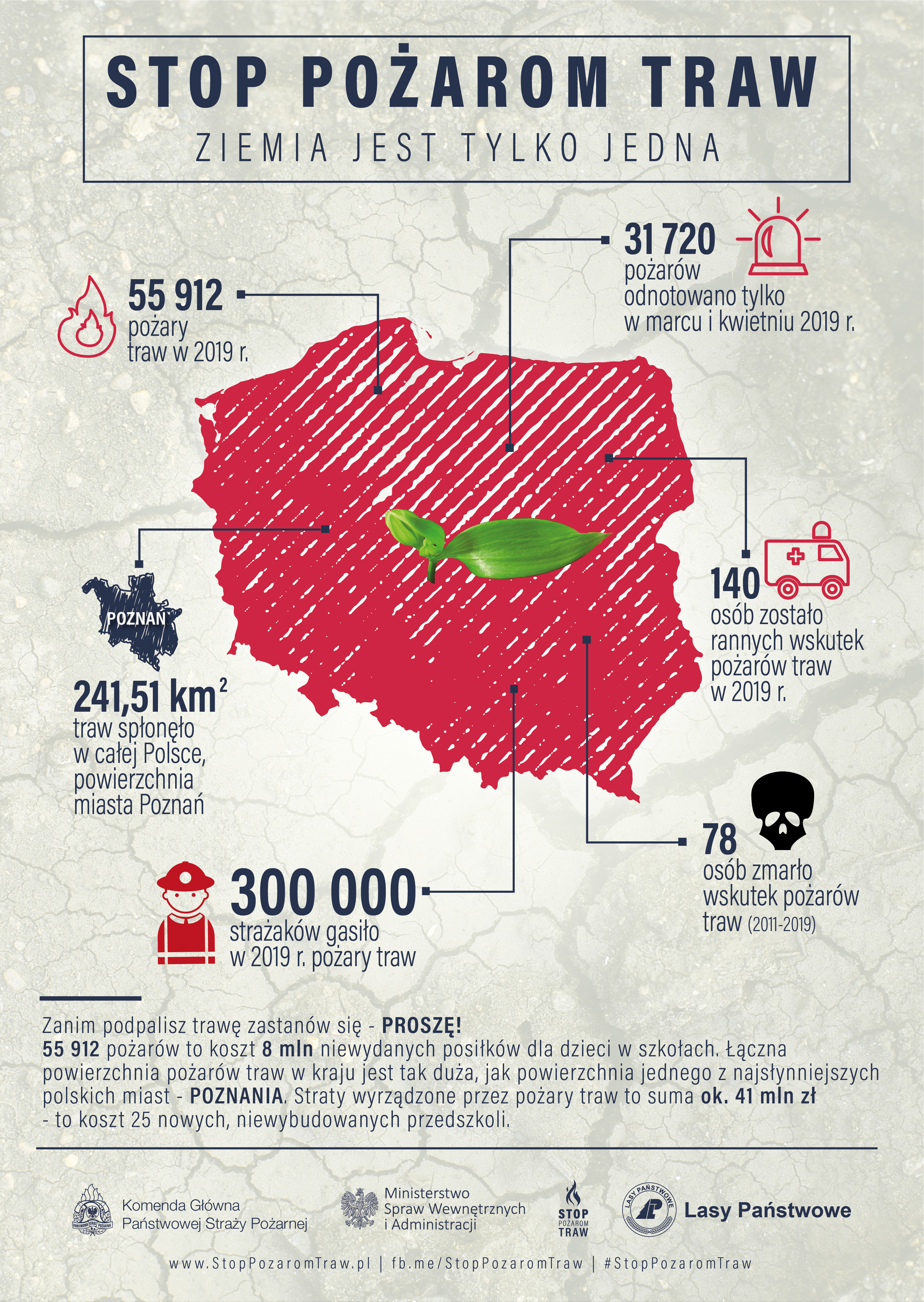 Okres wiosenny to czas , w którym wyraźnie wzrasta liczba pożarów traw na łąkach i nieużytkach rolnych. Najczęściej spowodowane jest to wypalaniem suchych traw i pozostałości roślinnych. Obszary zeszłorocznej wysuszonej roślinności są doskonałym materiałem palnym, co w połączeniu z nieodpowiedzialnością ludzi skutkuje gwałtownym wzrostem pożarów.