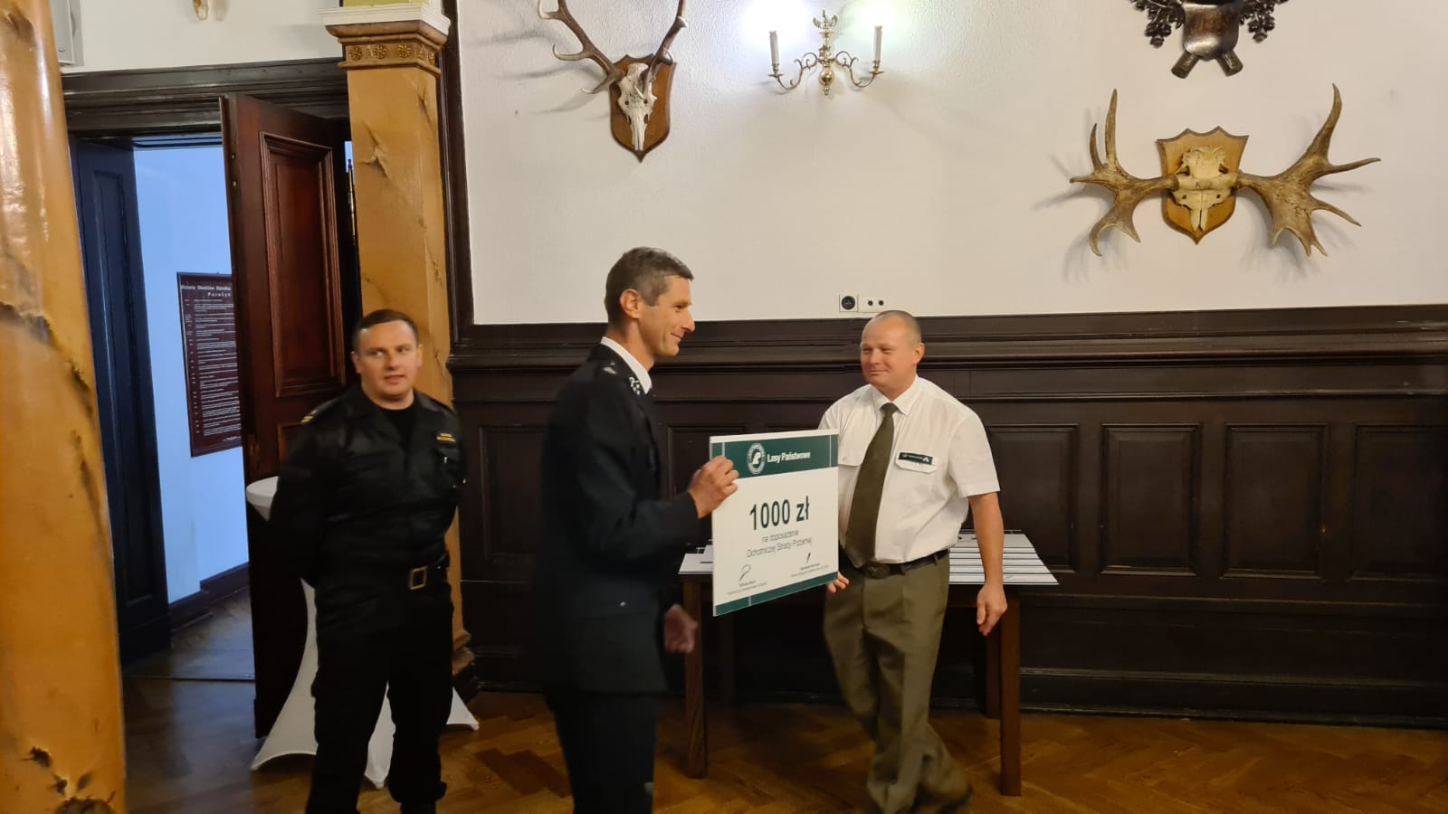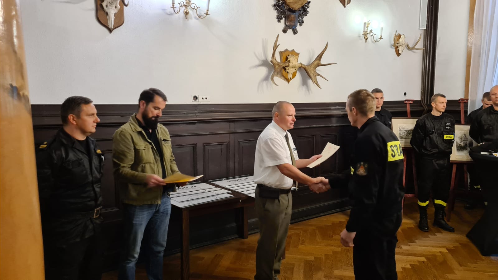 Dariusz Szulc - Nadleśniczy Nadleśnictwa Grodzisk Wlkp., wraz z mł. bryg. Marcinem Włodarczykiem – Komendantem Powiatowym PSP w Grodzisku Wlkp. wręczyli uczestnikom szkolenia zaświadczenia potwierdzające udział w szkoleniu.
