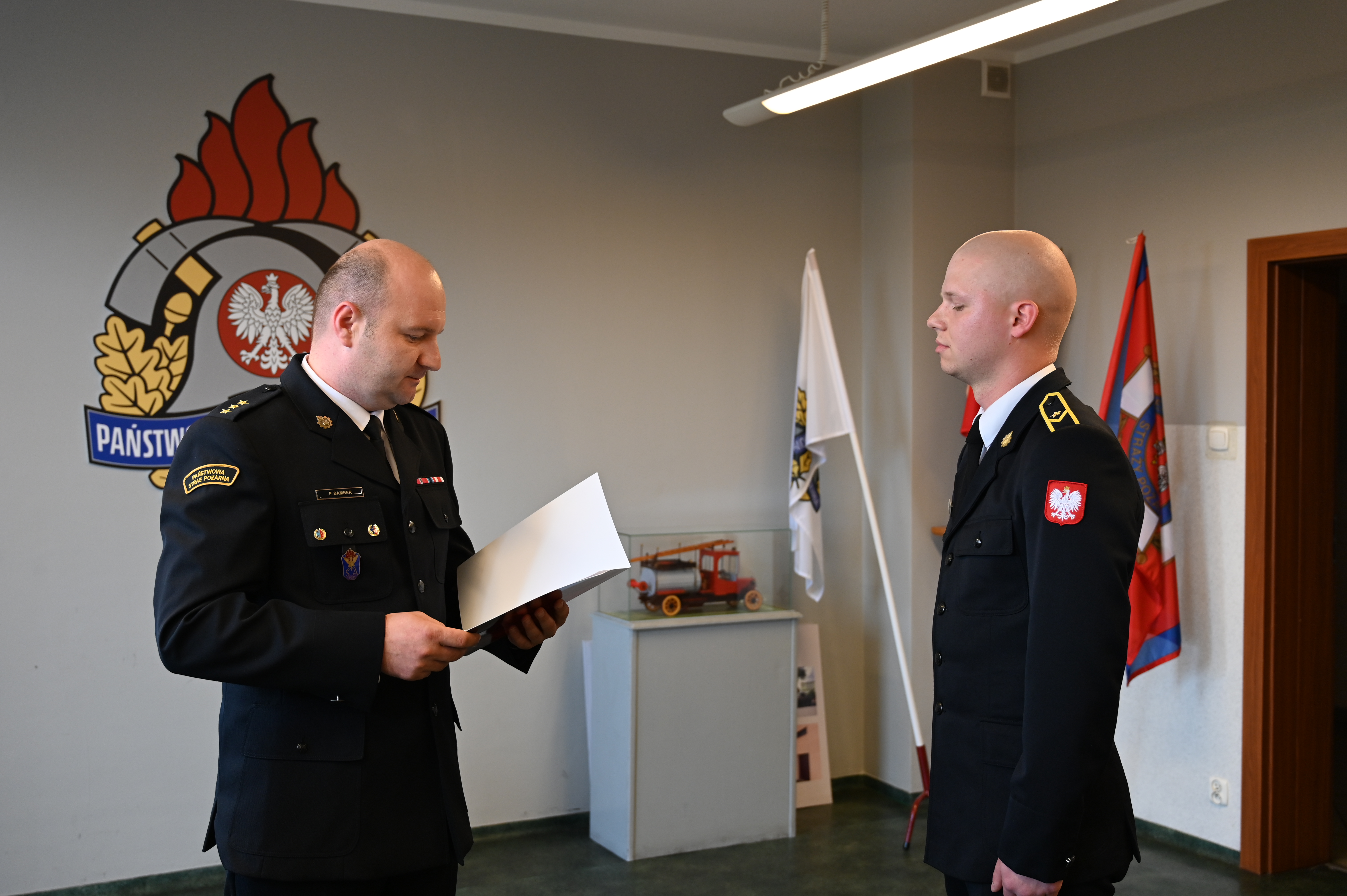 W obecności kadry i zmiany służbowej kpt. Piotr Bamber - Zastępca Komendanta Powiatowego PSP w Grodzisku Wlkp. powitał w szeregach grodziskiej komendy mł. asp. Igora Jankowskiego.