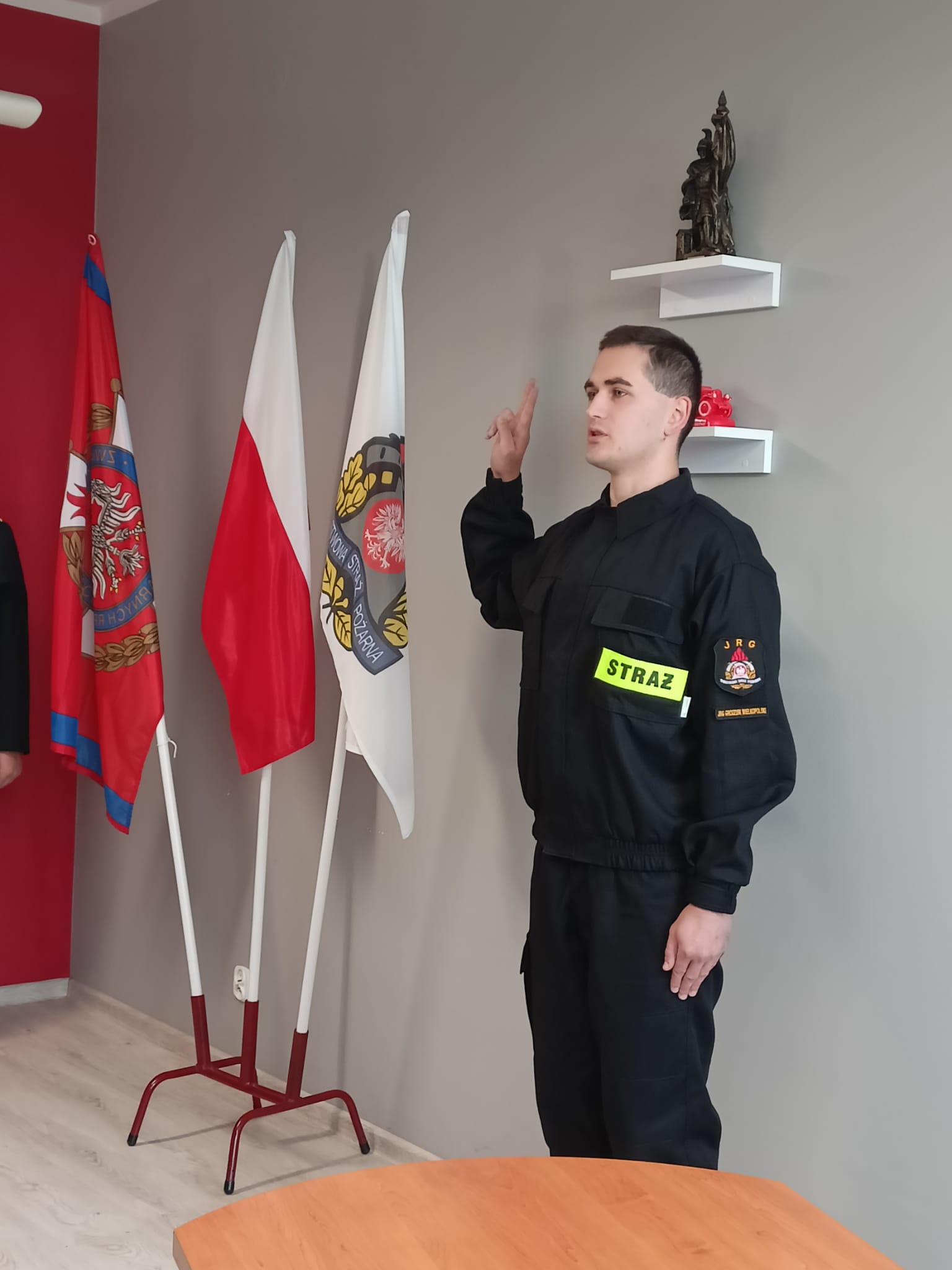 „Ja, obywatel Rzeczypospolitej Polskiej, świadom podejmowanych obowiązków strażaka, uroczyście ślubuję być ofiarnym i mężnym w ratowaniu zagrożonego życia ludzkiego i wszelkiego mienia – nawet z narażeniem życia. Wykonując powierzone mi zadania, ślubuję przestrzegać prawa, dyscypliny służbowej oraz wykonywać polecenia przełożonych. Ślubuję strzec tajemnic związanych ze służbą, a także honoru, godności i dobrego imienia służby oraz przestrzegać zasad etyki zawodowej.”