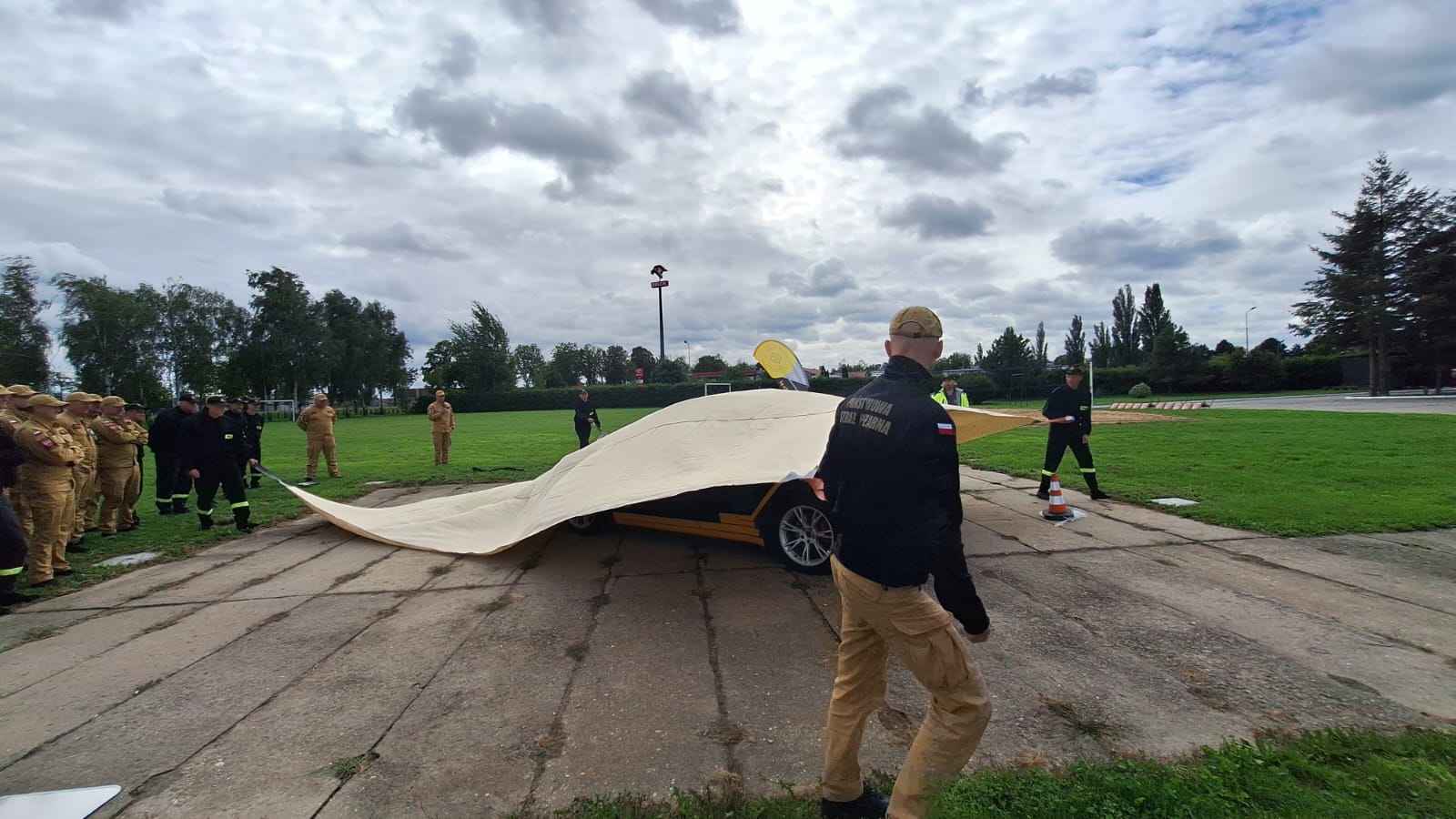 W częsci praktycznej na przykładzie Tesli przedstawiono taktykę ratowniczą podczas zdarzeń drogowych. Zaprezentowano również walory oraz prawidłowe wykorzystanie płachty gaśniczej dedykowanej do pożarów pojazdów elektrycznych.