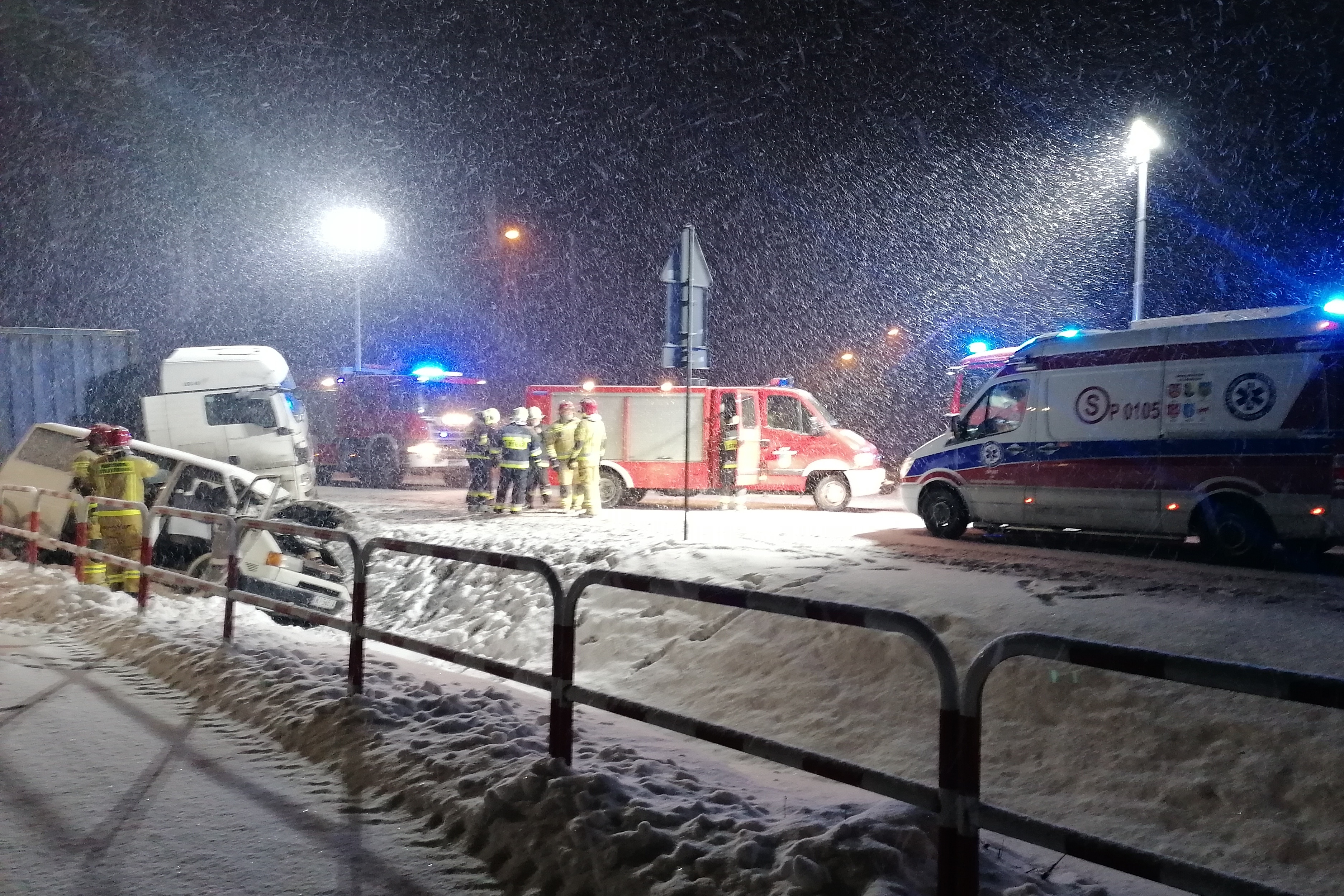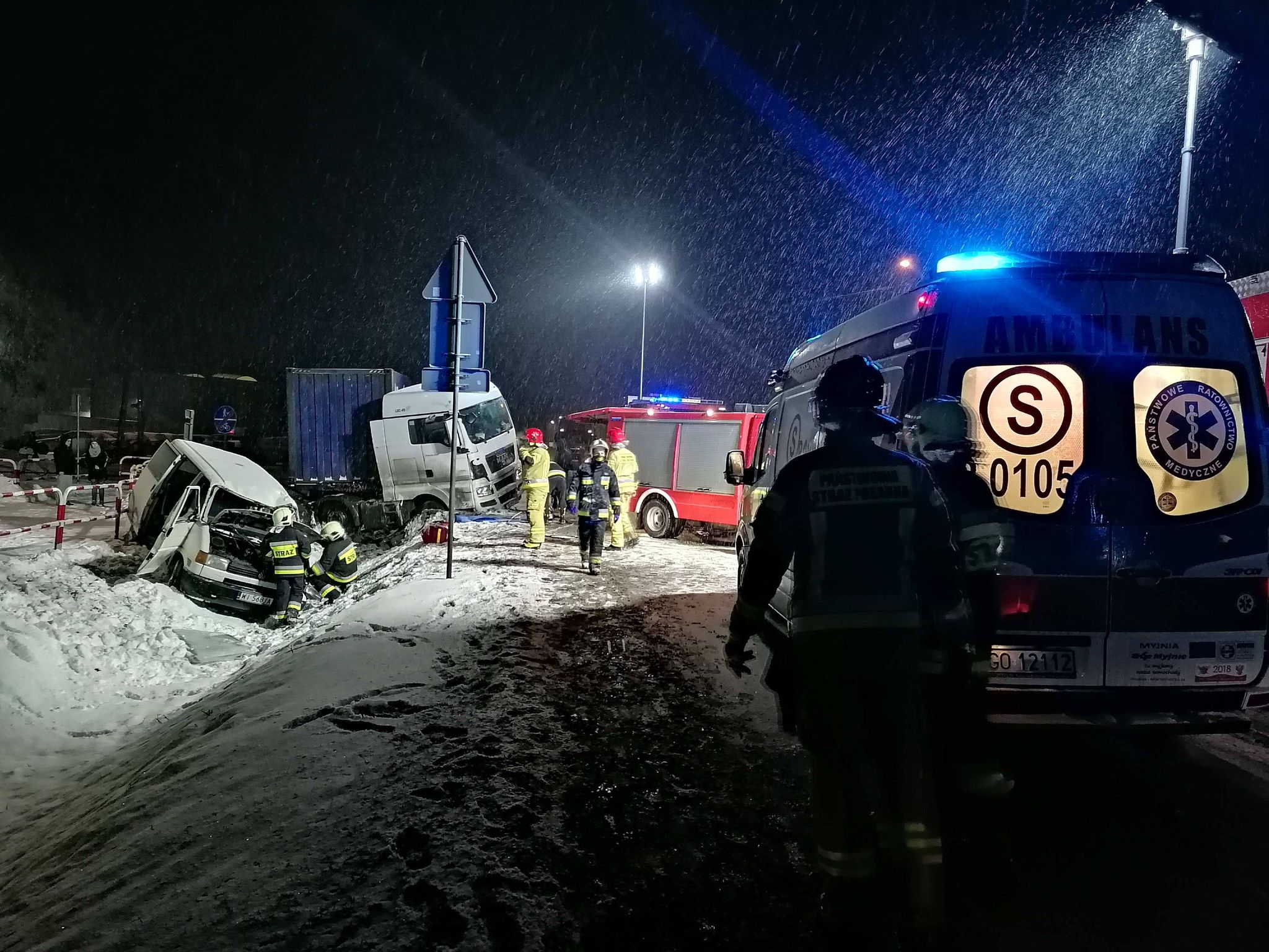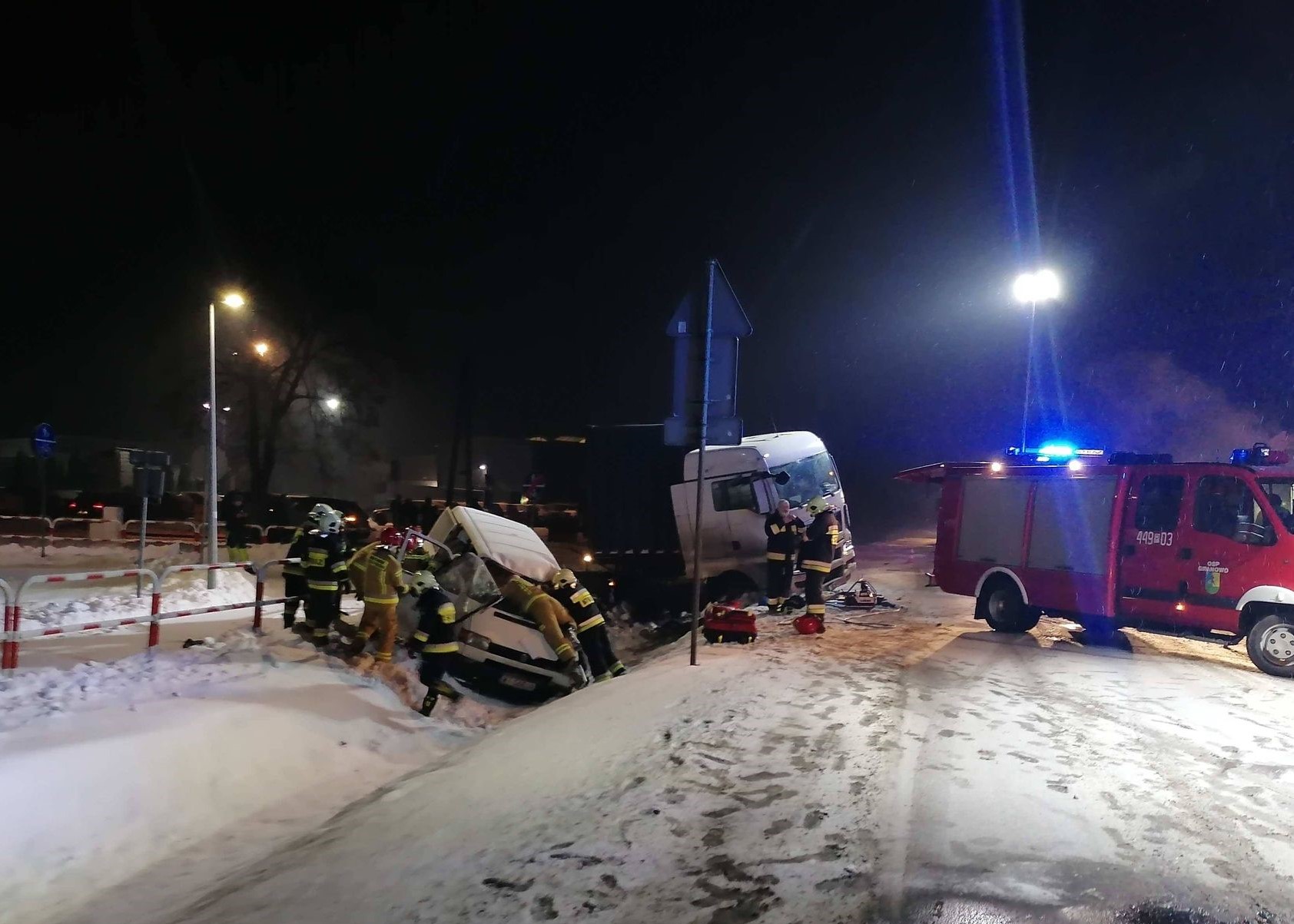 Na miejsce zdarzenia zadsyponowano łacznie 4 zastępy z: Jednostki Ratowniczo - Gaśniczej w Grodzisku Wlkp. i OSP Granowo. Po przybyciu na miejscu zastanowo ciągnik siodłowy z naczepą oraz bus w przydrożnym rowie. Kierowca cięzarówki bez obrażeń opuścił pojazd o własnych siłach. Busem podróżował jedynie kierowca, który był obywatelem Gruzji, pozostawał on ranny w pojeździe. Działania przybyłych jednostek polegały na: zabezpieczeniu miejsca zdarzenia, oświetleniu terenu akcji, użyciu narzędzi hydralicznych co w efekcie pozwoliło w dalszej kolejności umieścić poszkodowanego na desce ortopedycznej i dalej przekazaniu zespołowi ratownictwa medycznego.