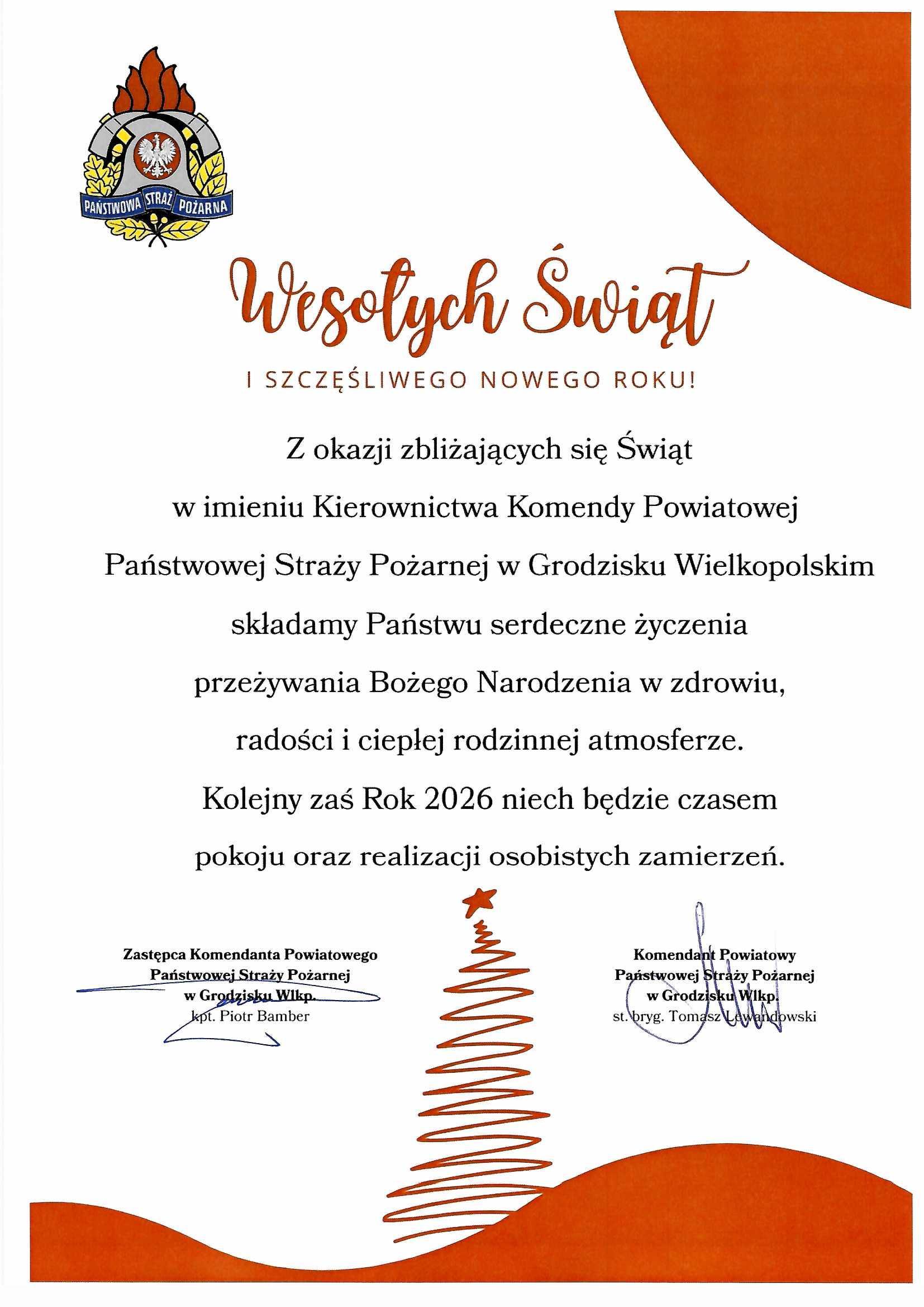 Życzenia świąteczne Komendanta Powiatowego Państwowej Straży Pożarnej w Grodzisku Wlkp.