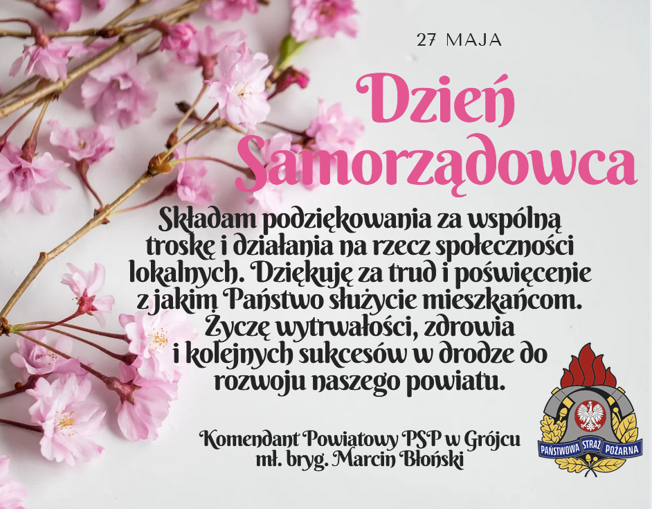 Życzenia Komendanta Powiatowego Państwowej Straży Pożarnej w Grójcu z okazji Dnia Samorządu Terytorialnego w dniu 27 maja 2025 roku: