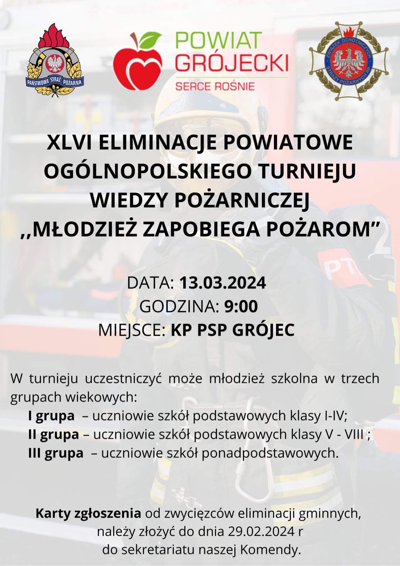 W dniu 13 marca 2024 roku o godz. 9:00 w Komendzie Powiatowej Państwowej Straży Pożarnej w Grójcu odbędą się eliminacje powiatowe turnieju wiedzy pożarniczej. W turnieju może uczestniczyc młodzież szkolna w trzech grupach wiekowych: