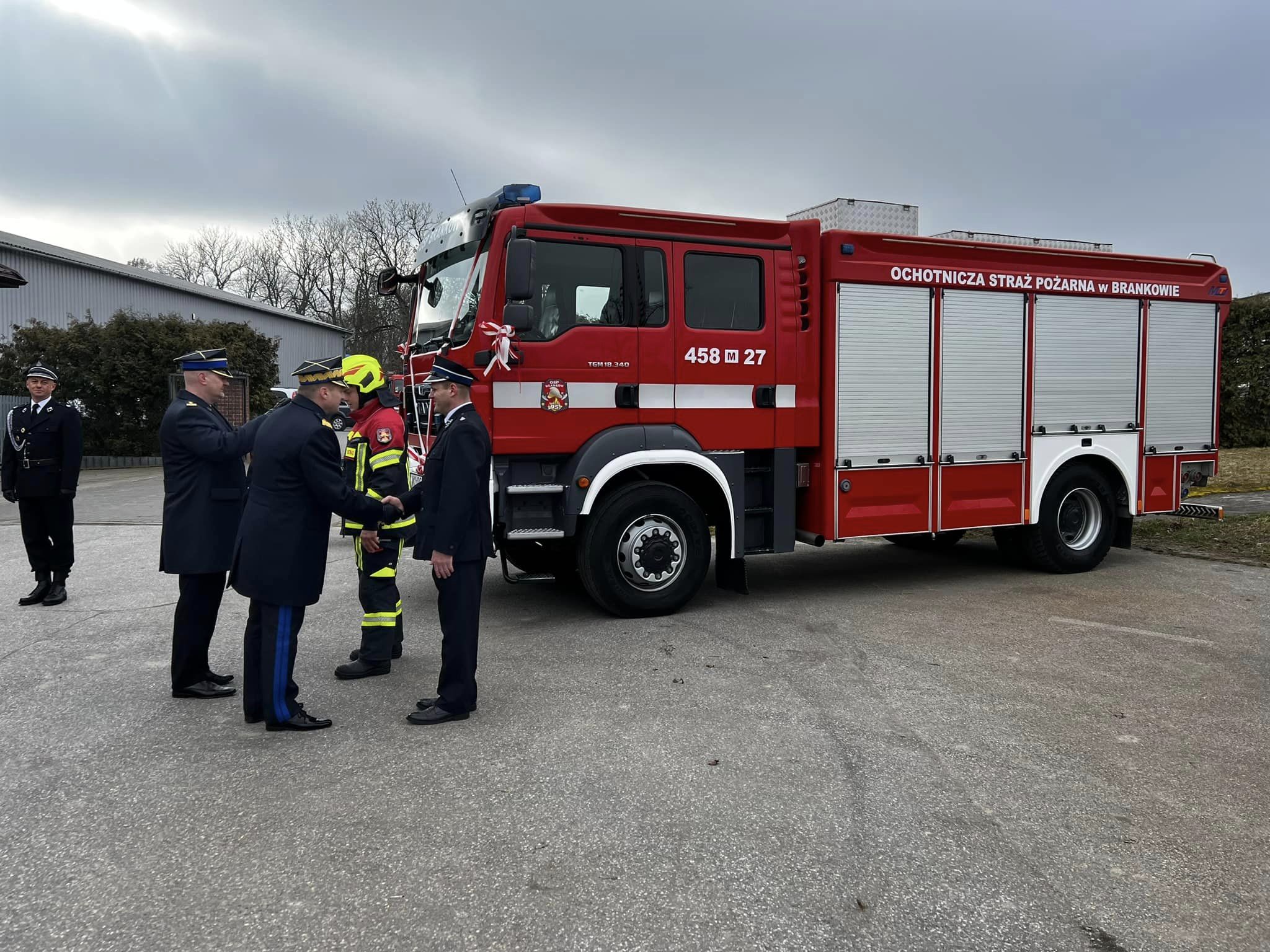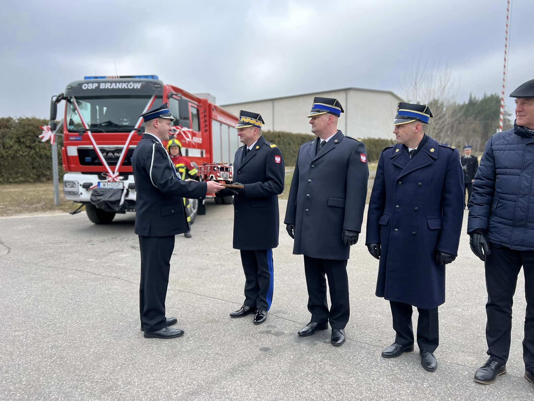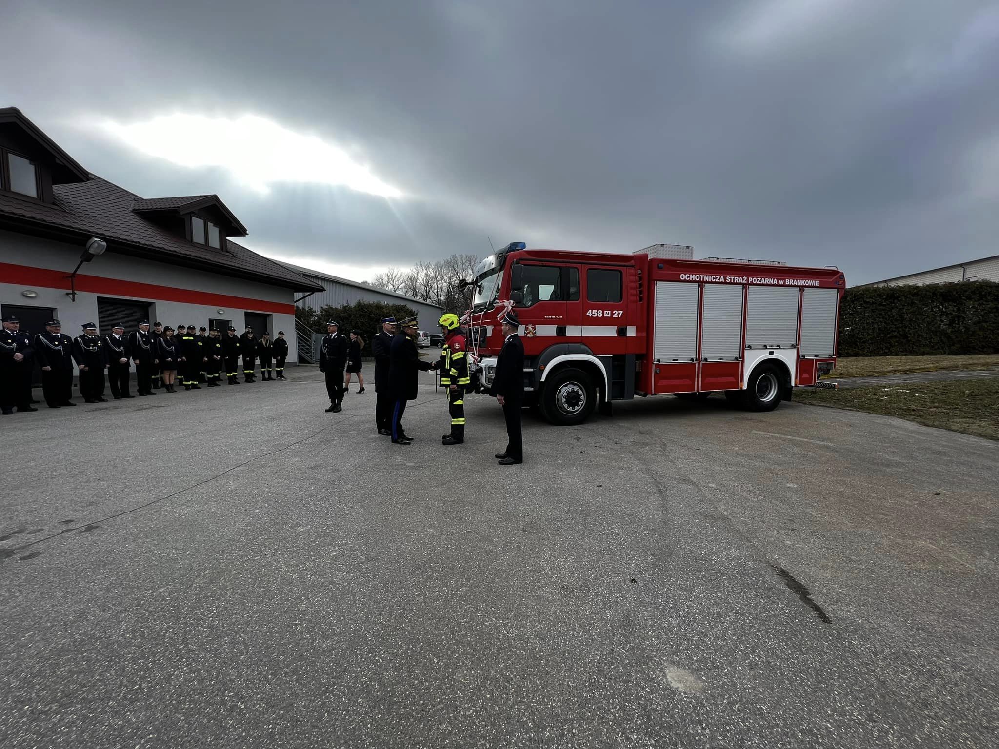 Po przywitaniu przybyłych gości przez Prezesa Ochotniczej Straży Pożarnej w Brankowie Mariusza Kamińskiego nastąpiło uroczyste wręczenie aktu przekazania ciężkiego samochodu ratowniczo - gaśniczego GCBA 5/32 marki MAN dla jednostki OSP Branków.