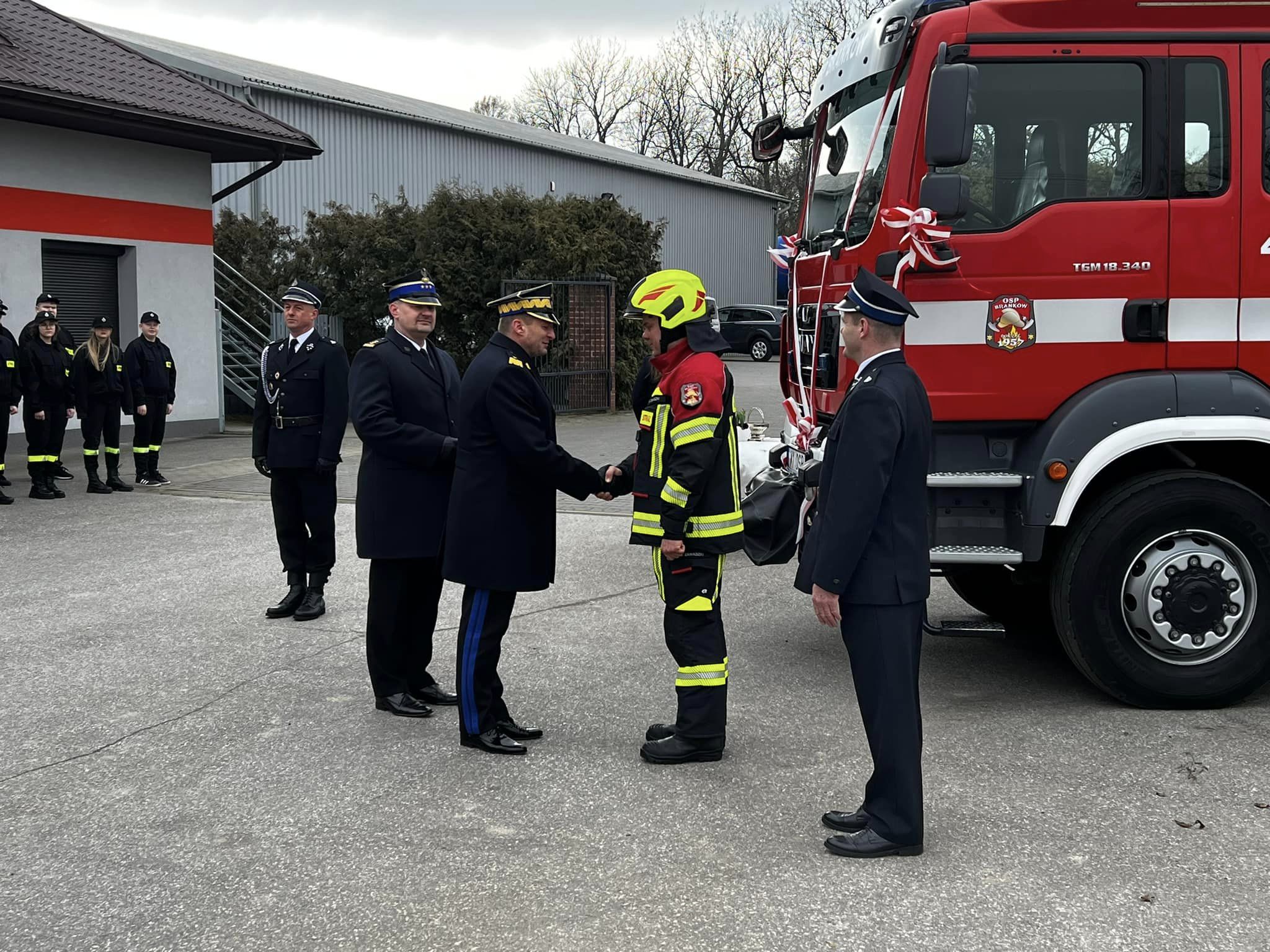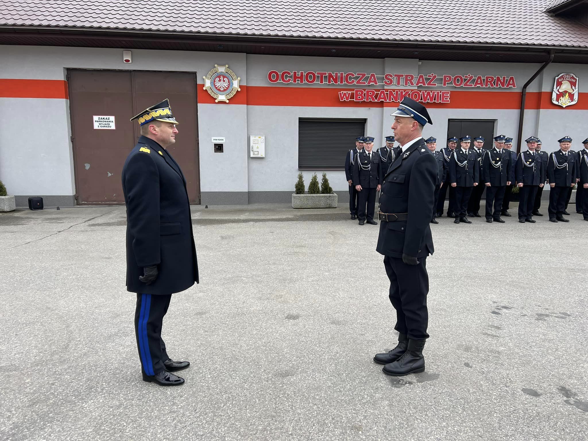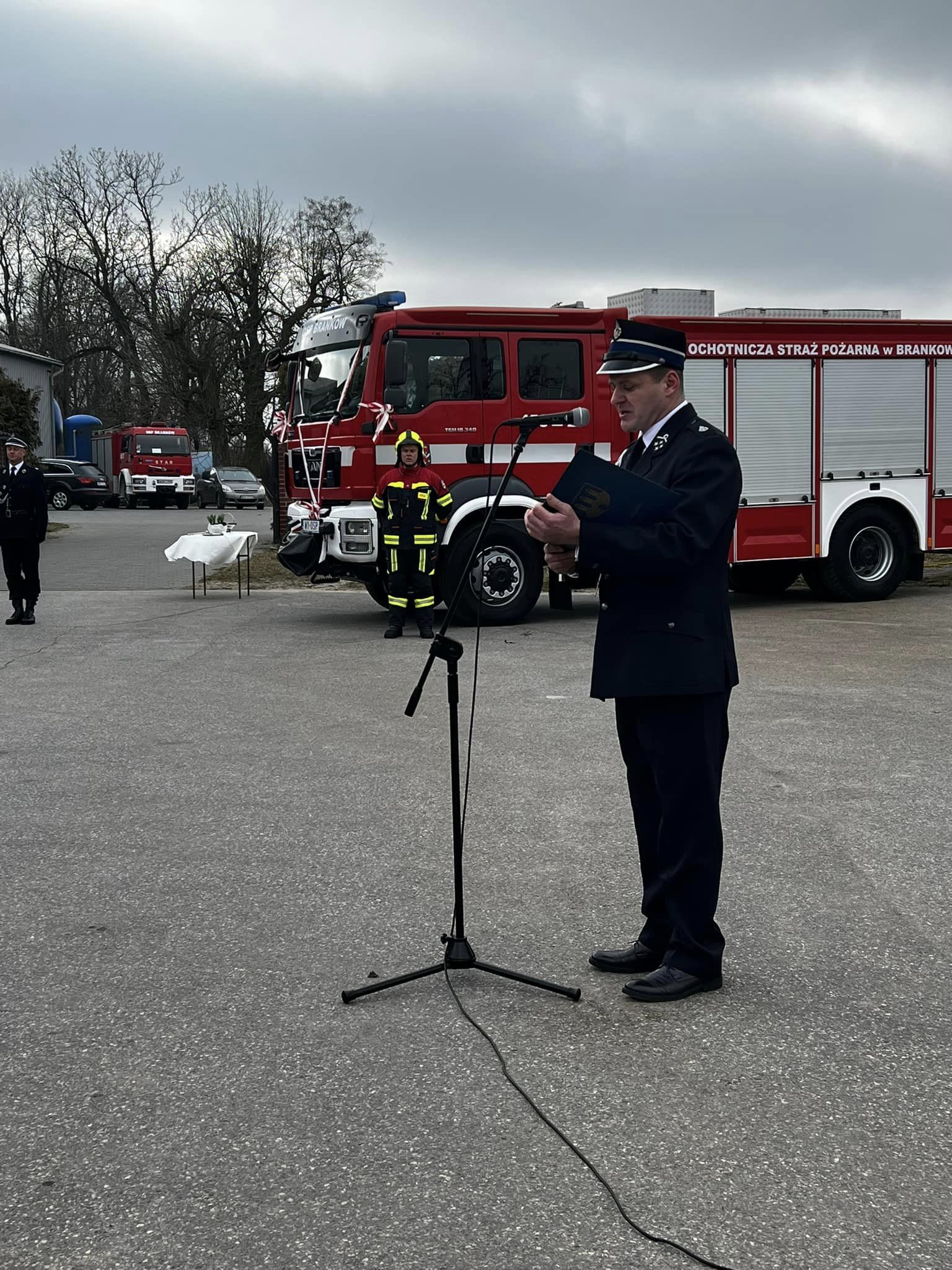 Po przywitaniu przybyłych gości przez Prezesa Ochotniczej Straży Pożarnej w Brankowie Mariusza Kamińskiego nastąpiło uroczyste wręczenie aktu przekazania ciężkiego samochodu ratowniczo - gaśniczego GCBA 5/32 marki MAN dla jednostki OSP Branków.