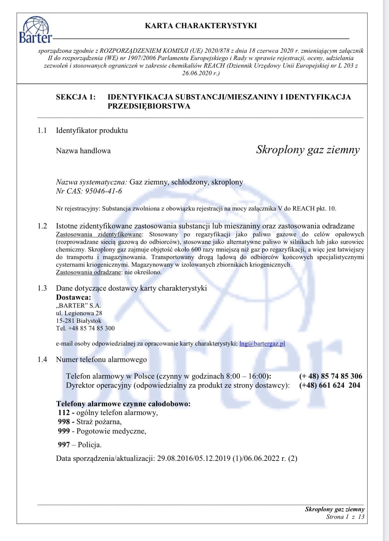 Według Normy Europejskiej EN 1160:1996 skroplony gaz ziemny - LNG to bezbarwny płyn w stanie ciekłym, w którym dominuącym składnikiem jest metan. Może zawierać on niewielkie ilości etanu, propanu, azotu lub innych składników występujących zwykle w gazie ziemnym. Polska Norma PN-EN 1160:2008 bardziej szczegółowo określa zawartość metanu (>75%) i azotu (<5%)