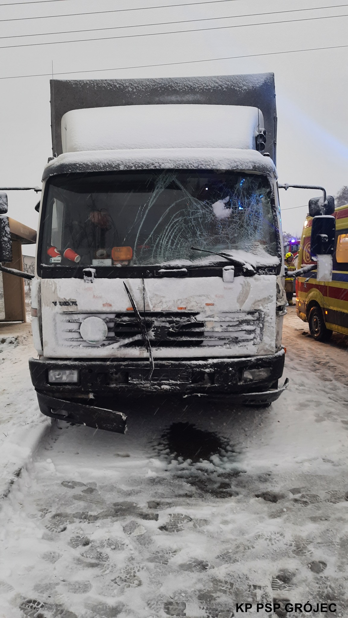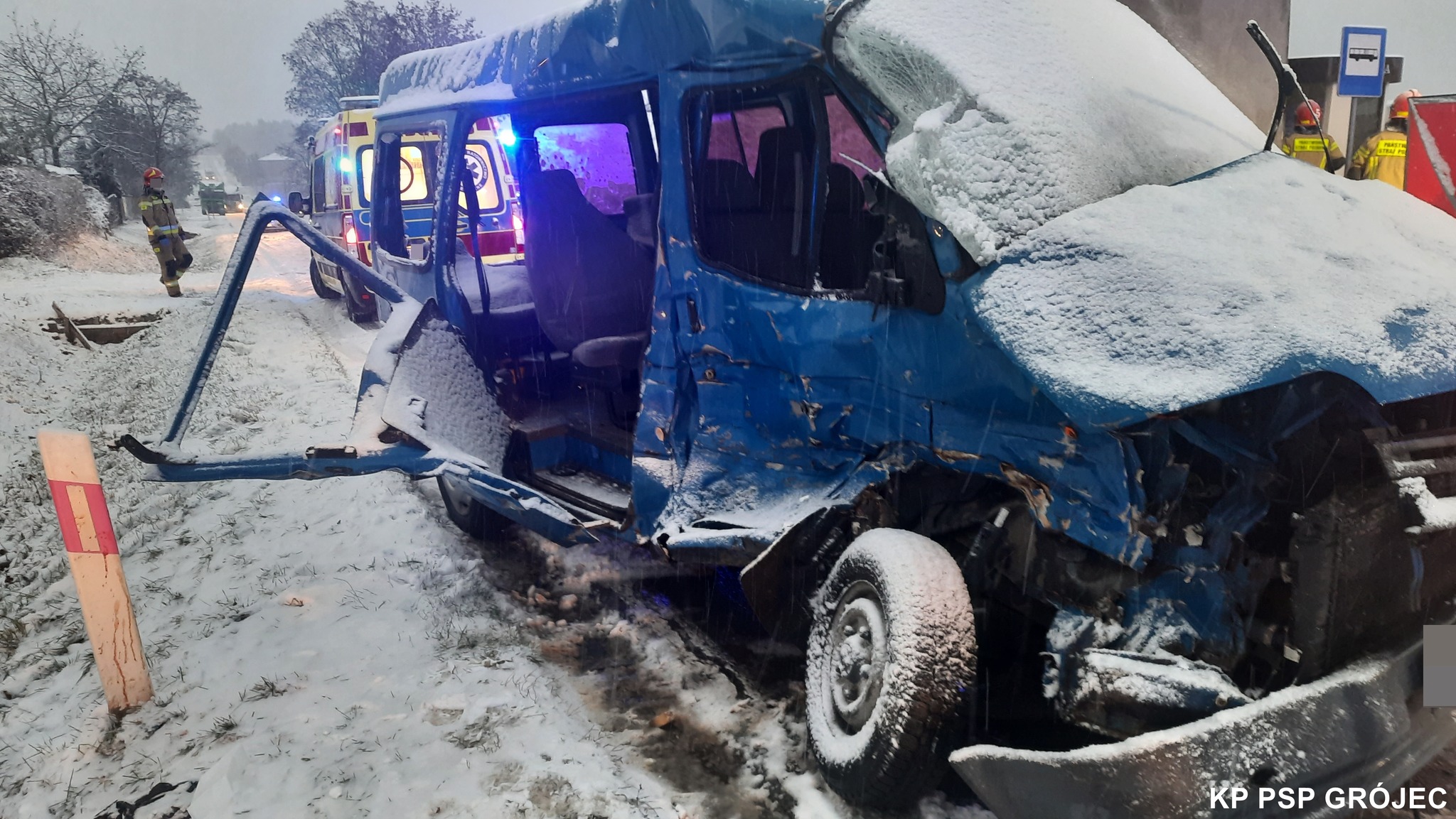 Po dojeździe na miejsce zdarzenia pierwszych zastępów straży zastano zderzenie czołowo-boczne samochodów marki Ford Transit i ciężarowego Volvo. W zdarzeniu poszkodowanych zostało 8 osób w tym jedna poniosła śmierć na miejscu.