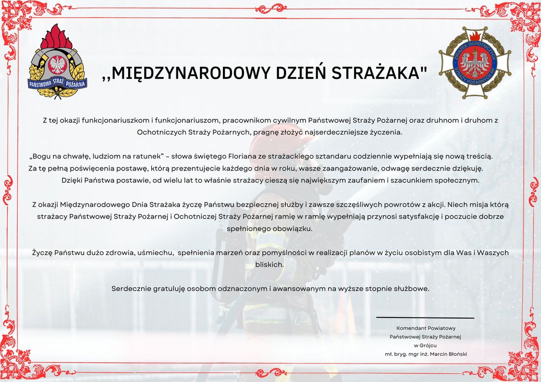Życzenia z okazji Dnia Strażaka od Komendanta Powiatowego Państwowej Straży Pożarnej w Grójcu Zdjęcia (1) Pokaż zdjęcie 1 z galerii.