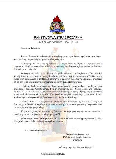 Życzenia Komendanta Powiatowego Państwowej Straży Pożarnej w Grójcu