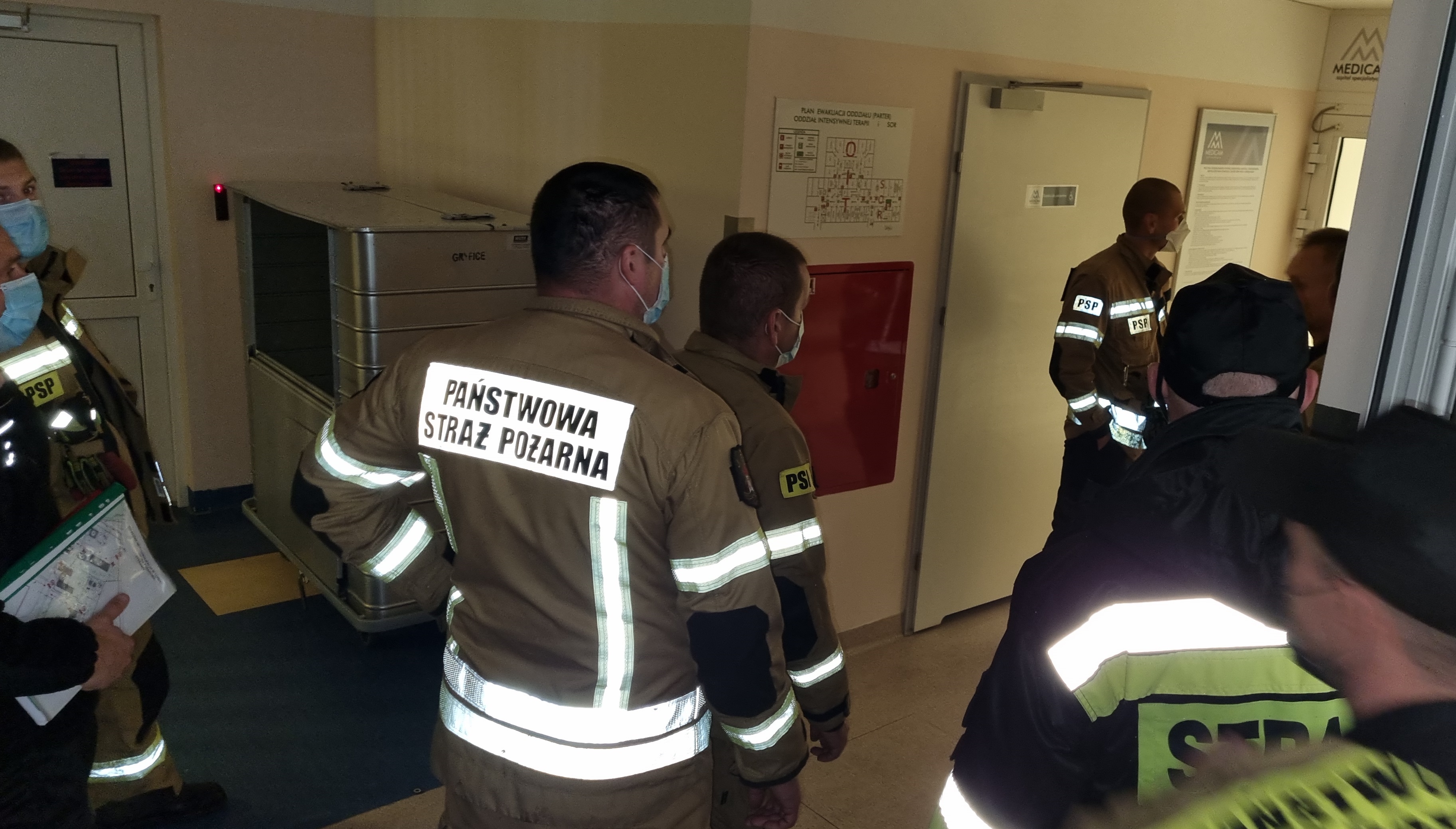 Doskonalono również umiejętności praktyczne podczas akcji ratowniczo-gaśniczych podejmowane w tego typu obiektach, Zapoznano strażaków ze specyfiką zagrożeń występujących w budynku oraz z rozkładem pomieszczeń , dróg ewakuacyjnych, rozmieszczeniem głównych wyłączników prądu itp.