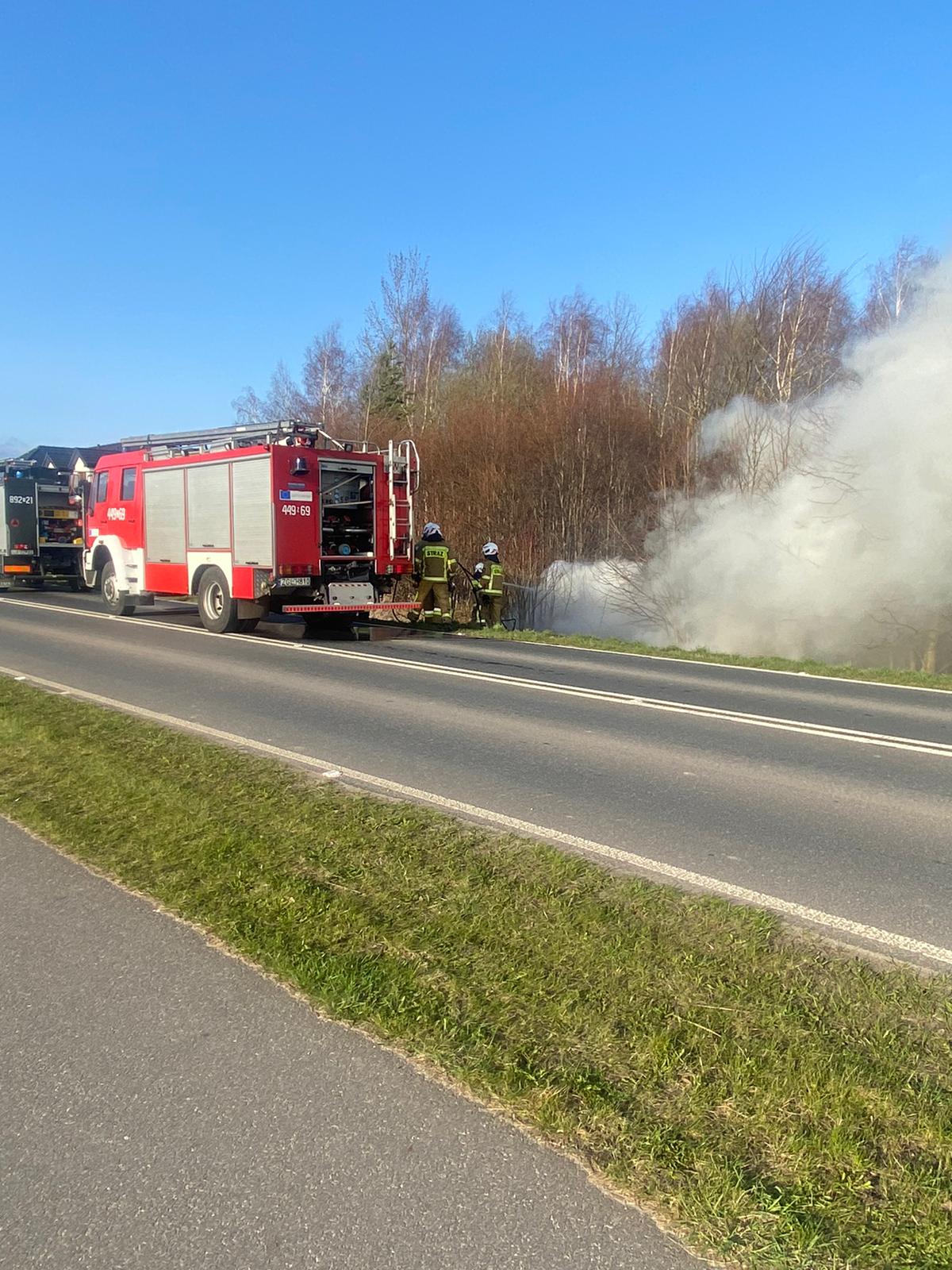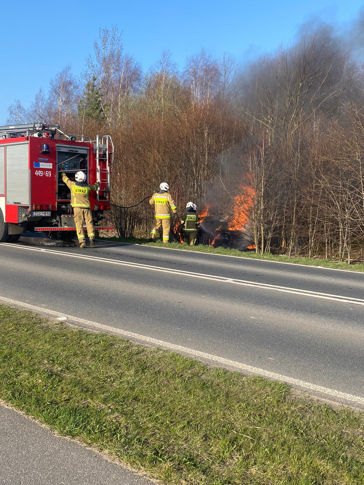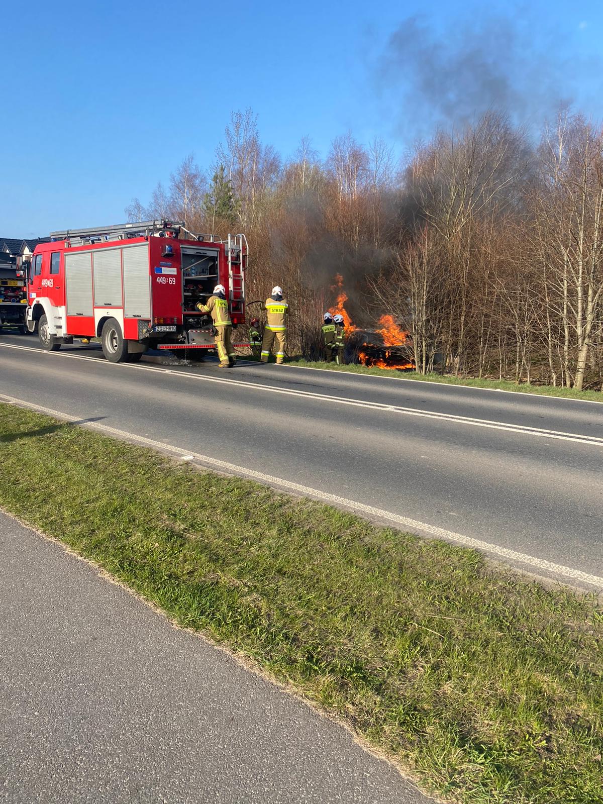 W dniu 04.04.2021r. do SKKP Gryfice wpłynęła informacja o pożarze samochodu osobowego na trasie Trzebiatów - Nowielice. W działaniach brały udział zastępy z OSP Trzebiatów oraz Wojskowej Straży Pożarnej Trzebiatów.