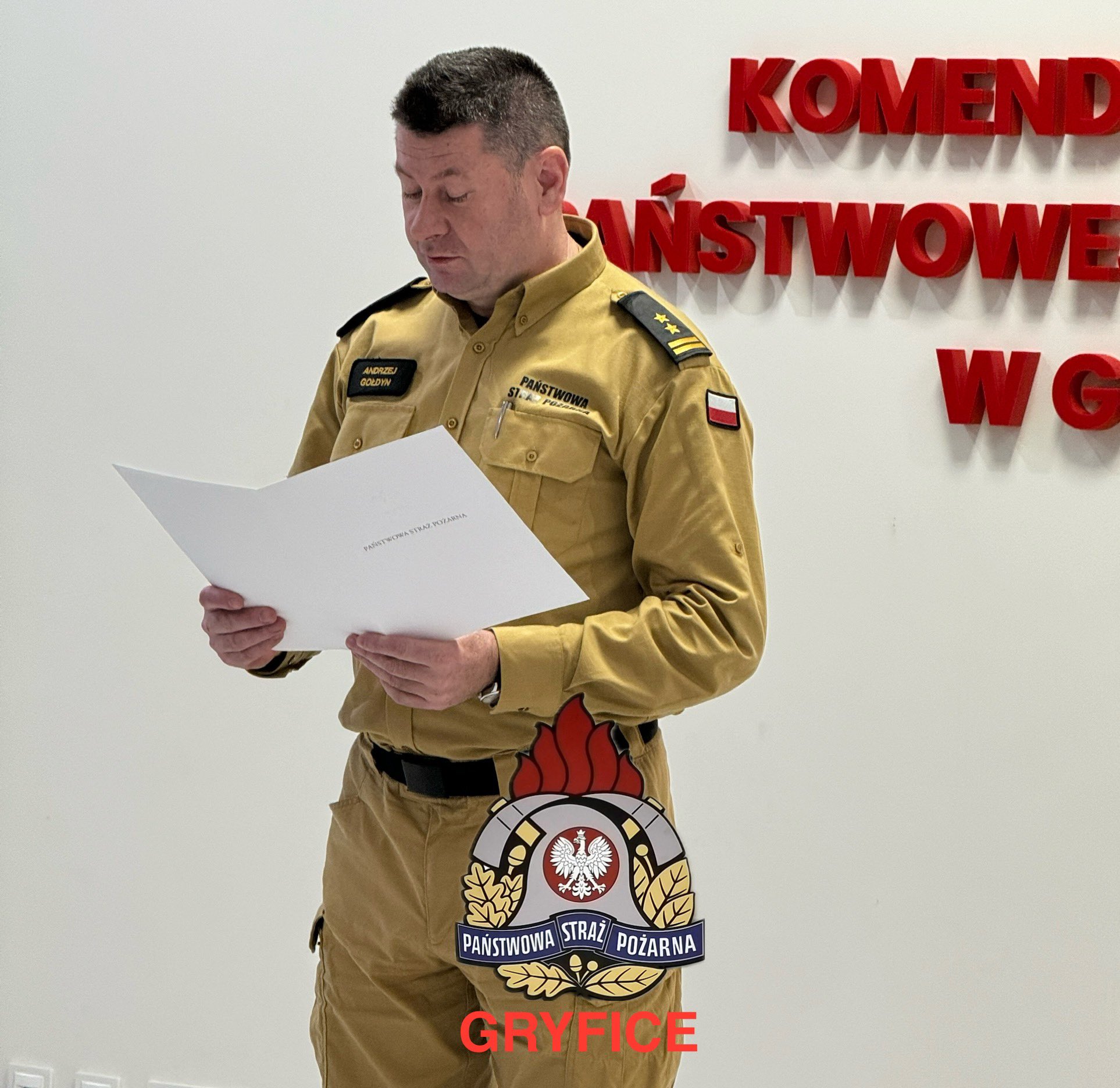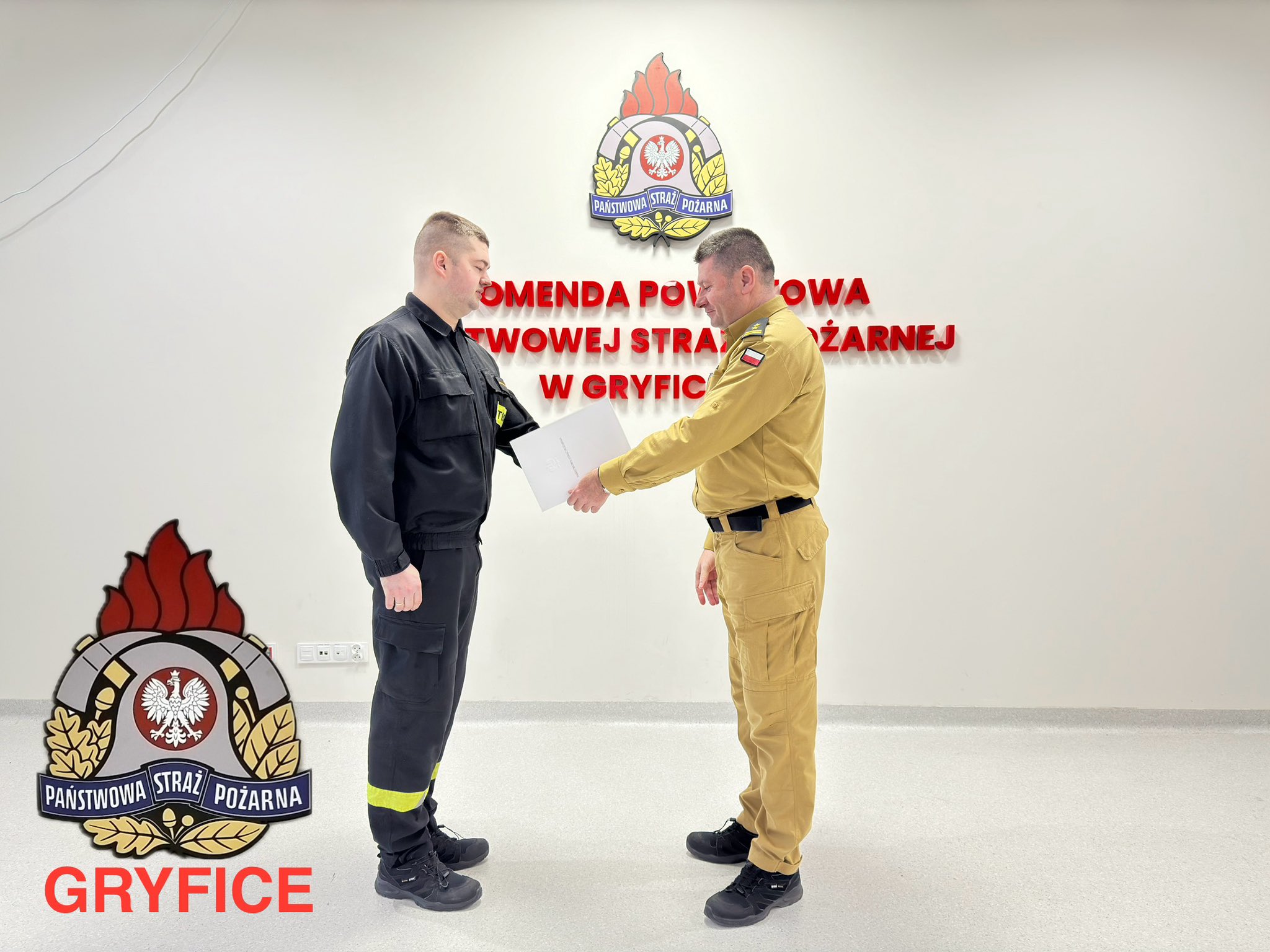 W dniu dzisiejszym Komendant Powiatowy PSP w Gryficach bryg. Andrzej Gołdyn wręczył st.str. Wojciechowi Stosio rozkaz personalny Zachodniopomorskiego Komendanta Wojewódzkiego PSP o nadaniu stopnia sekcyjnego.