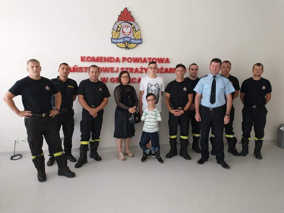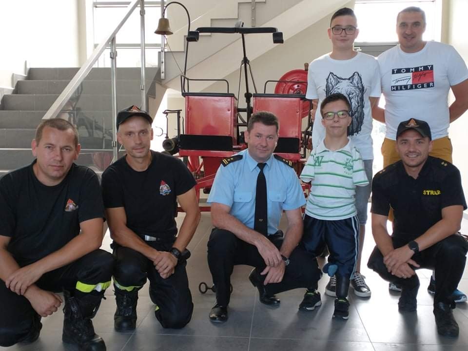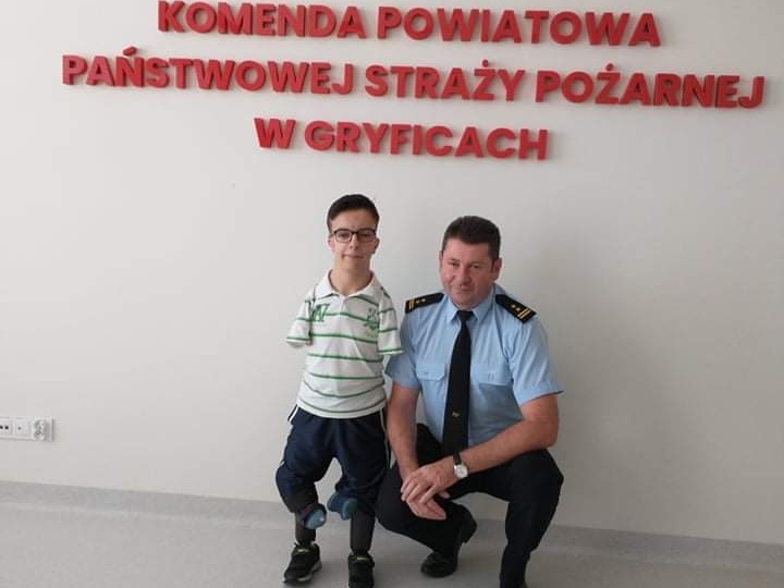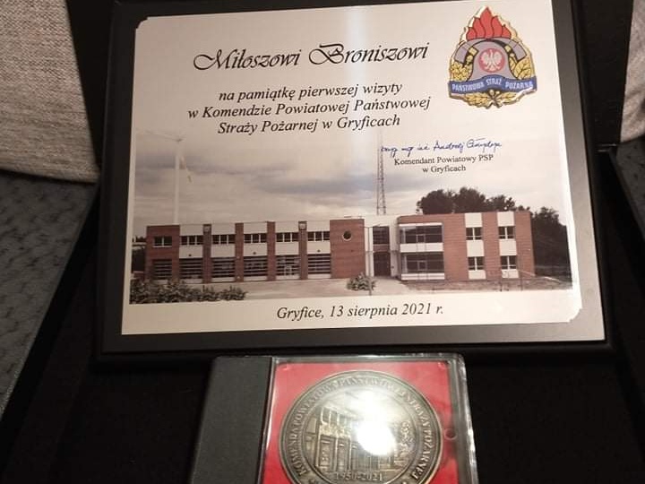 " Hej tu Miłosz! Jako że jeszcze jest wrzesień pozwolę sobie na wspomnienie pewnego spotkania w wakacje. W sierpniu miałem przyjemność odwiedzić Komenda Powiatowa Państwowej Straży Pożarnej w Gryficach, ale właściwie jak do tegoż spotkania doszło? Otóż namalowałem obraz przedstawiający świętego Floriana gaszącego pożar, niestety nie mogłem być na oficjalnym otwarciu komendy, więc zostałem zaproszony na osobną wizytę. Podczas odwiedzin miałem zaszczyt porozmawiać z samym komendantem i zwiedzić każdy zakątek nowo wybudowanej remizy, a także zobaczyć własną pracę w biurze komendanta. Po ukończonym zwiedzaniu pierwszego punktu programu, zostałem zaproszony na odwiedziny do tzw. starej remizy, gdzie mogłem posłuchać ciekawych opowieści sącząc pyszną kawę. Nasze spotkanie zostało jednakże przerwane pożarem, do którego zostali wezwani gospodarze, w końcu strażak zawsze musi być czujny. Bardzo dziękuję za zaproszenie i możliwość odwiedzenia obu remiz i wypicie dobrej kawy