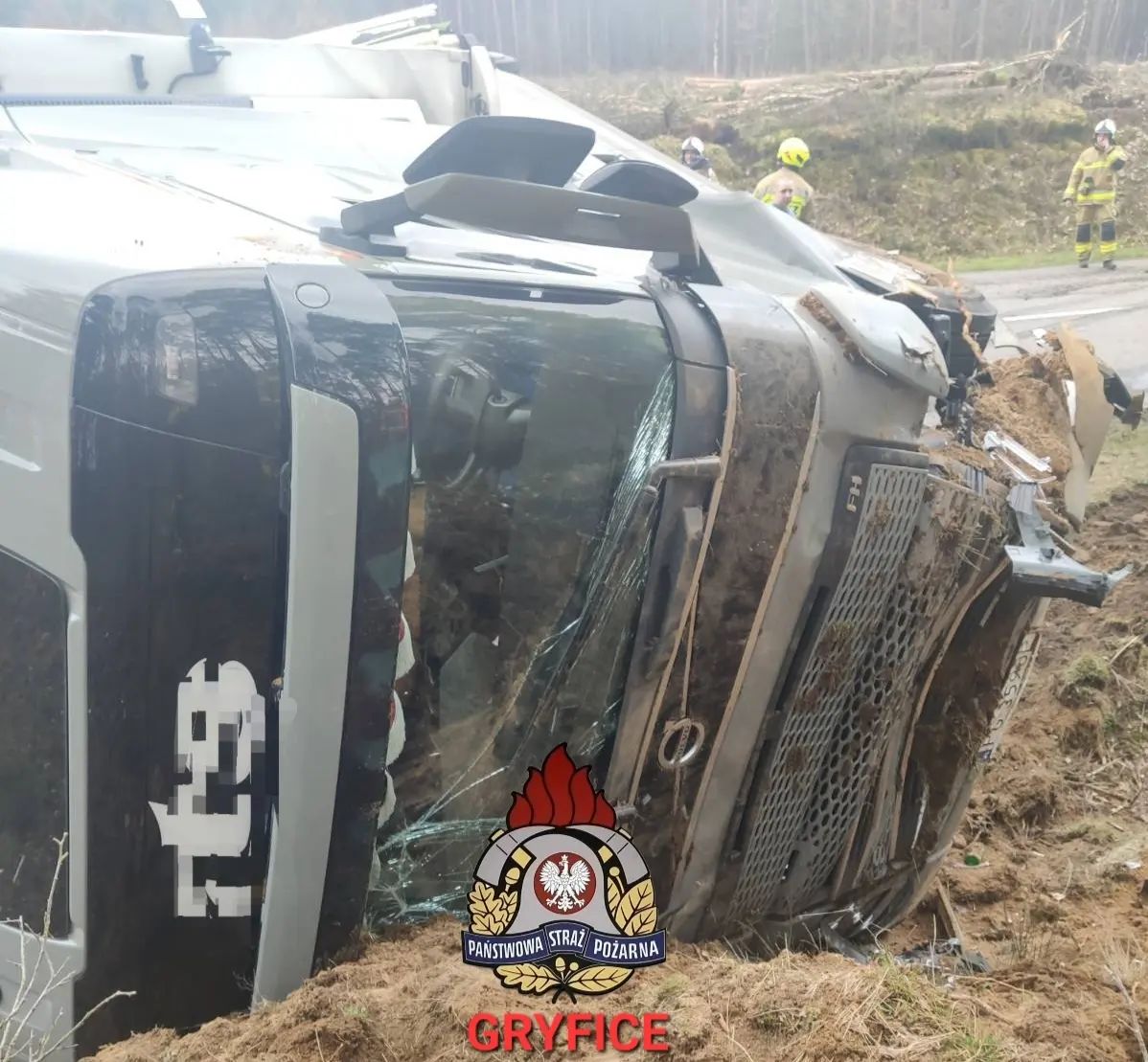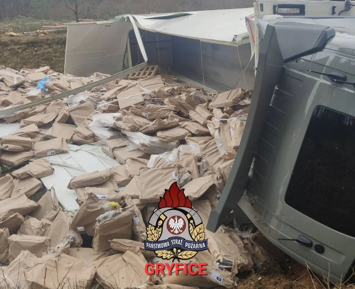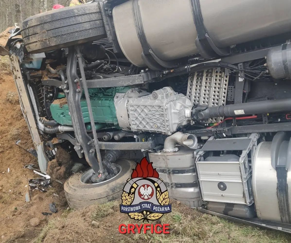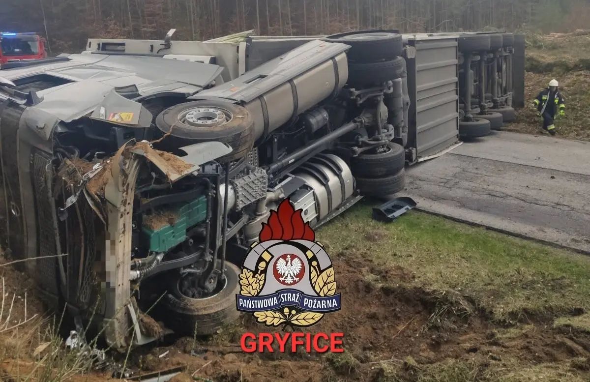 Godz.11:36 DW108 23,5 km Truskolas - Unibórz - przewrócona ciężarówka z naczepą. Droga nieprzejezdna. Brak osób poszkodowanych. W działaniach brały udział zastępy z JRG PSP Gryfice, JRG PSP Kamień Pomorski, OSP Ościęcin, OSP Płoty, OSP Golczewo.