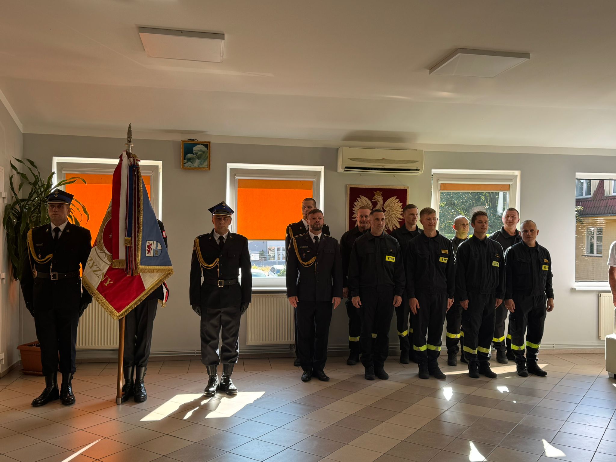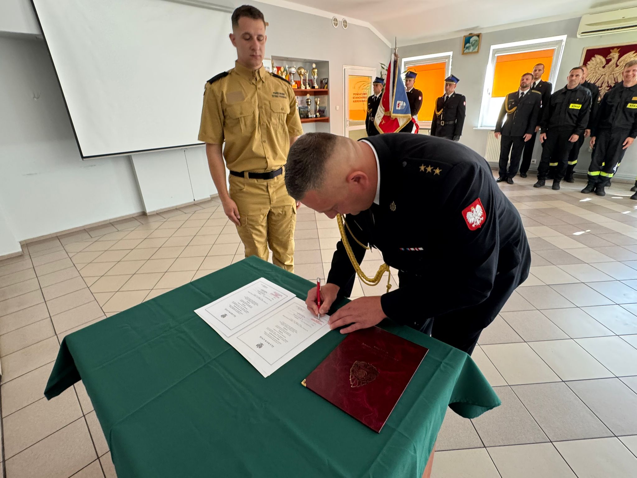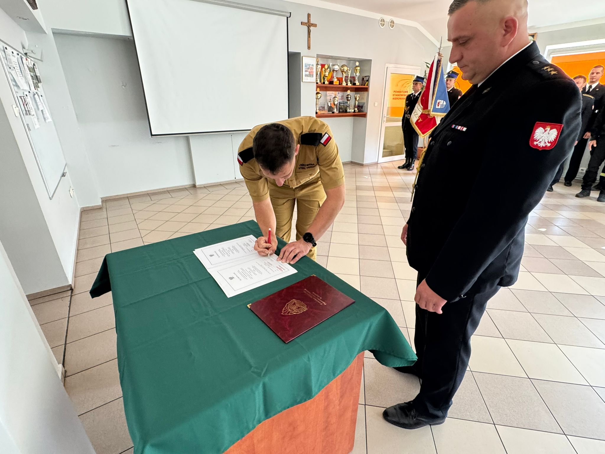 To fragment roty ślubowania strażaka Państwowej Straży Pożarnej, które złożył dzisiaj nowoprzyjęty str. Wojciech Swojnóg. Funkcjonariusz wypowiedział te słowa na sztandar Komendy Powiatowej Państwowej Straży Pożarnej w Gryfinie w obecności nowych koleżanek i kolegów na czele z Zastępcą Komendanta Powiatowego Państwowej Straży Pożarnej w Gryfinie kpt. Danielem Kałużniakiem.
