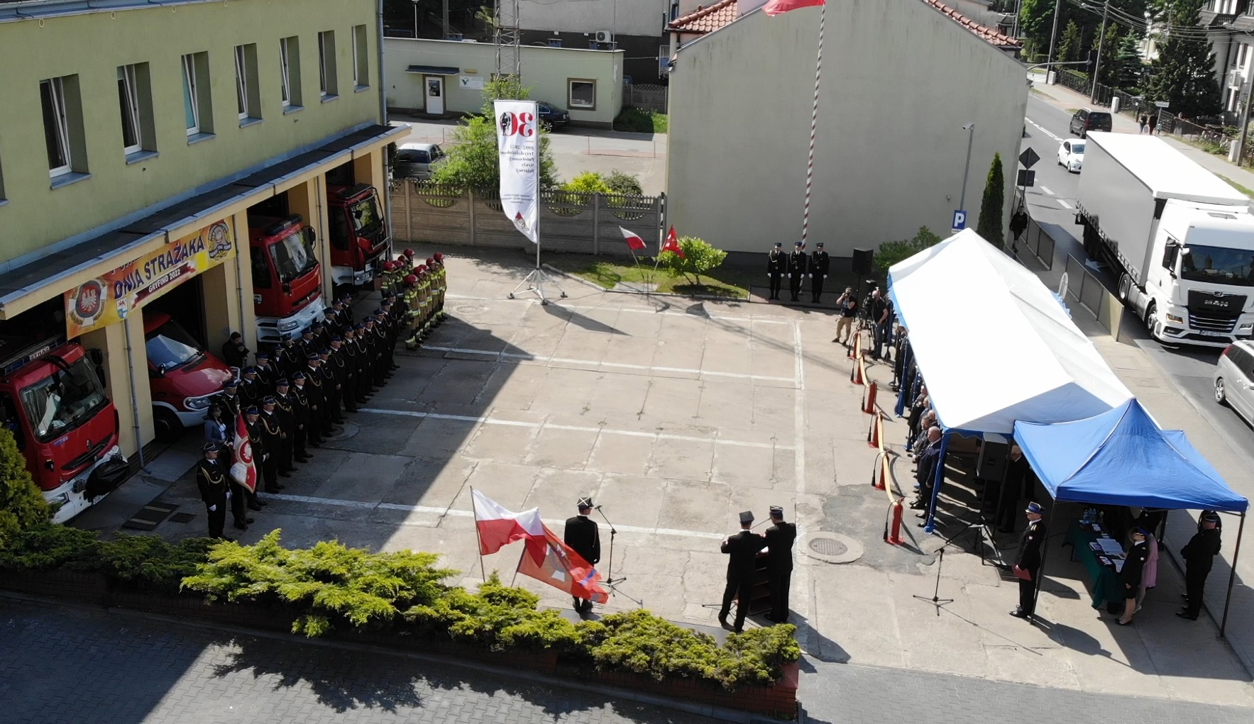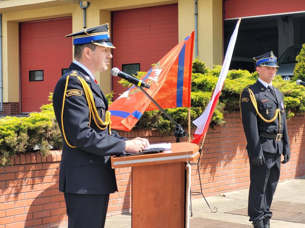 Uroczystość rozpoczęła się od złożenia meldunku Zastępcy Zachodniopomorskiego Komendanta Wojewódzkiego PSP w Szczecinie st. bryg. Markowi Popławskiemu przez dowódcę uroczystości kpt. Macieja Łempickiego.