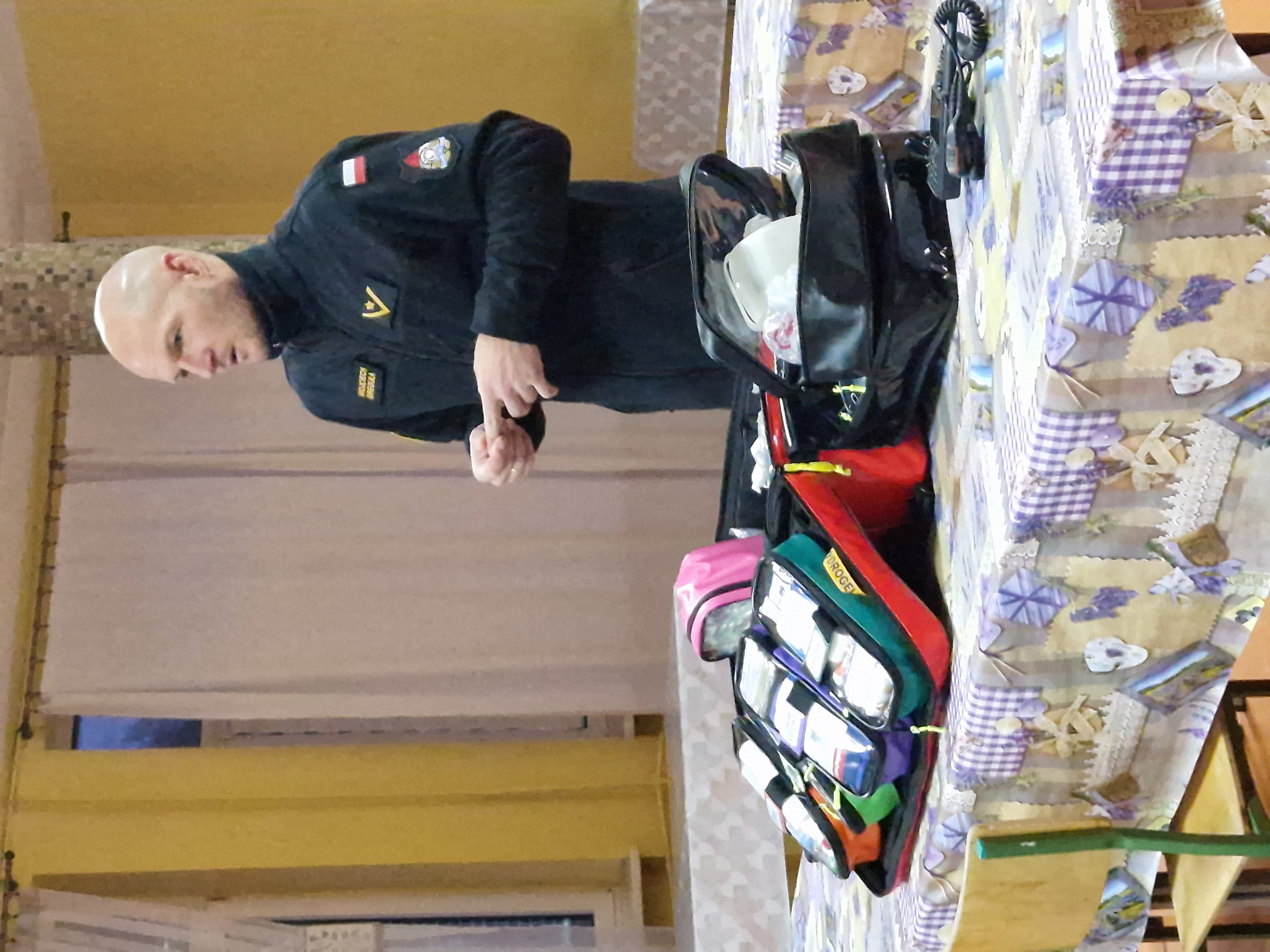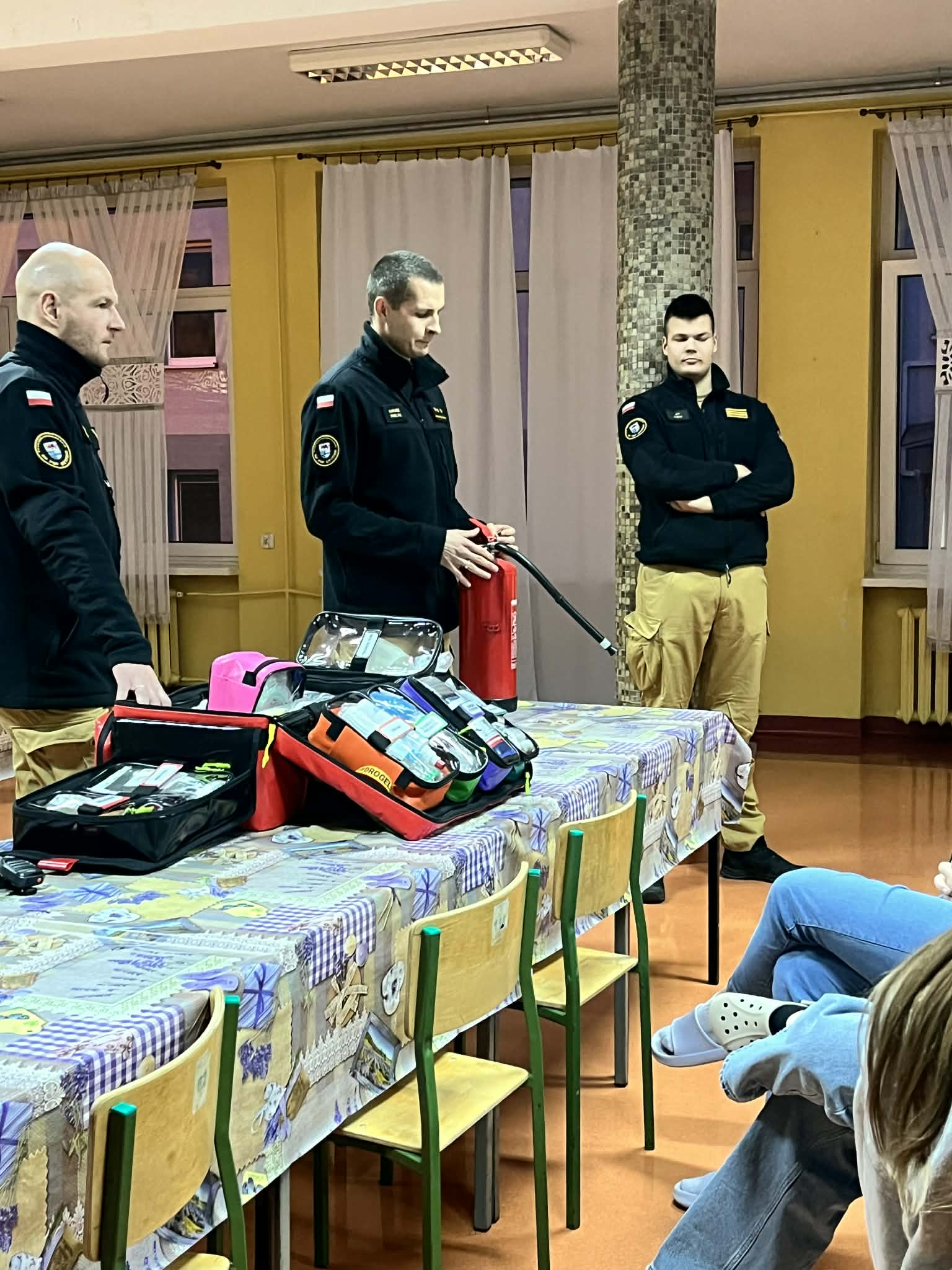 Funkcjonariusze poruszyli zagadnienia dotyczące ewakuacji, bezpieczeństwa przeciwpożarowego budynków, użycia podręcznego sprzętu gaśniczego oraz pierwszej pomocy.