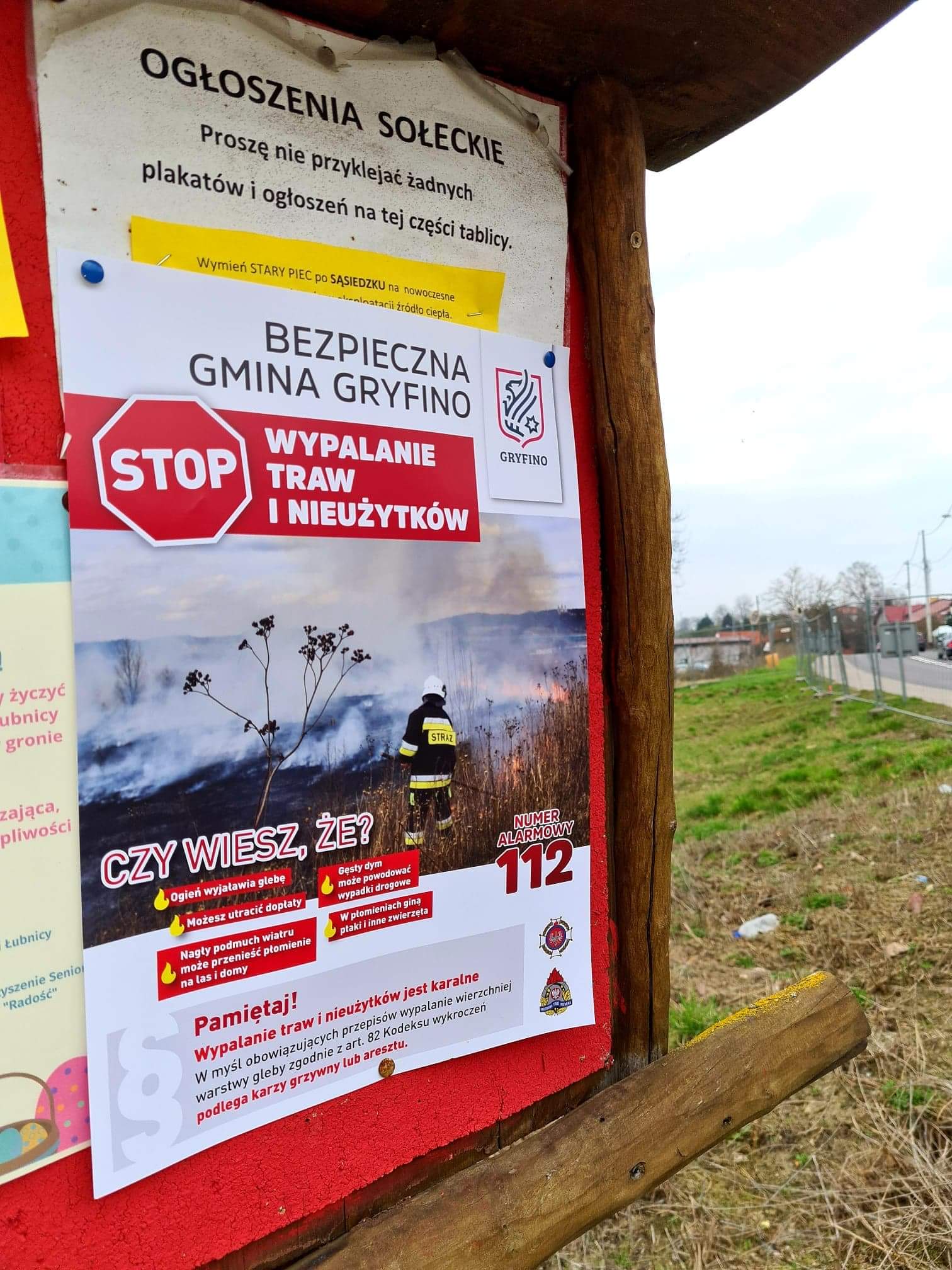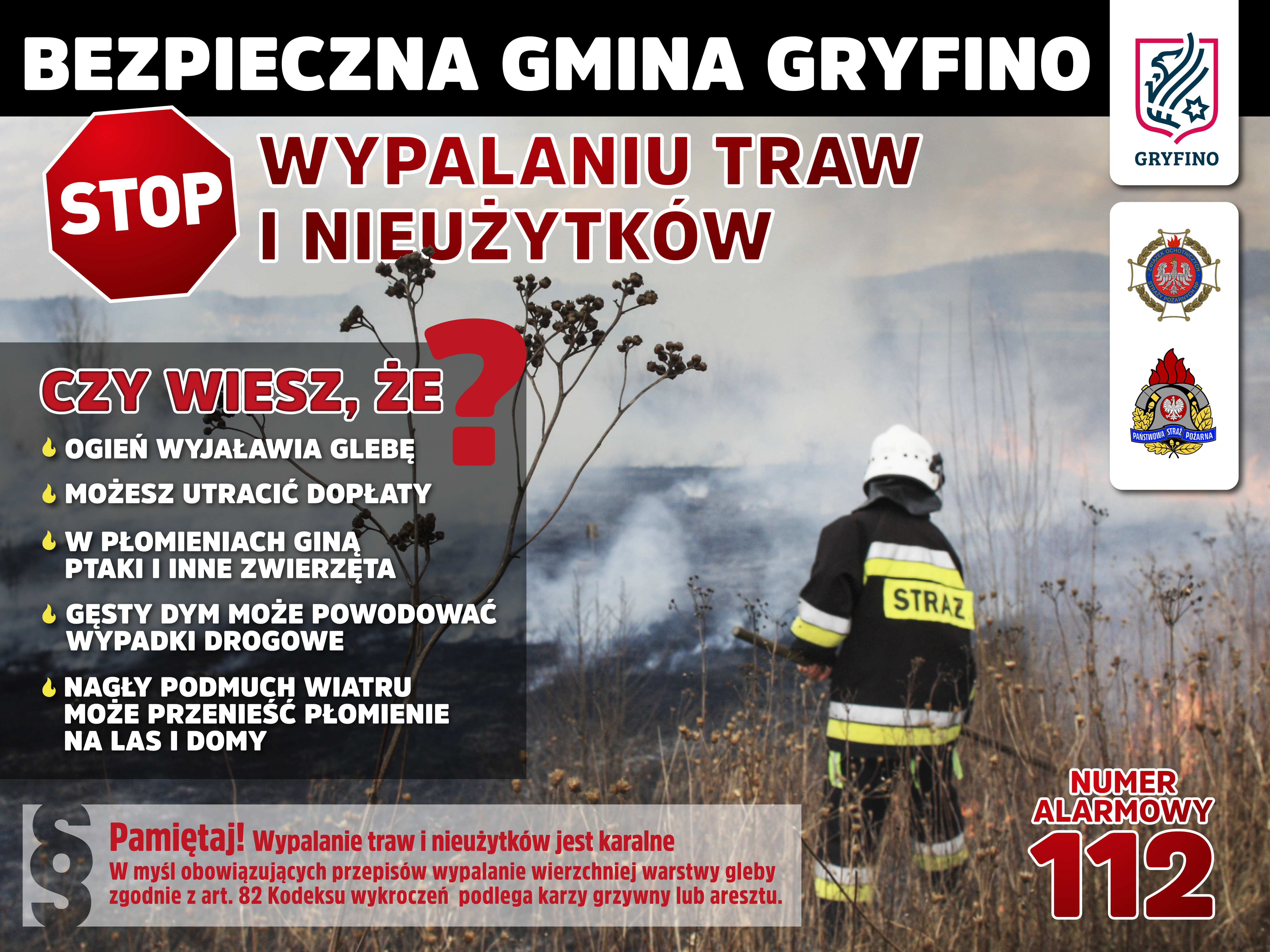Referat Spraw Społecznych i Gminne Centrum Zarządzania Kryzysowego Urzędu Miasta i Gminy w Gryfinie, Komenda Powiatowa Państwowej Straży Pożarnej w Gryfinie oraz Jednostki Ochotniczych Straży Pożarnych Gminy Gryfino prowadzą działania informacyjne związane z wypalaniem traw i nieużytków. Głównym celem akcji jest informowanie