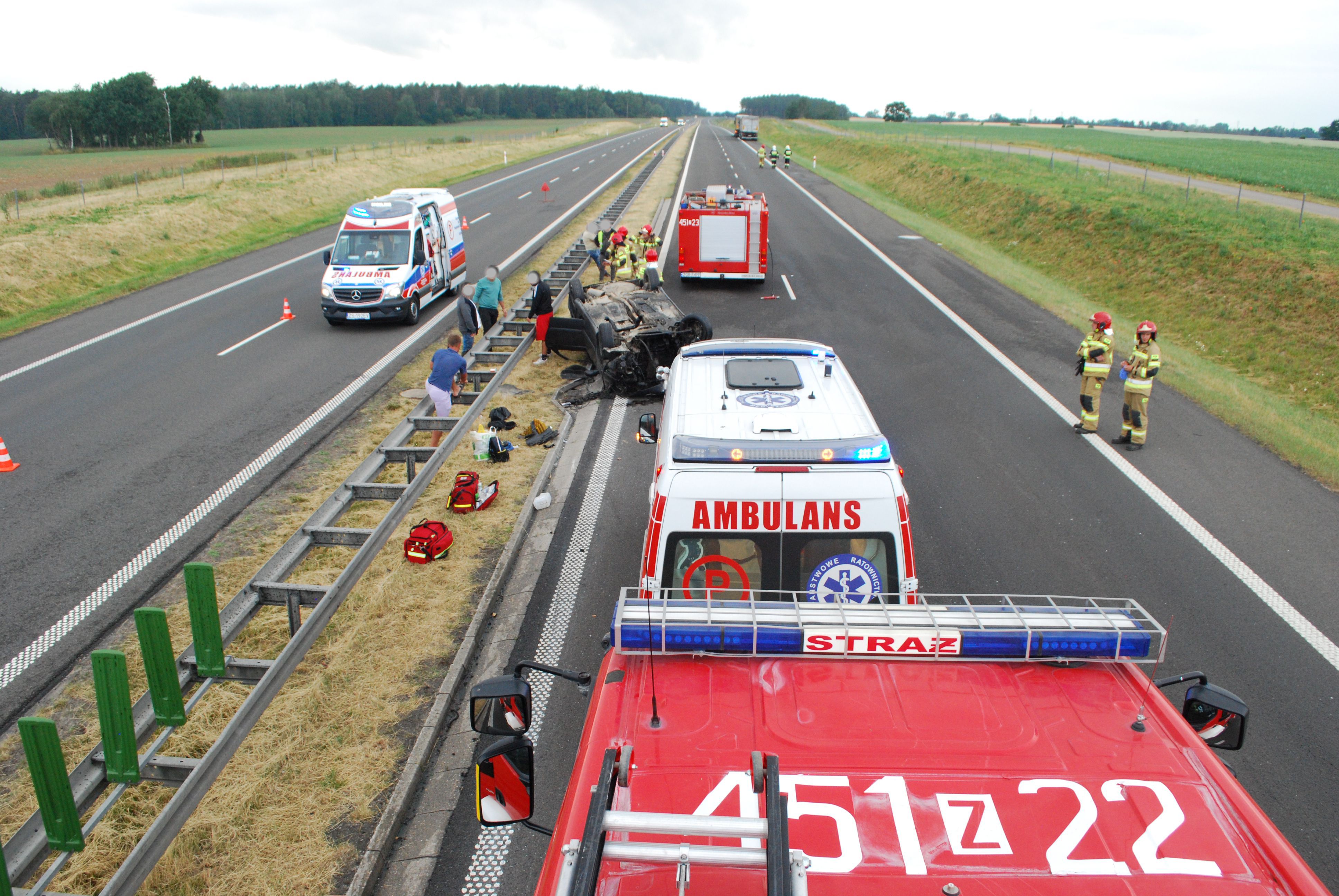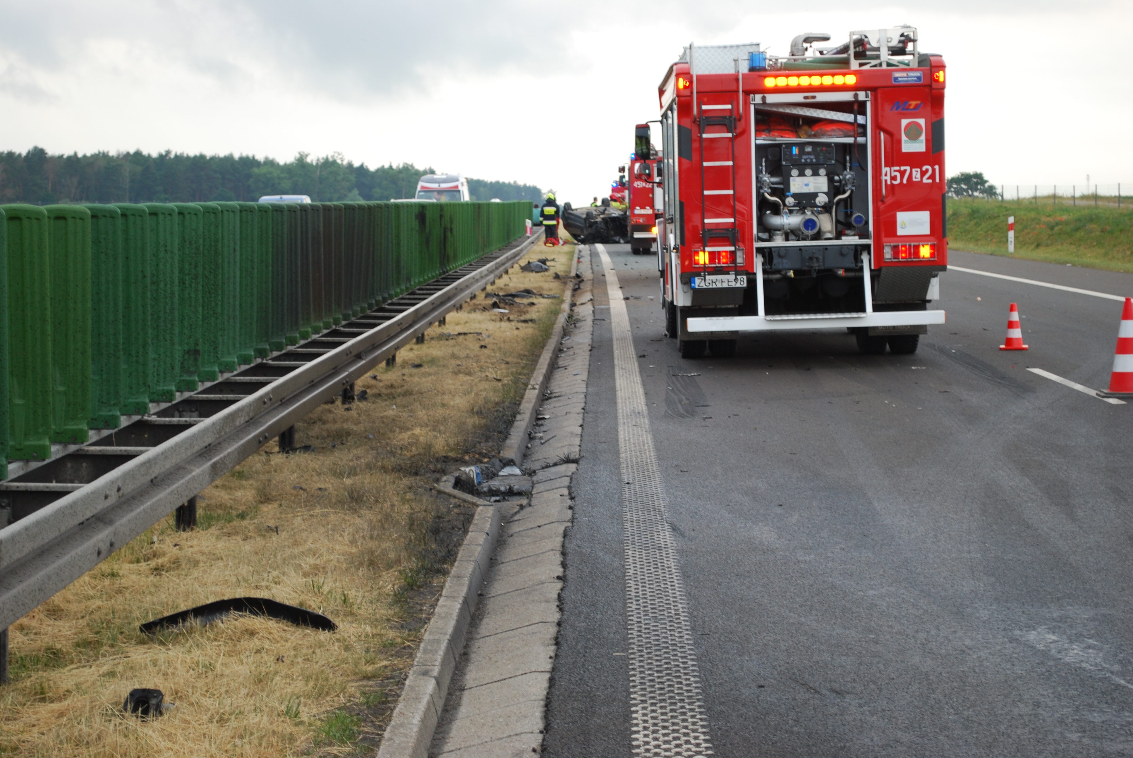 Działania strażaków polegały na zabezpieczeniu miejsca zdarzenia oraz wstrzymaniu ruchu drogowego na pasie w kierunku Szczecina. Następnie odłączono zasilanie w uszkodzonym pojeździe i znautralizowano płyny eksploatacyjne wspólnie z zarządcą drogi.