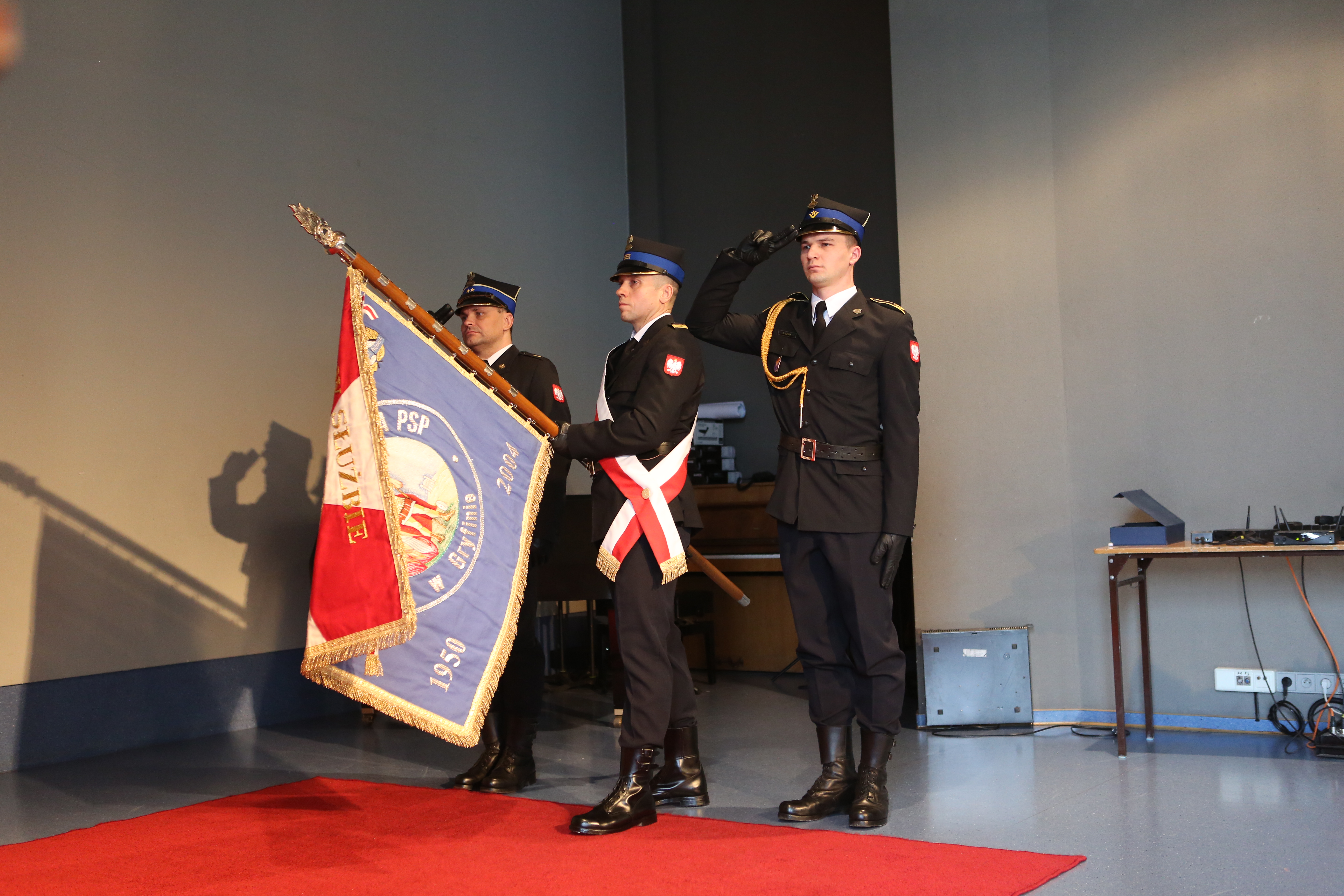 Następnie dokonano wprowadzenia Sztandaru Komendy Powiatowej PSP w Gryfinie, po czym wspólnie odśpiewano Hymn Państwowy.