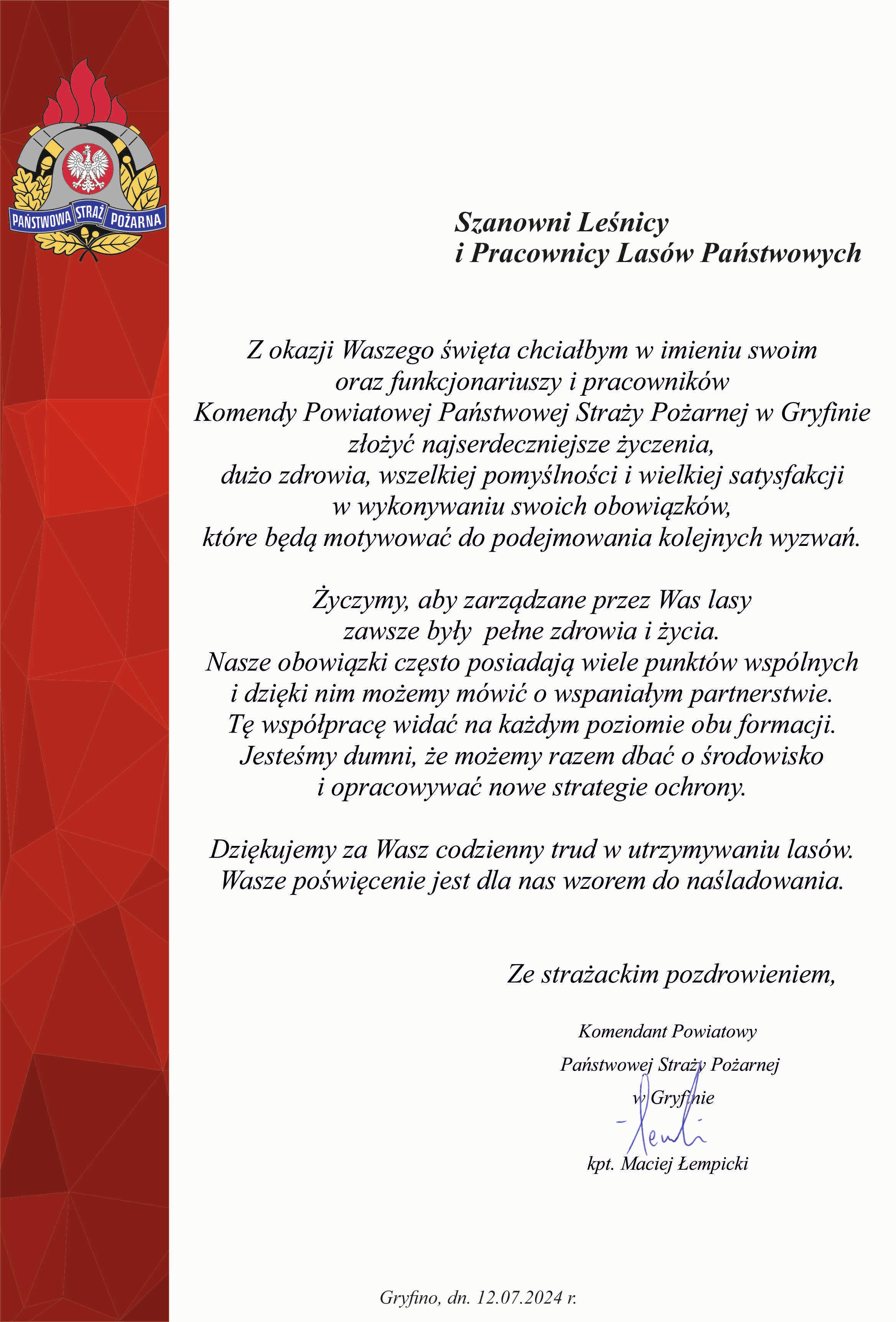 Z okazji Waszego święta chciałbym w imieniu swoim oraz funkcjonariuszy i pracowników Komendy Powiatowej Państwowej Straży Pożarnej w Gryfinie złożyć najserdeczniejsze życzenia, dużo zdrowia, wszelkiej pomyślności i wielkiej satysfakcji w wykonywaniu swoich obowiązków, które będą motywować do podejmowania kolejnych wyzwań. Życzymy, aby zarządzane przez Was lasy zawsze były pełne zdrowia i życia.