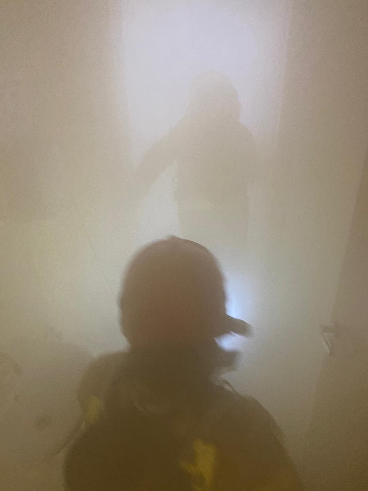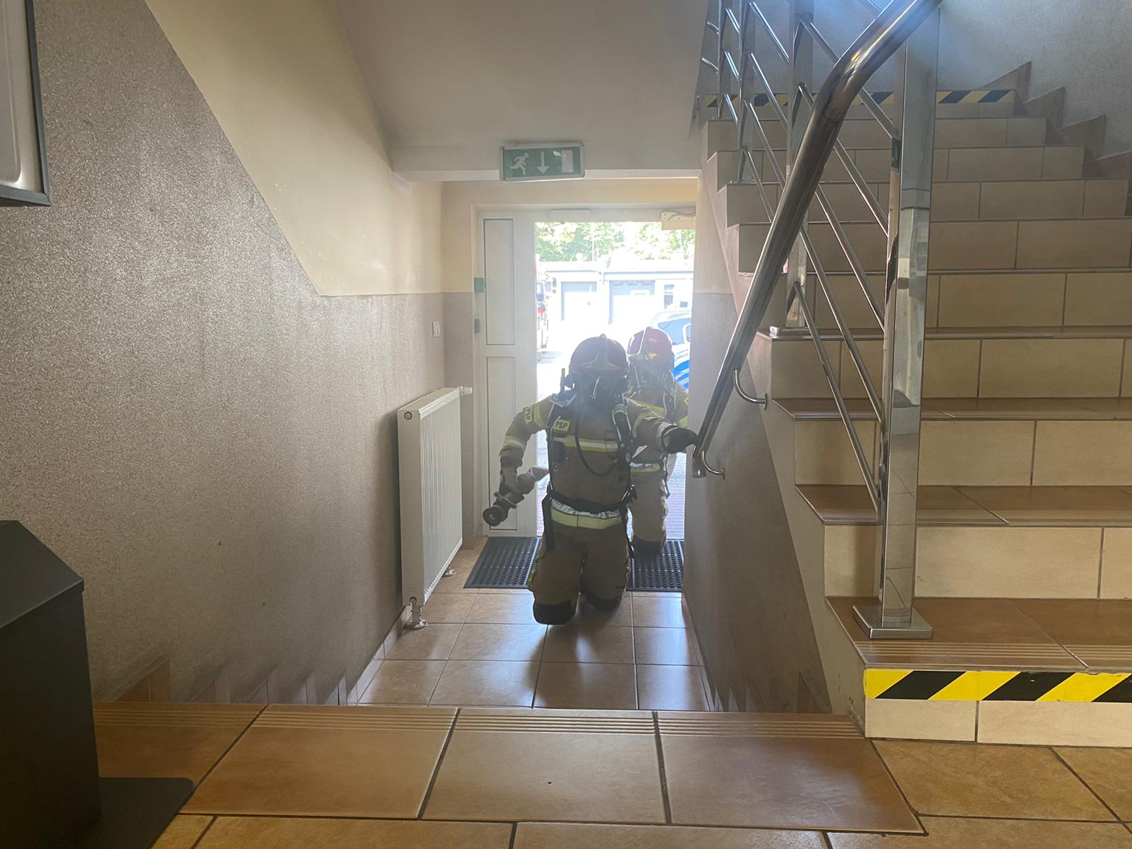 Na parterze budynku komendy zauważono silne zadymienie. O zdarzeniu została powiadomiona straż pożarna. Pracownicy Komendy ewakuowali się na miejsce zbiorki na zewnątrz budynku. Po przybyciu zastępów straży pożarnej na miejsce zdarzenia, zarządca budynku przekazał Kierującemu Działaniem Ratowniczym, że według jego ustaleń jedna osoba pozostała w budynku. KDR podjął decyzję o wprowadzeniu do budynku roty gaśniczej w sprzęcie ochrony układu oddechowego. Podczas przeszukiwania budynku ustalono, że pożarem objęte jest jedno pomieszczenie. Po zlokalizowaniu źródła pożaru i jego ugaszeniu kontynuowano przeszukiwanie. W łazience na pierwszym piętrze odnaleziono osobę poszkodowaną. Podjęto decyzję o jej ewakuacji przez okno przy pomocy podnośnika hydraulicznego. Poszkodowana osoba została przekazana przybyłemu na miejsce Zespołowi Ratownictwa Medycznego.