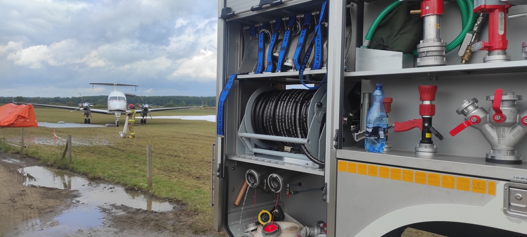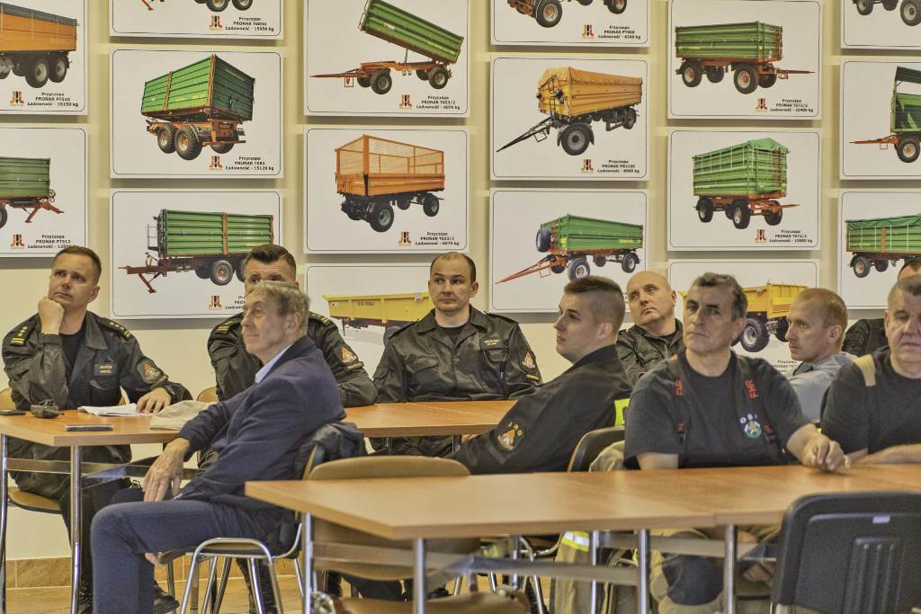 Ostatnim elementem ćwiczeń była część teoretyczna podczas której szczegółowo zostały przedstawione elementy bezpieczeństwa, sposoby ewakuacji oraz występujące zagrożenia w różnych samolotach będących własnością firmy Pronar.
