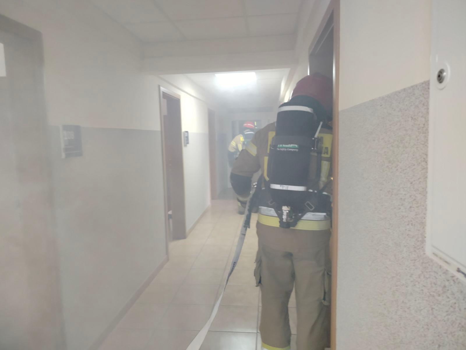 Po przybyciu zastępów straży pożarnej na miejsce zdarzenia, zarządca budynku przekazał Kierującemu Działaniem Ratowniczym, że według jego ustaleń jedna osoba pozostała w budynku. Kierujący Działaniem Ratowniczym podjął decyzję o wprowadzeniu do budynku roty gaśniczej w sprzęcie ochrony układu oddechowego. Podczas przeszukiwania budynku ustalono, że pożarem objęte jest jedno pomieszczenie. Po zlokalizowaniu źródła pożaru i jego ugaszeniu kontynuowano przeszukiwanie.