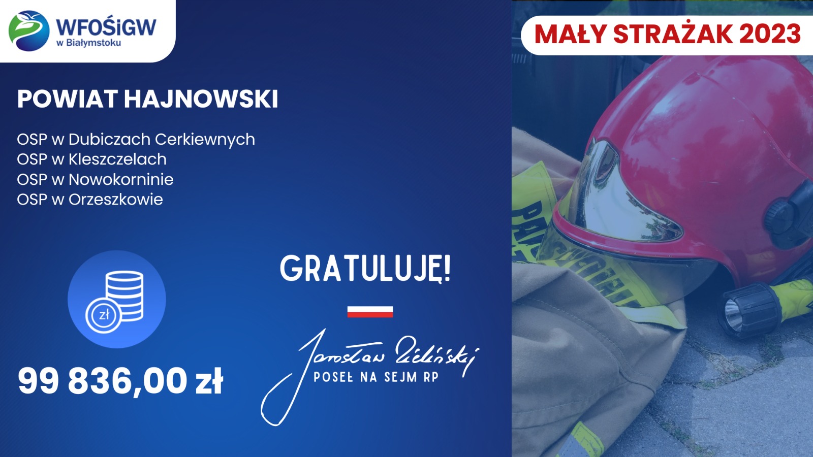 W 2023 roku dofinansowanie otrzymały cztery jednostki z powiatu hajnowskiego o łącznej kwocie w wysokości 99 836,00 zł. z przeznaczeniem na zakup: