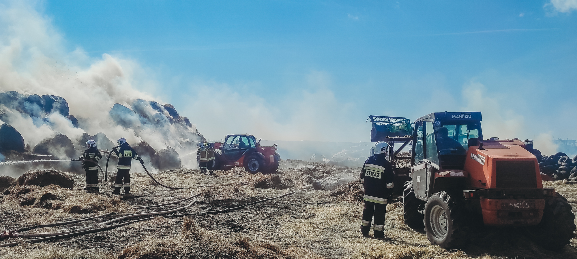 Po przybyciu na miejsce zdarzenia pierwszych zastępów straży pożarnej ustalono, że pożarem objęte są bele ułożone w stos o powierzchni ok. 500 m2 i wysokości ok. 7 m. Działania zastępów polegały na zabezpieczeniu miejsca zdarzenia oraz podaniu prądów wody na palące się bele. W działaniach pomocy udzielił właściciel gospodarstwa rolnego, w którym miał miejsce pożar oraz właściciele innych okolicznych gospodarstw rolnych, poprzez wywożenie ciągnikami rolniczymi oraz ładowarkami teleskopowymi bel z płonącego stosu.
