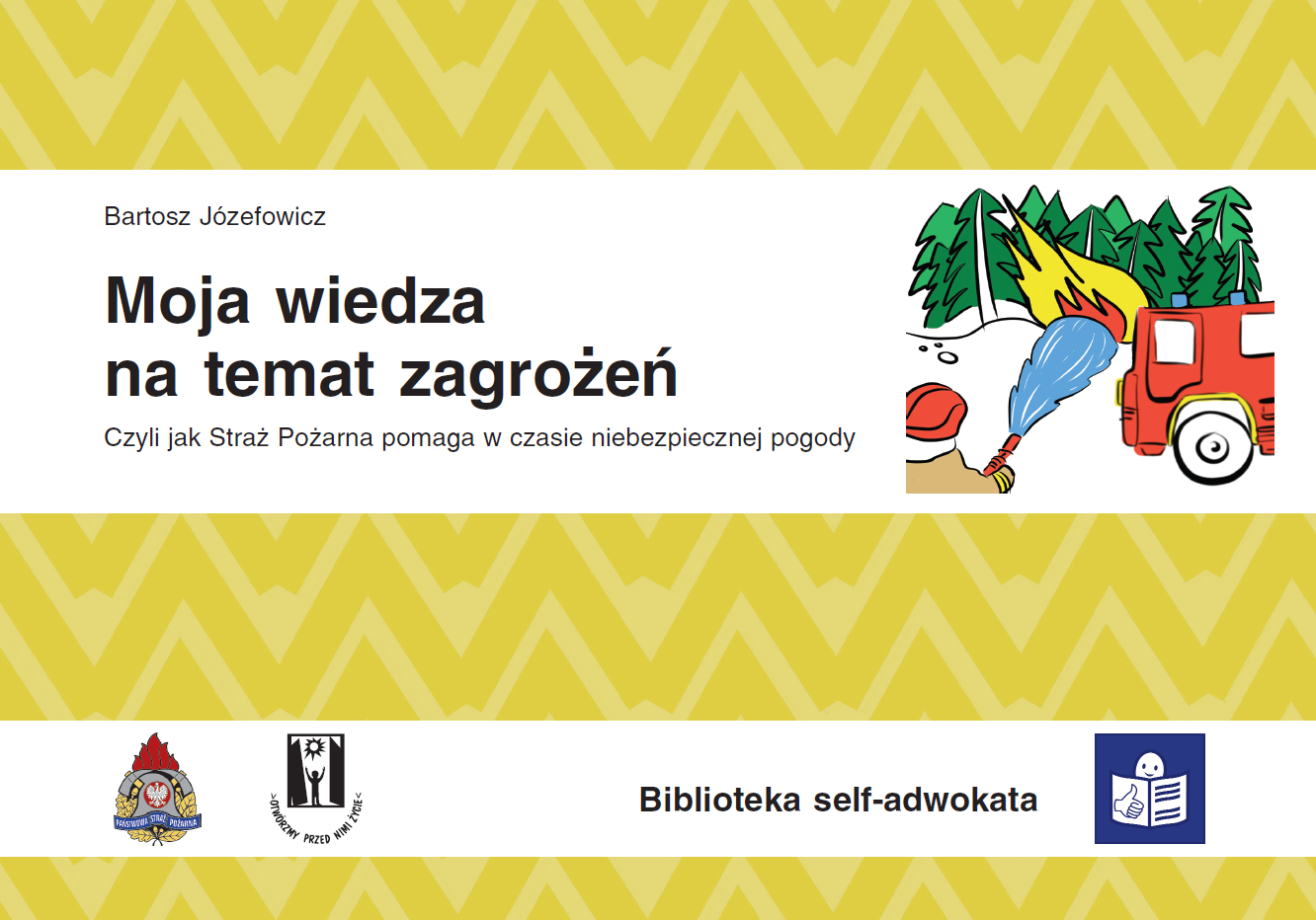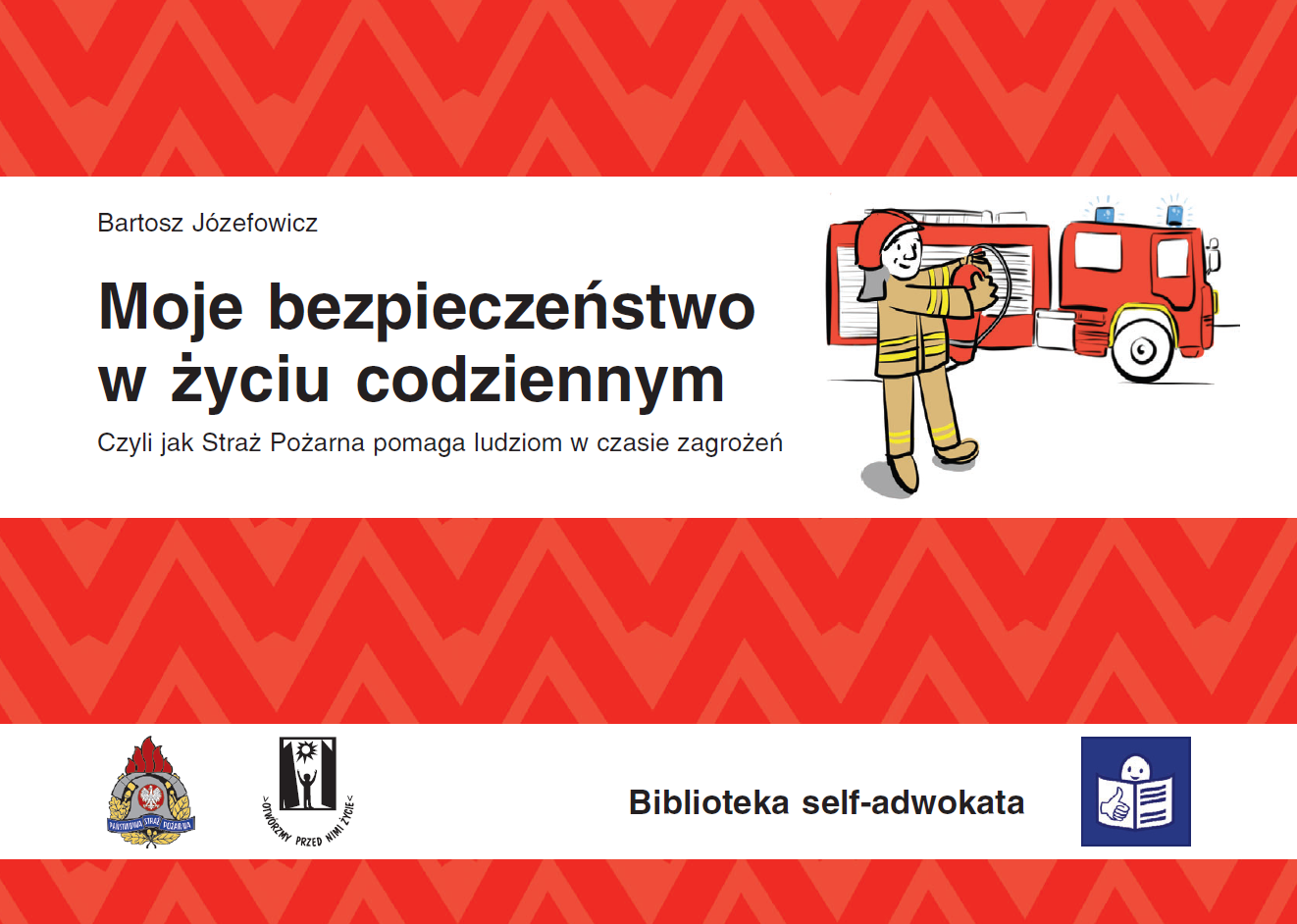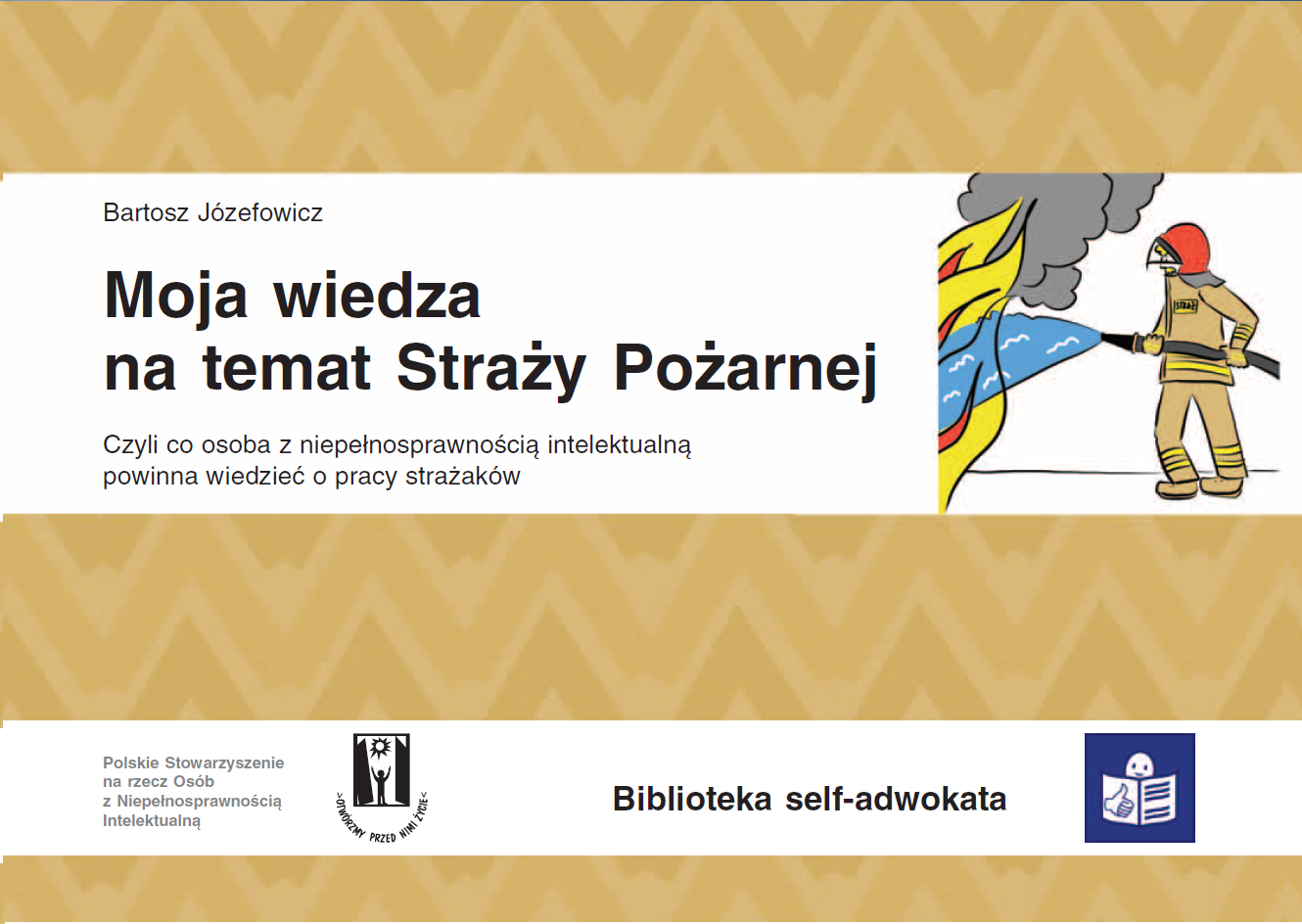 - „Moja wiedza na temat Straży Pożarnej. Czyli co osoba z niepełnosprawnością intelektualną powinna wiedzieć o pracy strażaków”. W książeczce znajdziemy odpowiedzi na pytania co to jest straż pożarna, kim jest strażak zawodowy i strażak ochotnik, kto pełni służbę w straży pożarnej, kto może zostać strażakiem, jak wygląda ubranie strażaka, kiedy wezwać straż pożarną i w jaki sposób.