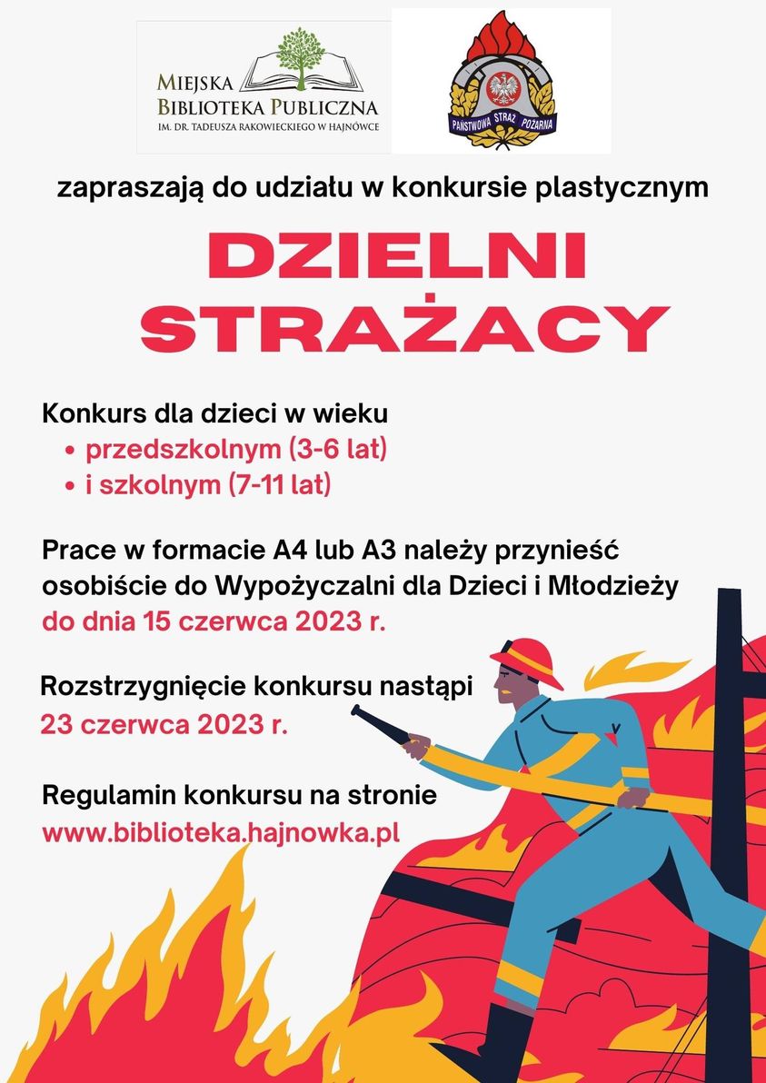 Miejska Biblioteka Publiczna im. dr. T. Rakowieckiego w Hajnówce oraz Komenda Powiatowa Państwowej Straży Pożarnej w Hajnówce zapraszają do udziału w konkursie plastycznym „Dzielni strażacy”.